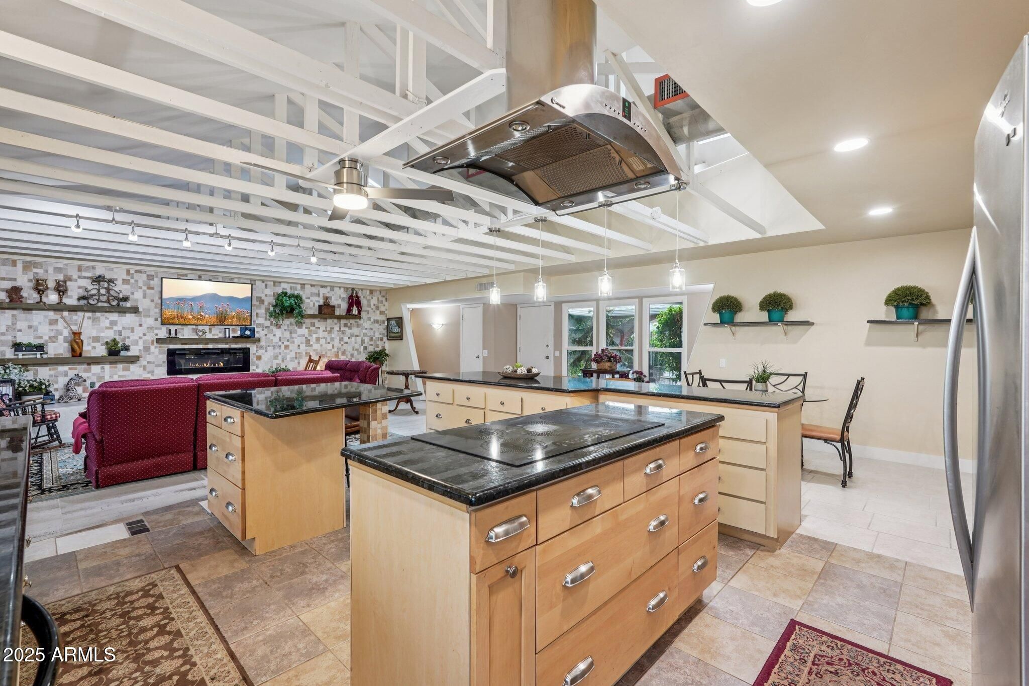 This beautifully updated golf course home is a true standout in Sun City, perfect for the artistic soul seeking a truly one-of-a-kind custom home. Located on a premium lot with 65 feet of fairway views, this home features an exposed beam ceiling, open-concept living, and thoughtfully upgraded spaces throughout. The custom kitchen is a chef's dream with three separate islands, granite countertops, abundant cabinetry, lower drawers, a double wall oven, induction cooktop, and cozy dining nook. Enjoy spacious living and entertaining areas, a dedicated office or craft room, and a bonus room lined with sliding glass doors — perfect for taking in the views and fresh air. The serene owner's suite offers private patio access, dual closets, a luxurious jetted soaking tub for two, and a natural stone walk-in shower. Both bathrooms are fully wheelchair accessible. Additional upgrades include a 2019 A/C, 2019 roof. All of this in Sun City, Arizona, a top-rated 55+ community with 8 golf courses, 7 recreation centers, pools, fitness facilities, and 130+ clubs. Live the active lifestyle you've been dreaming of golf, swim, play, and relax in the Arizona sunshine!