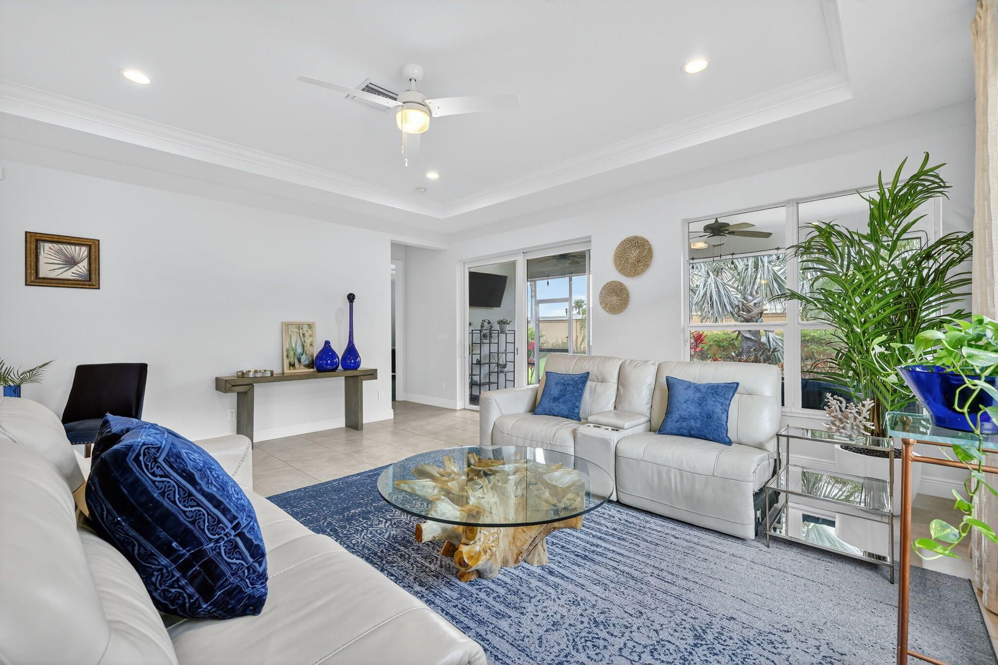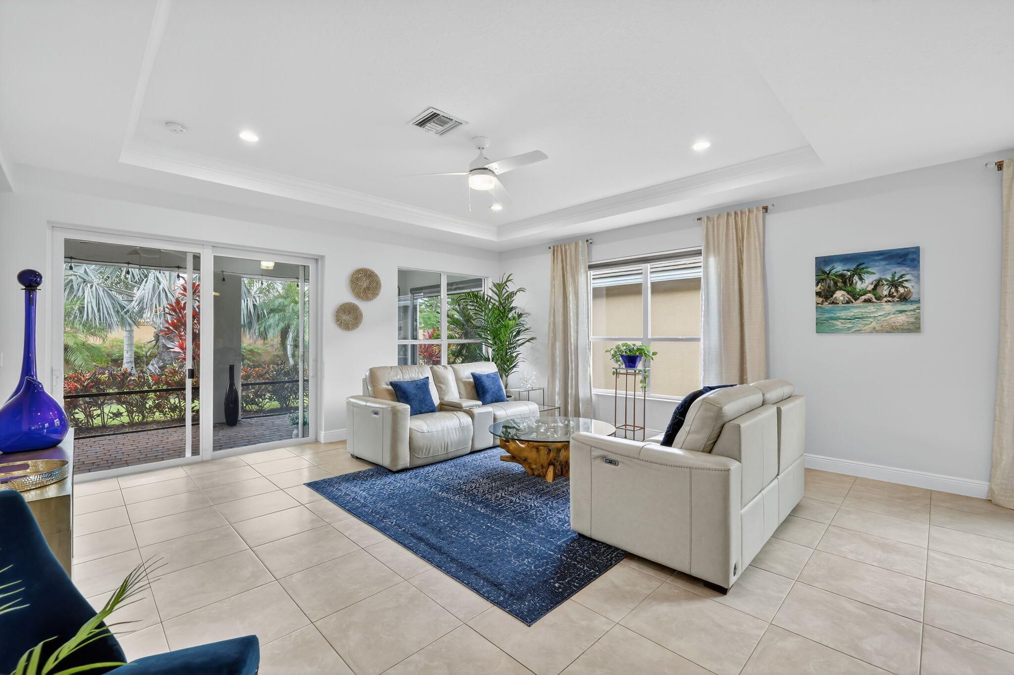 Reduced $50,000! Model-perfect true 3-bedroom, 2-bath home offering 2,262 sq. ft. of beautifully designed living space. The spacious eat-in kitchen features upgraded countertops, center island with breakfast bar, dual wall ovens, gas range, and a walk-in pantry—ideal for cooking and entertaining. The great room showcases elegant coffered ceilings and sliding glass doors that open to the covered lanai complete with an electric roll-down shade. Enjoy a private backyard with no neighbors behind, plus hurricane impact glass throughout for year-round security and peace of mind. The primary suite offers coffered ceilings, a massive walk-in closet, and a stunning remodeled bathroom featuring a large walk-in shower and double vanities. Located in Vitalia at Tradition, a premier 55+ active lifesty
