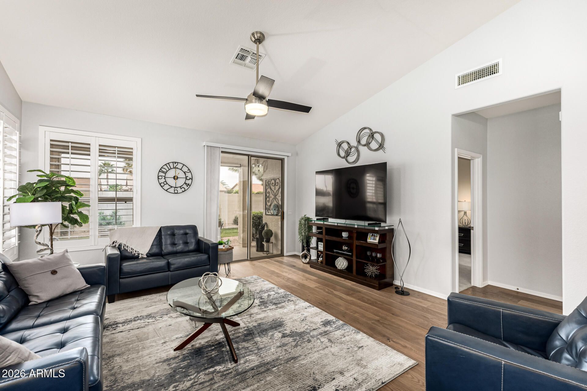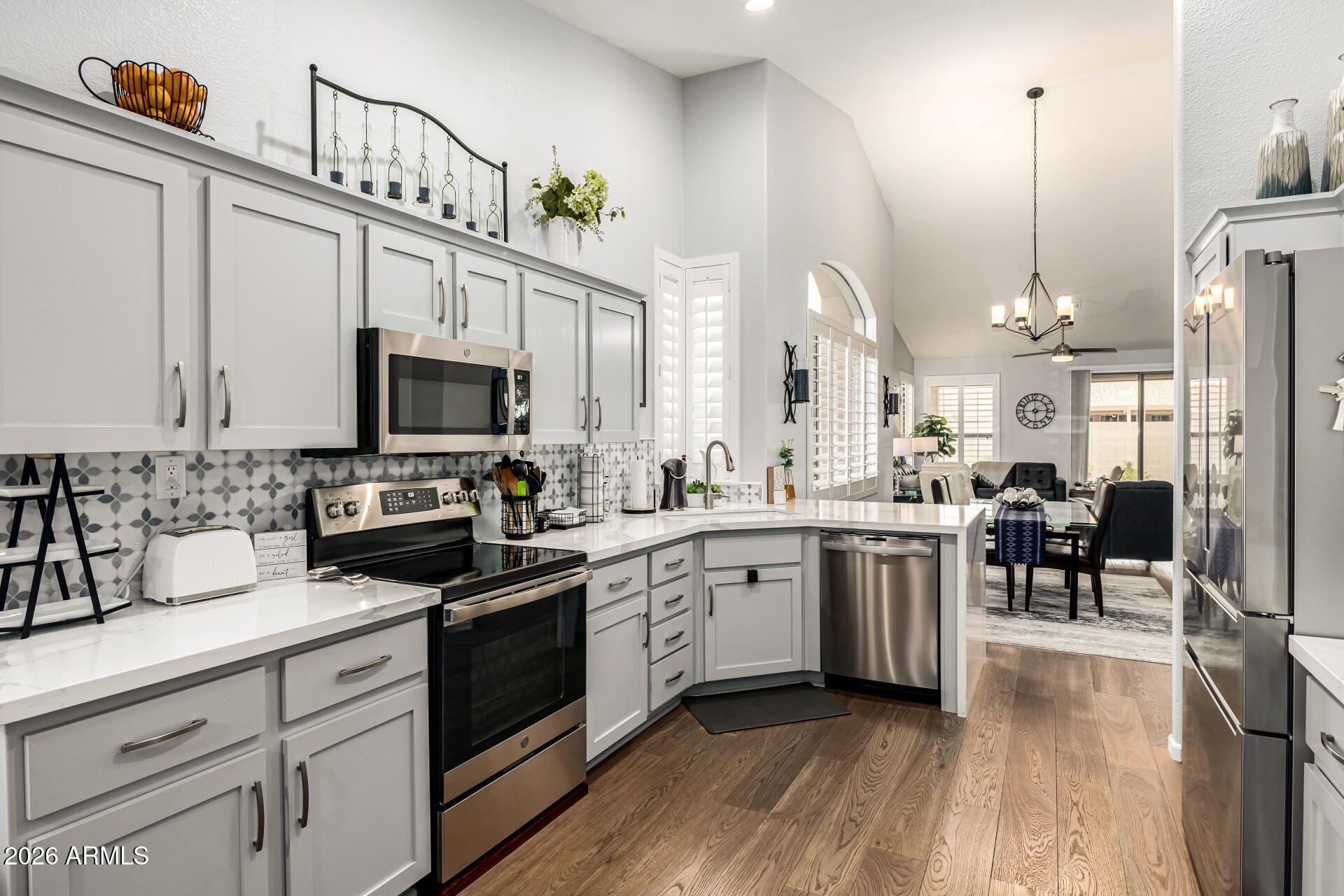 New Roof underlayment and gutters in 2025! Experience resort-style living in the desirable 55+ Sun Lakes community! This beautifully maintained 2‑bed, 2‑bath home offers charming curb appeal, mature landscaping, and a 2‑car garage with built‑in storage. Inside, enjoy plantation shutters, vaulted ceilings, abundant natural light, real wood flooring in main areas, and plush bedroom carpet. The open layout features a stunning kitchen with stainless appliances, quartz counters, designer backsplash, and a cozy breakfast nook. The spacious primary suite includes dual quartz vanities and a walk‑in closet. Relax on the covered patio overlooking a lush greenbelt with exceptional community amenities nearby. PLUS! Sun Lakes provides a wide range of resort-style amenities, including golf courses, tennis & pickleball courts, heated pools, fitness centers, and scenic walking paths. Residents also enjoy elegant clubhouses, on-site dining, hobby rooms, and a full calendar of clubs, classes, & social events. All these features come together to create an active, vibrant lifestyle in a beautifully maintained community. Don't miss this opportunity!
