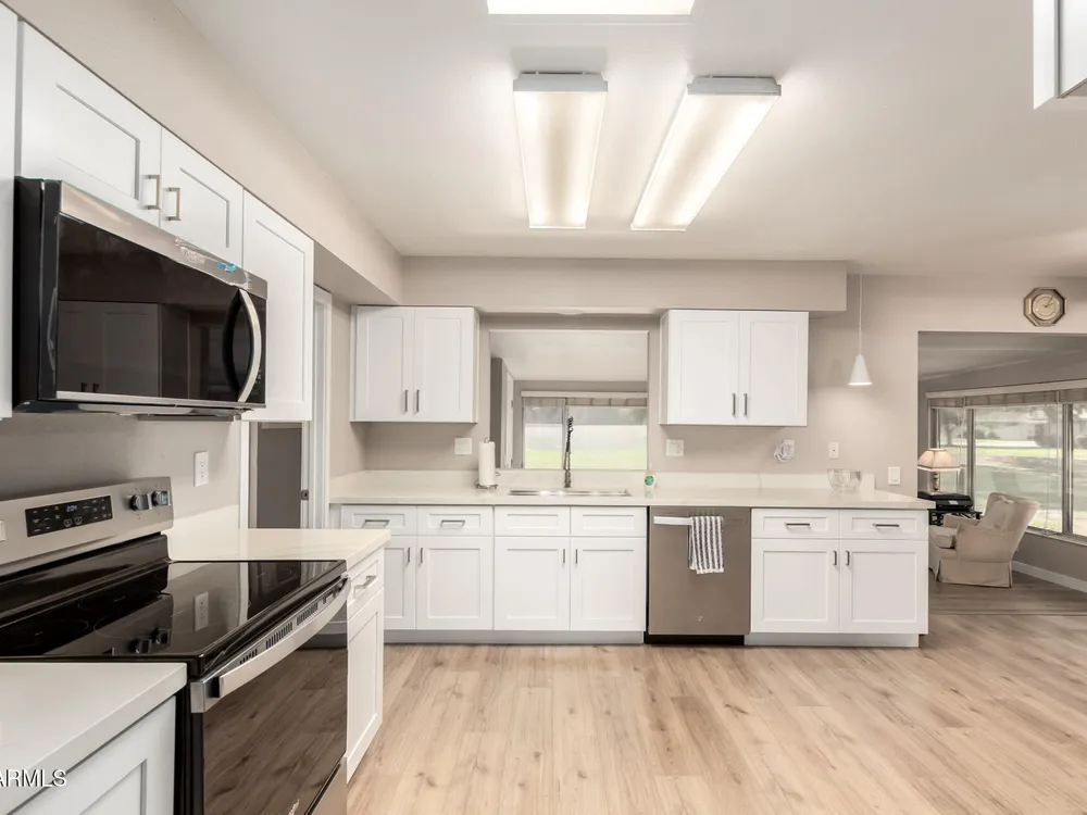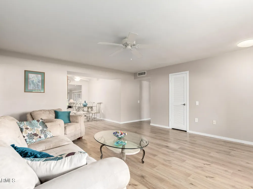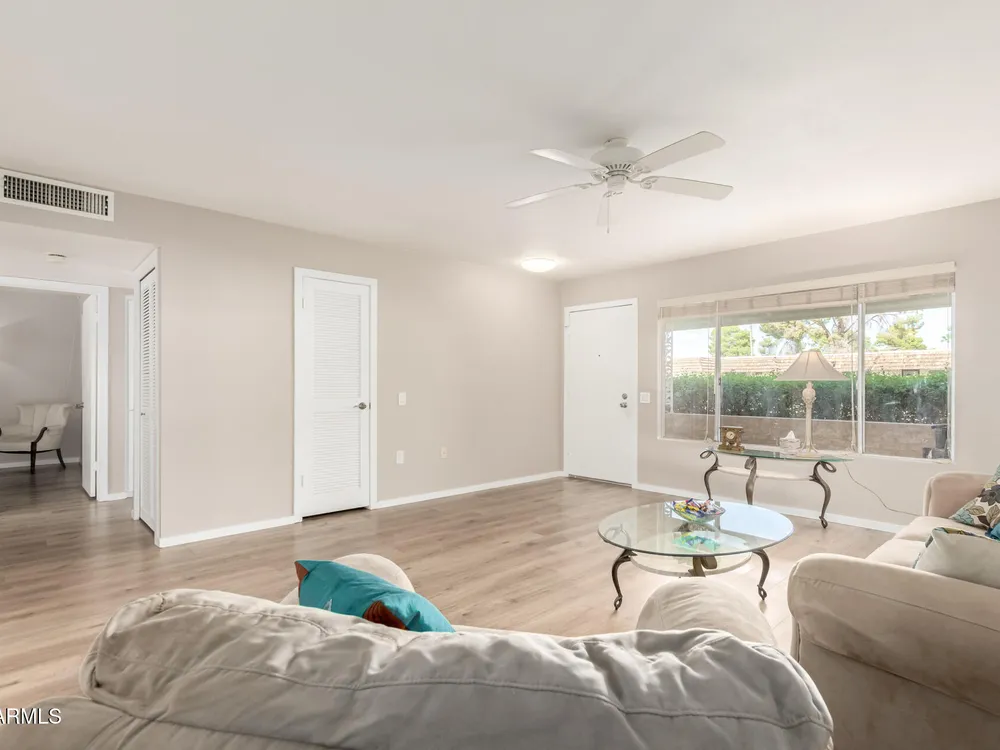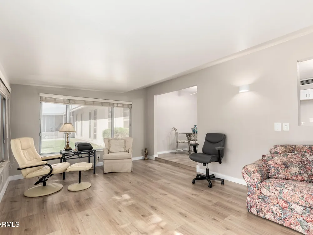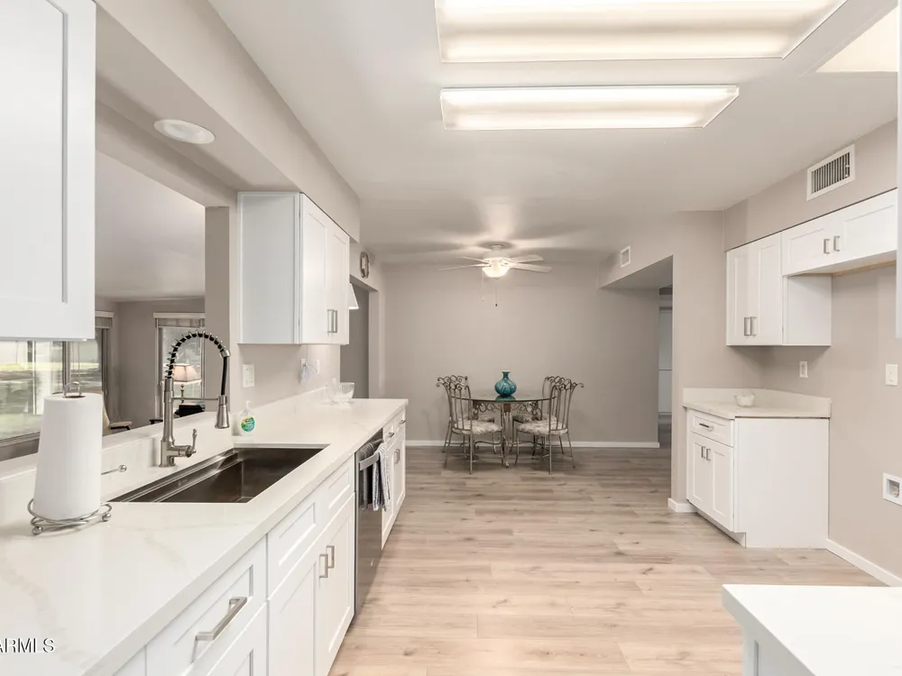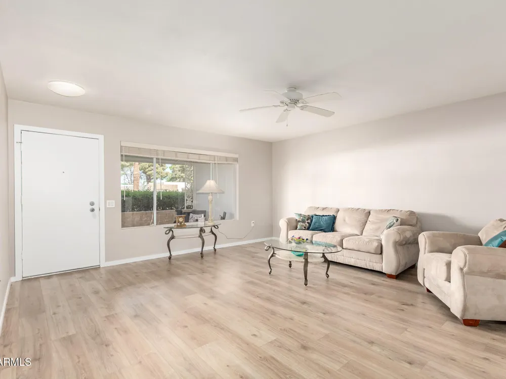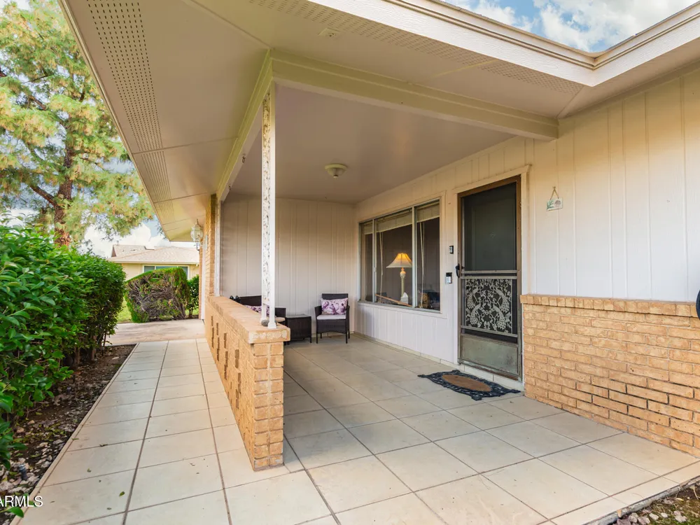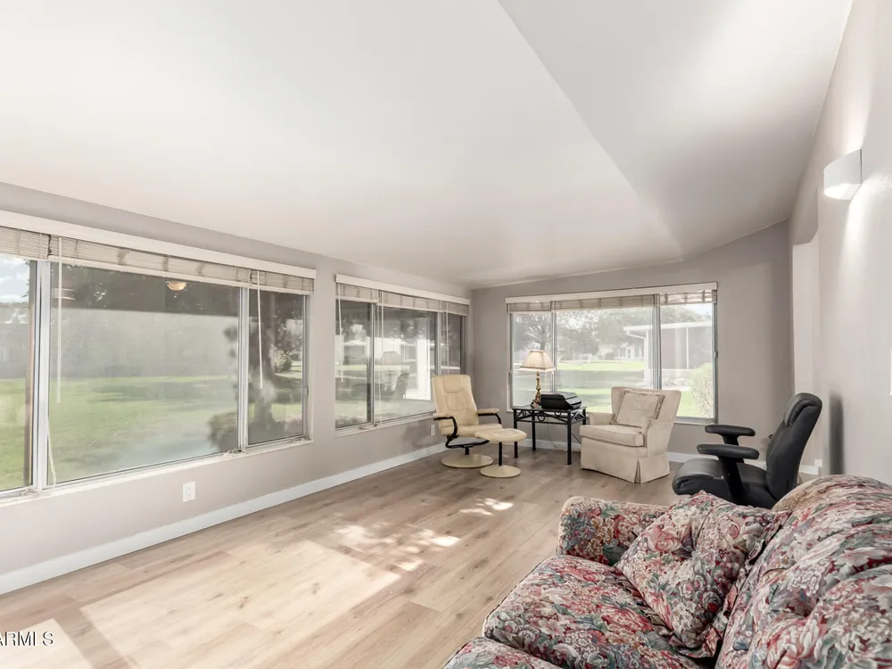 Experience easy living and charm in this newly updated Gemini/Twin home, perfectly situated in the heart of Sun City! Just moments from the Palm Brook Country Club golf course, this 2-bedroom, 2-bath residence offers over 1,500 sq. ft. of comfortable, thoughtfully designed living space and an attached one-car garage. The bright kitchen features generous cabinet storage, while the spacious living and dining areas provide a welcoming setting for everyday living or entertaining. Retreat to the comfortable primary suite with its private en suite bath, or unwind on the peaceful covered front patio—ideal for enjoying Arizona's sunshine. The property also features beautiful citrus trees maintained by the HOA, ensuring you can enjoy their charm without the upkeep. Additional highlights include an indoor laundry area, single-car garage, and access to Sun City's world-class amenities, including golf, recreation centers, pools, and a variety of social clubs.