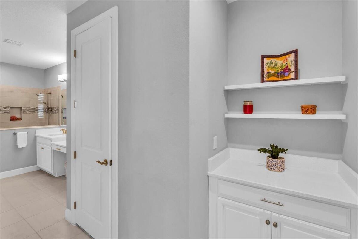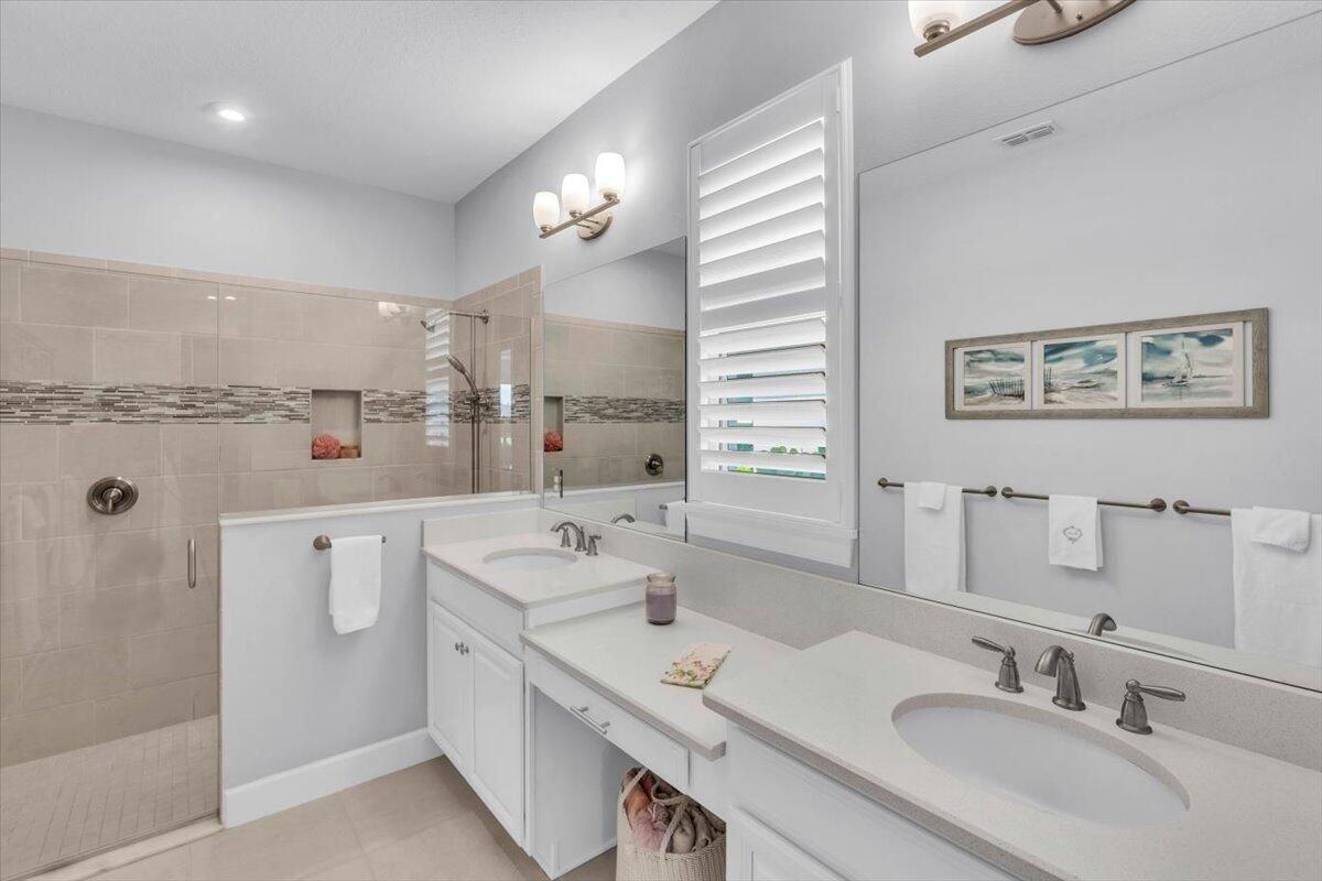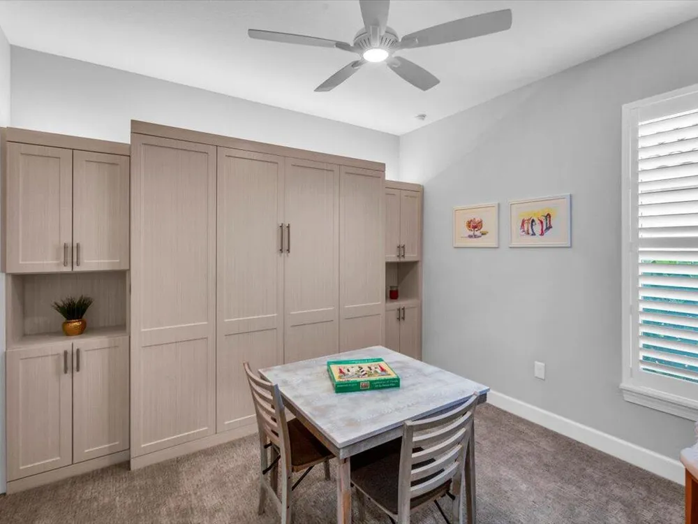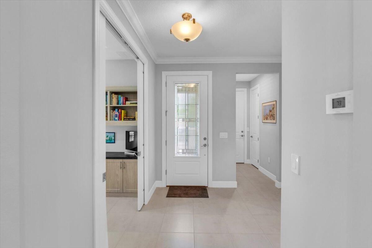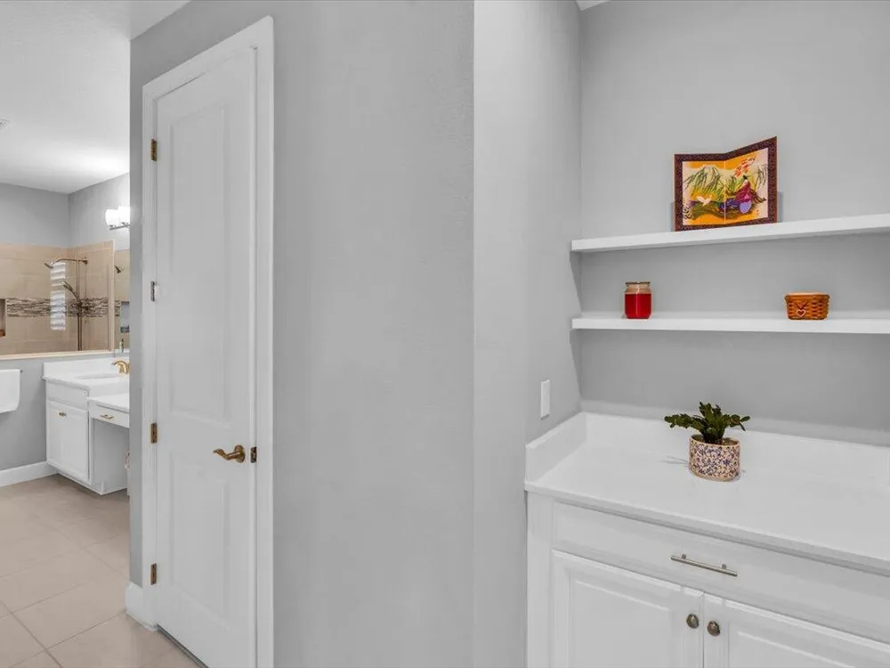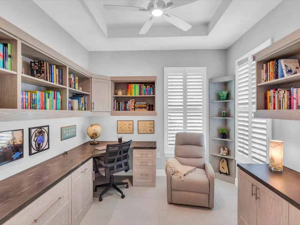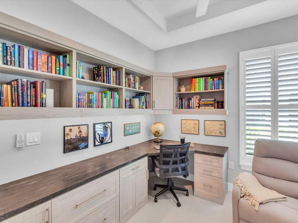 - Closet Cabinetry, Cathedral Ceiling(s), Entry Level Living Area, Entrance Foyer, Kitchen Island, Pantry, High Ceilings, Walk-In Closet(s), Home Office, Great Room, Kitchen/Dining Combo, Eat-in Kitchen, Blinds, Impact Glass, Plantation Shutters, Dual Sinks, Primary Downstairs, Separate Shower