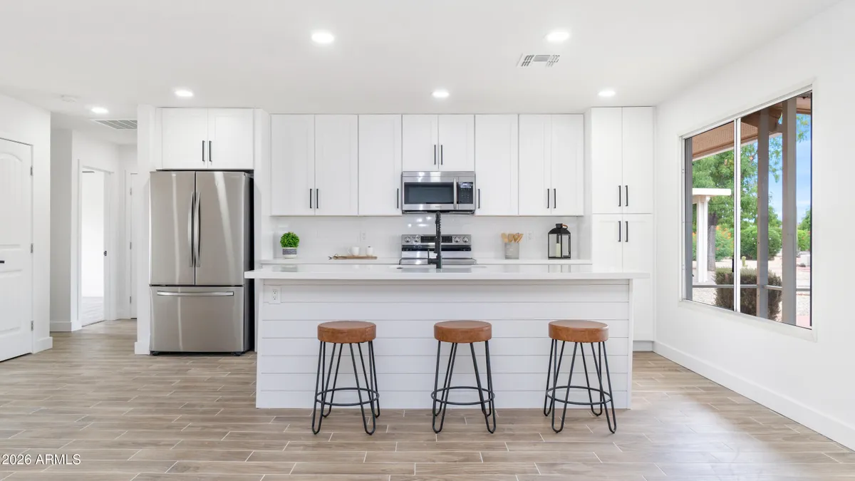 Welcome to one of the best remodeled homes in Sun City. Fully transformed in 2023, this move-in-ready residence showcases a modern, cohesive design with quality upgrades throughout. The inviting entry leads into a stunning kitchen featuring all-new cabinetry, white quartz countertops, and stainless-steel appliances. New tile flooring, baseboards, doors, fresh texture, and interior paint elevate the home with a clean, contemporary finish. Both the primary and guest bathrooms have been completely remodeled, creating a spa-like feel. With a spacious, flexible layout, this home offers the perfect opportunity to personalize and enjoy. Rarely does a remodel of this caliber come to market in Sun City—this one truly stands out.