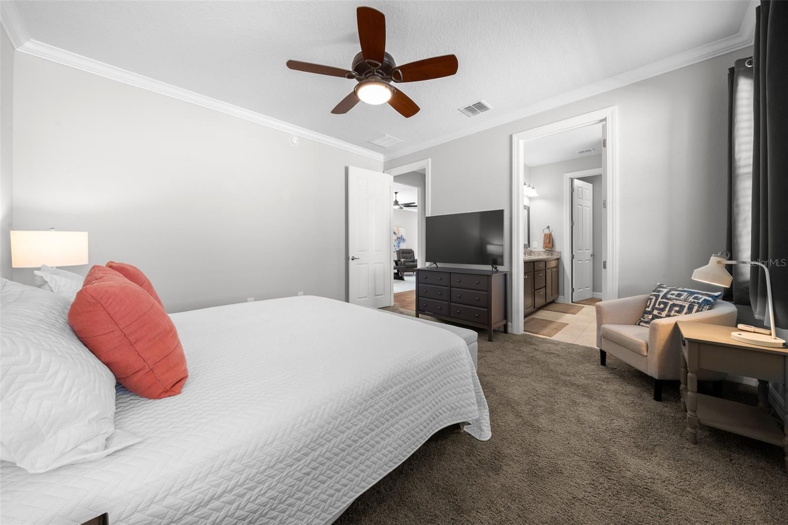 - Ceiling Fan(s), Crown Molding, Eat-in Kitchen, High Ceilings, In-Wall Pest Control, Open Floorplan, Main Level Primary, Solid Surface Counters, Solid-Wood Cabinets, Split Bedrooms, Thermostat, Walk-In Closet(s), Window Treatments