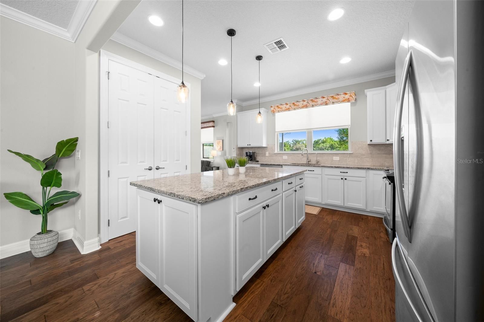 Welcome to this stunning and spacious Taft Street model situated in this active 55+ Del Webb Stone Creek subdivision. This home features 2 bedrooms, a Flex Room, 2 bathrooms, and a 4-foot extended 2-car garage. The open-concept layout fosters a warm and welcoming ambiance, enhanced by crown molding and 5 1/4" baseboards, along with engineered hardwood flooring, making it ideal for entertaining guests or simply unwinding. Upon entering the home, you will find a flex room to the left, complete with doors and windows. The living room presents a bright and airy space, equipped with a fan/light combination, transom windows, and two large windows that contribute to a cozy atmosphere. The dining room showcases upgraded lighting and provides the perfect setting. The upgraded kitchen is equipped with reverse osmosis, stainless steel appliances, 42-inch upgraded lighter cabinets, an oversized pantry, and generous granite countertop space. This home also includes a second living room area featuring large windows, modern fan/light combo & private views. The master suite is a spacious bedroom that includes a fan/light combination, a walk-in closet with built-ins, and an ensuite bathroom that boasts a walk-in glass shower, double vanity, and darker cabinets. The guest bedroom has ample space and privacy for visitors. Guest bathroom features a tiled shower with modern fixtures. Embrace Florida living in the inviting screened and roofed patio area, which features a paver courtyard with a privacy wall, allowing you to enjoy the views of the surrounding landscaping in private. Some additional features: epoxied garage floor, water softener, sliding garage screens, rain gutters and rock beds around the perimeter. To allow more time to enjoy your home without too many chores, included in your HOA Fee is Lawn, shrub and tree maintenance, Irrigation system maintenance & repair, Water for lawns and landscaping and amenities. Stone Creek is an active community which offers a fitness center, spa, basketball, dog park, pickle ball, softball, tennis, heated resort-style pool, indoor pool, pool tables, walking & bike paths, catch & release fishing pier. For additional fees a golf course, grille and cafe' is on site. Don't miss out on the opportunity to own this stunning home, schedule your showing today! In addition, Separate from the contract is a turnkey option to purchase the home as you see it all you need is your toothbrush and clothes!