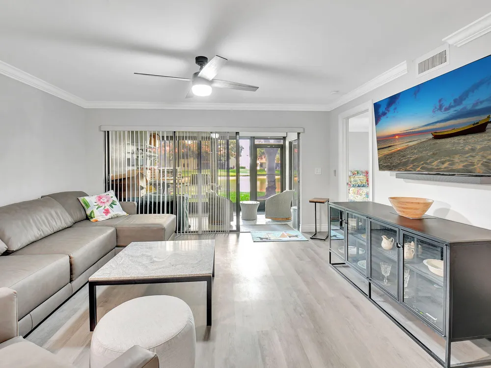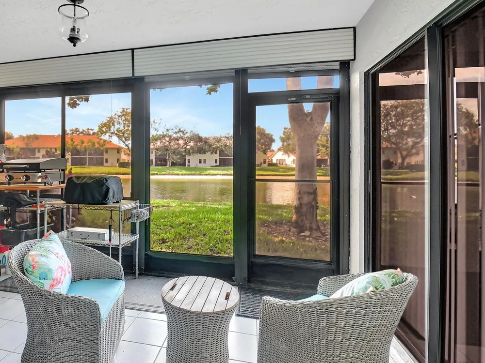 Stunning and completely renovated first floor condo with tremendous kitchen, bonus two walk in closets,High end appointments and both a screened covered patio and an outdoor patio! Water views in front and back. Could add a closet to make 3 bedrooms or keep the oversized office. Low fee with a COA that includes almost everything! Grills allowed on outside space only first floor units have this!