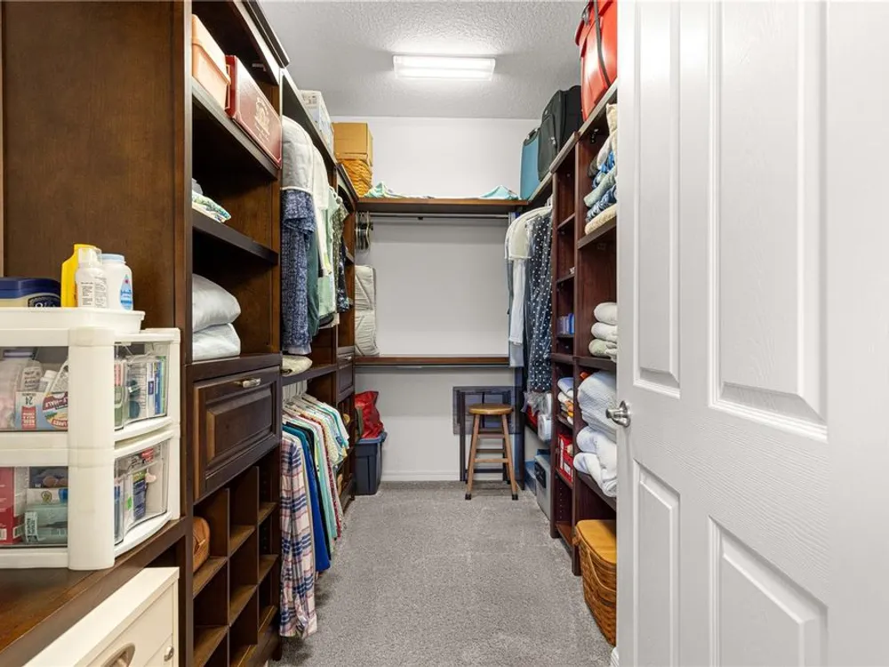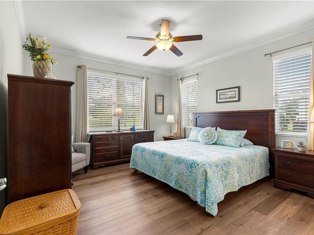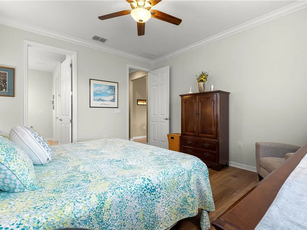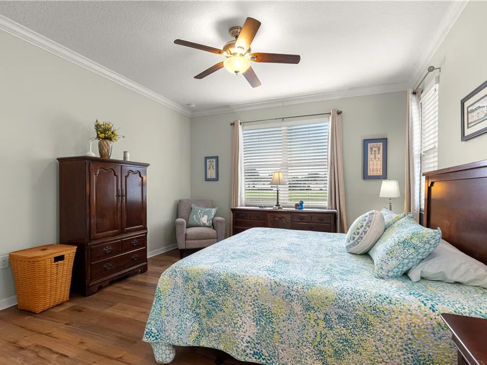 - Attic Ventilator, Ceiling Fan(s), Crown Molding, High Ceilings, Kitchen/Family Room Combo, Open Floorplan, Main Level Primary, Solid-Wood Cabinets, Split Bedrooms, Stone Counters, Walk-In Closet(s), Window Treatments