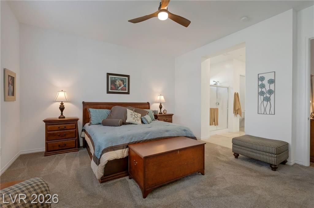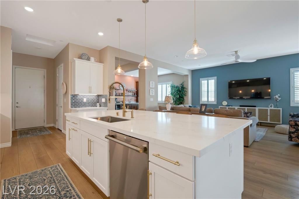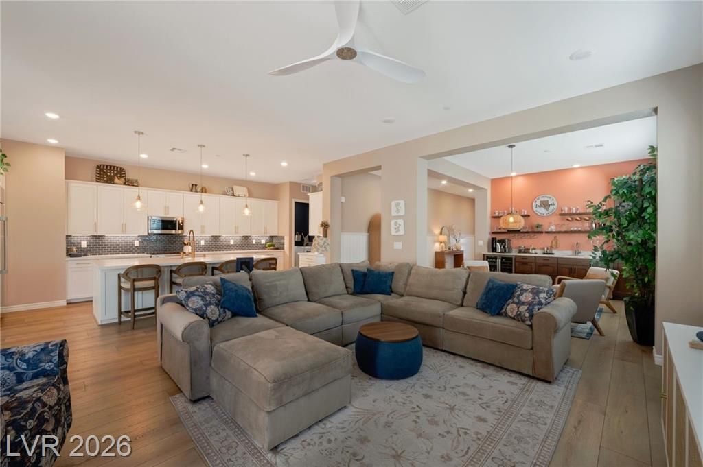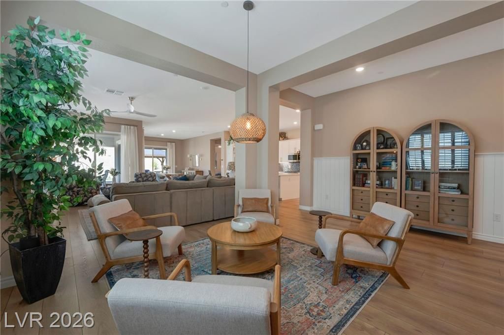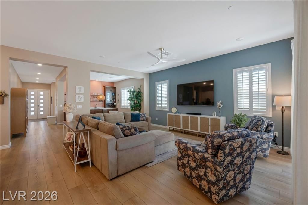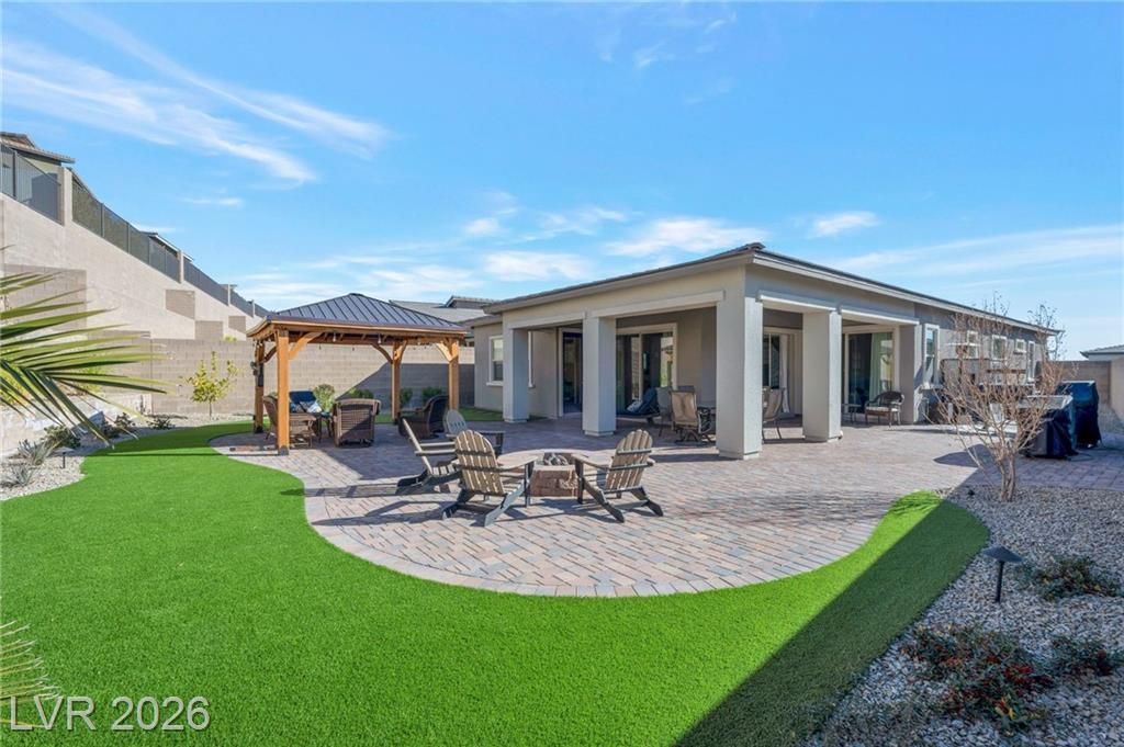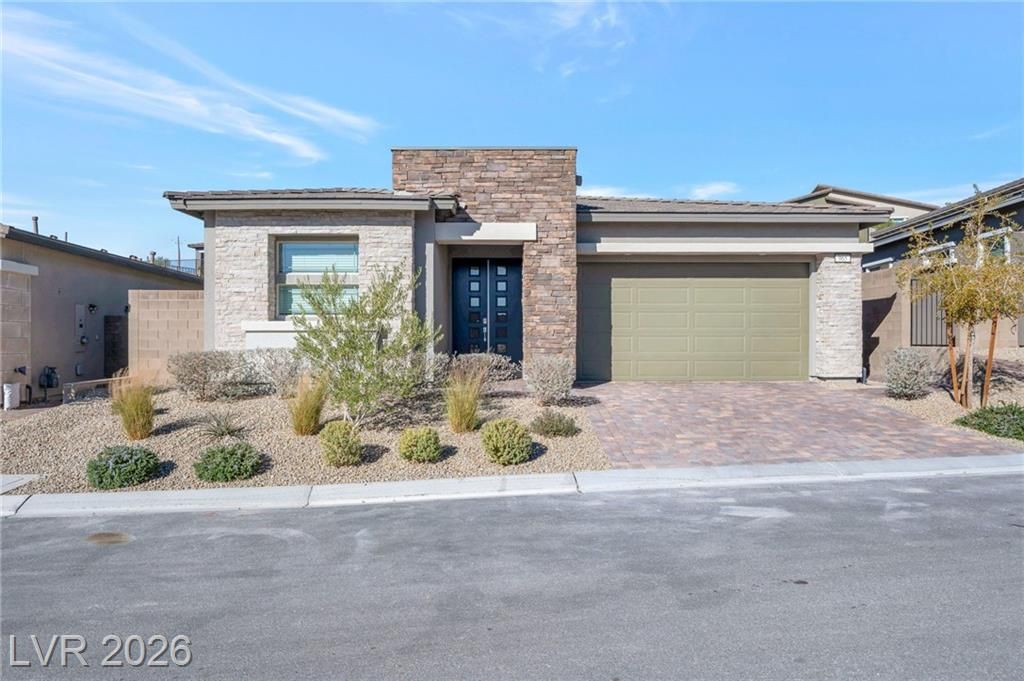 Abundant upgrades in this recently built, guard-gated, Heritage at Stonebridge home with an open floor plan featuring a den, living room, kitchen and dining room that make one awesome main living area. The den features a custom wet bar, wine refrigerator, cabinets and lighting. The kitchen features stainless-steel GE Monogram appliances, upgraded island with custom lights, upgraded backsplash, quartz countertops and upgraded cabinets with custom under cabinet lights. Ceiling fans are located in the living room and both bedrooms. The owner's suite features an adjoining primary bath with quartz countertops and dual sinks as well as a walk-in closet which brilliantly leads to the laundry room on the other side. An entertainer's backyard features a covered patio, gas fire pit, separate gazebo and custom desert landscaping. The garage features a fully operational EV charger and epoxy flooring. The 55+ community offers a gorgeous club house, pickleball courts, pools, hot tub and Strip views.