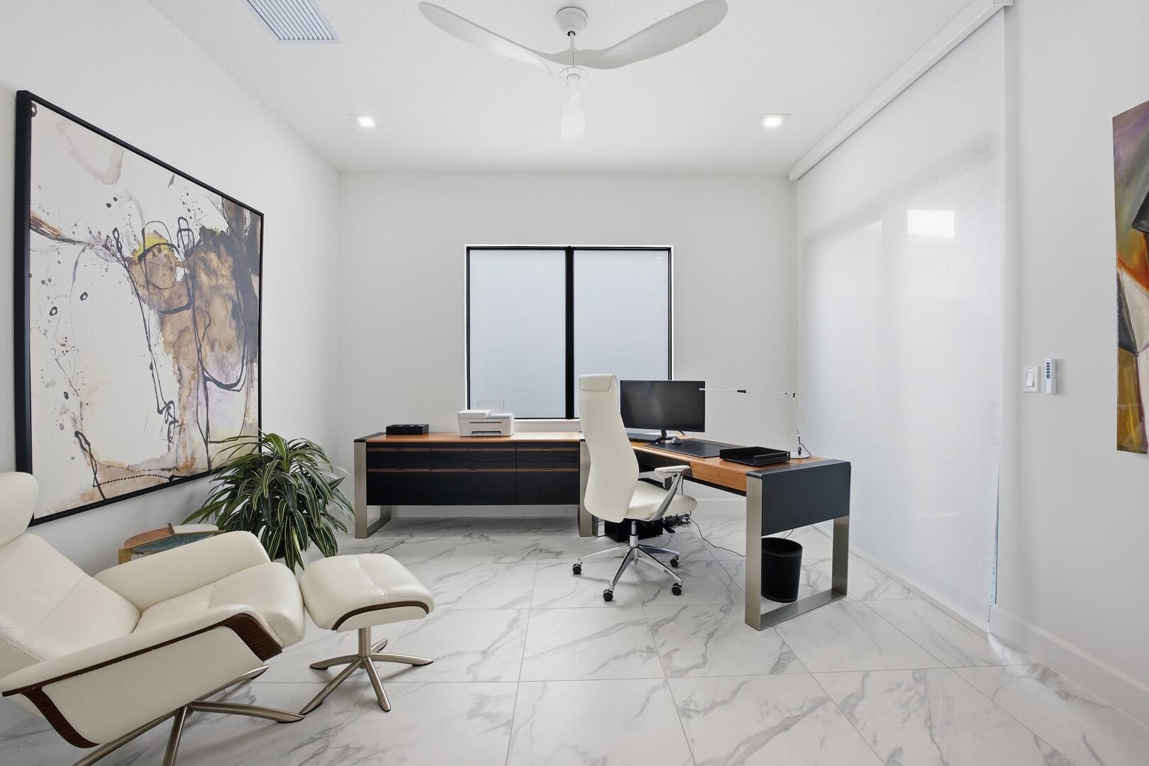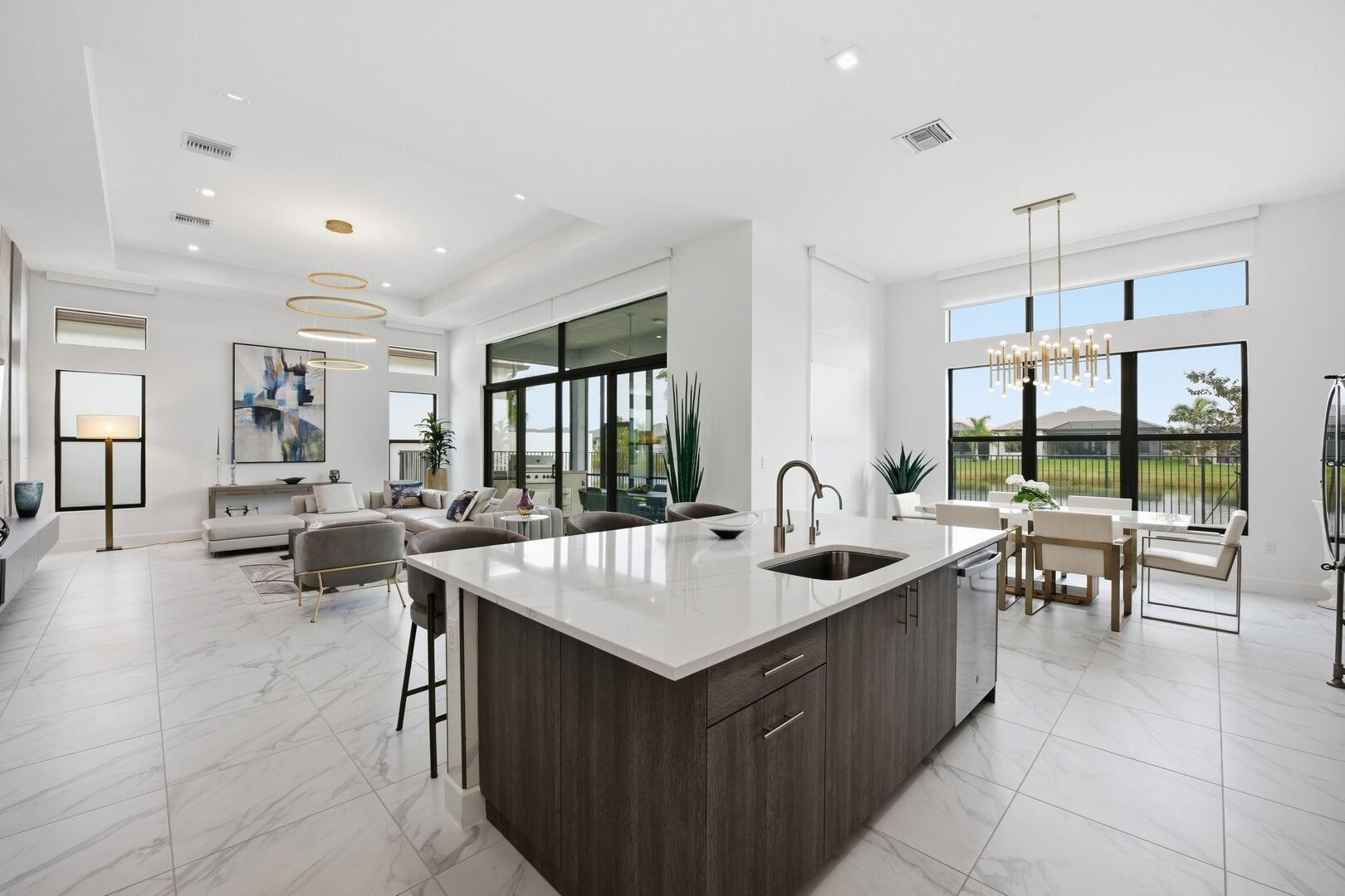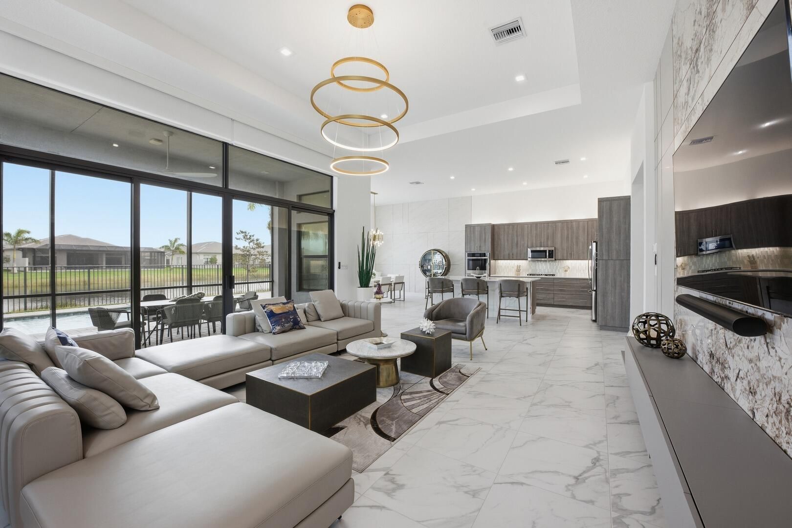 Experience elevated luxury in this impeccably designed 3-bedroom, 2.5-bath residence in Valencia Grand, created for refined living and seamless entertaining. A dramatic frosted-glass double-door entry opens to an inviting foyer, immediately highlighting the home's upscale details. The spacious great room showcases a coffered ceiling, abundant natural light, and a chic tiled accent wall, offering a bright, sophisticated atmosphere. The dream kitchen is a chef's delight, offering quartz countertops, a tiled backsplash, cabinetry with pull-outs and pot drawers, above-and-below cabinet lighting, a double oven, stainless steel appliances, a 6-burner gas stove, pantry, and a spacious snack bar. The primary suite is a serene retreat with dual custom walk-in closets, a spa-like bath with double quartz vanities, and a walk-in shower. The 3rd bedroom includes a slider to a private atrium. Additional highlights include smooth walls, 24-inch porcelain tile throughout, high-hat lighting, motorized shades, impact windows, and a whole-house water filtration system. Step outside to the screen-enclosed patio with outdoor speakers, a full outdoor kitchen, and a heated salt-water pool with sun deck, all overlooking a fenced yard with tranquil water viewsyour own private oasis.