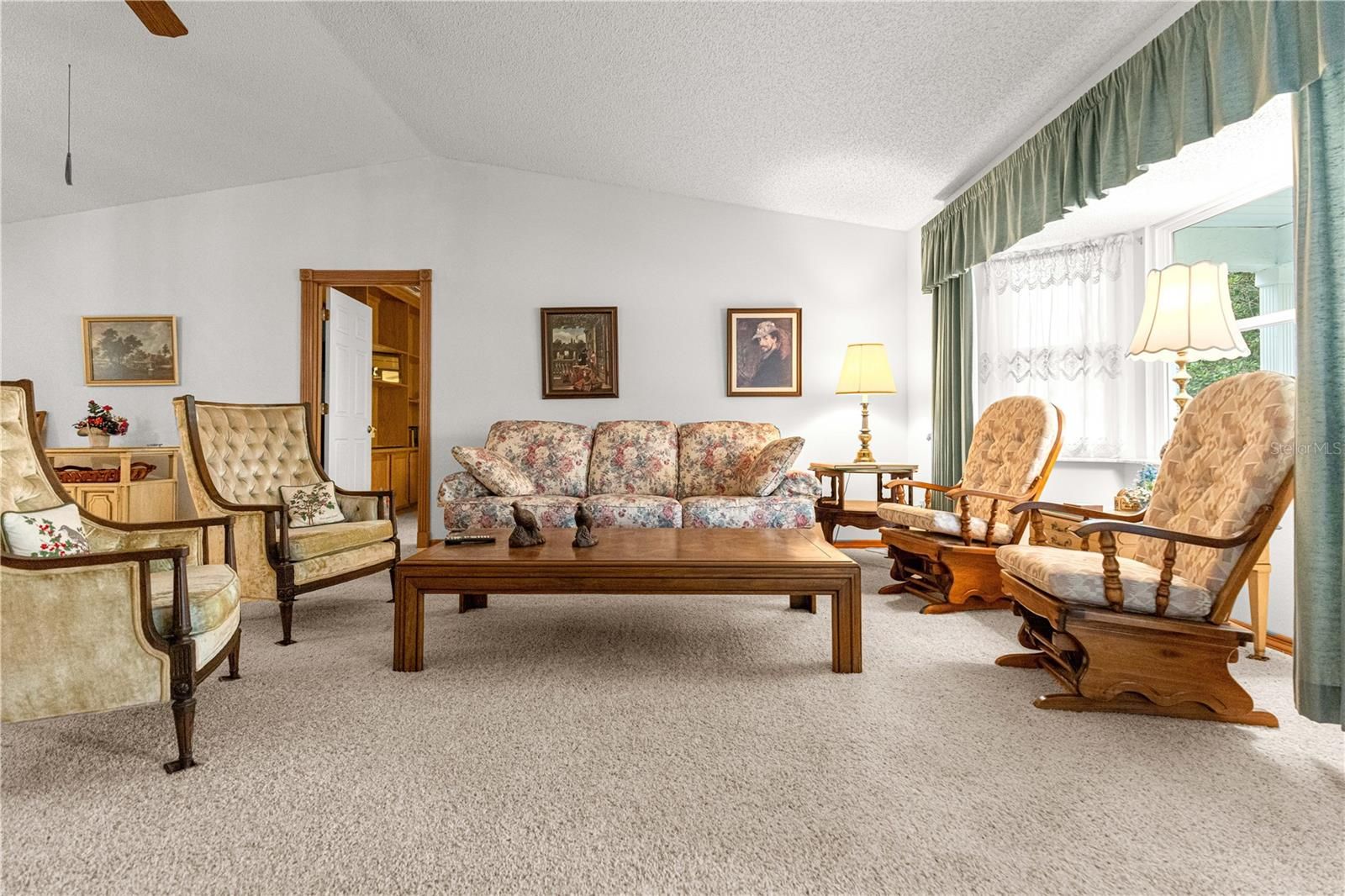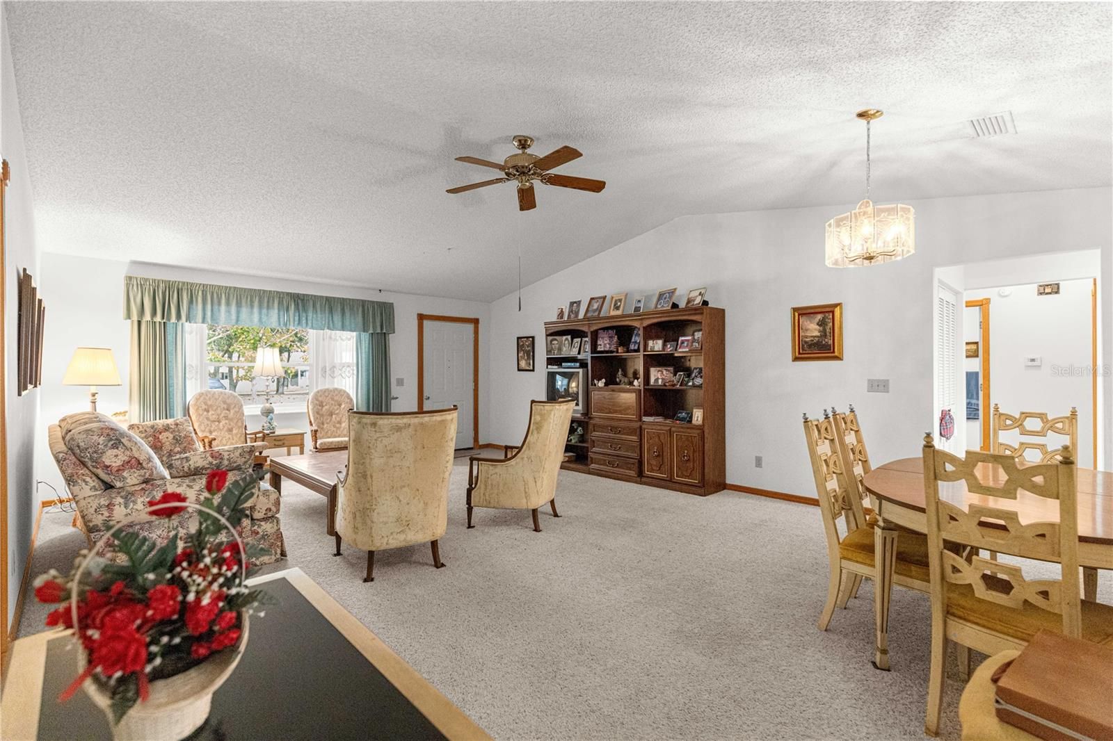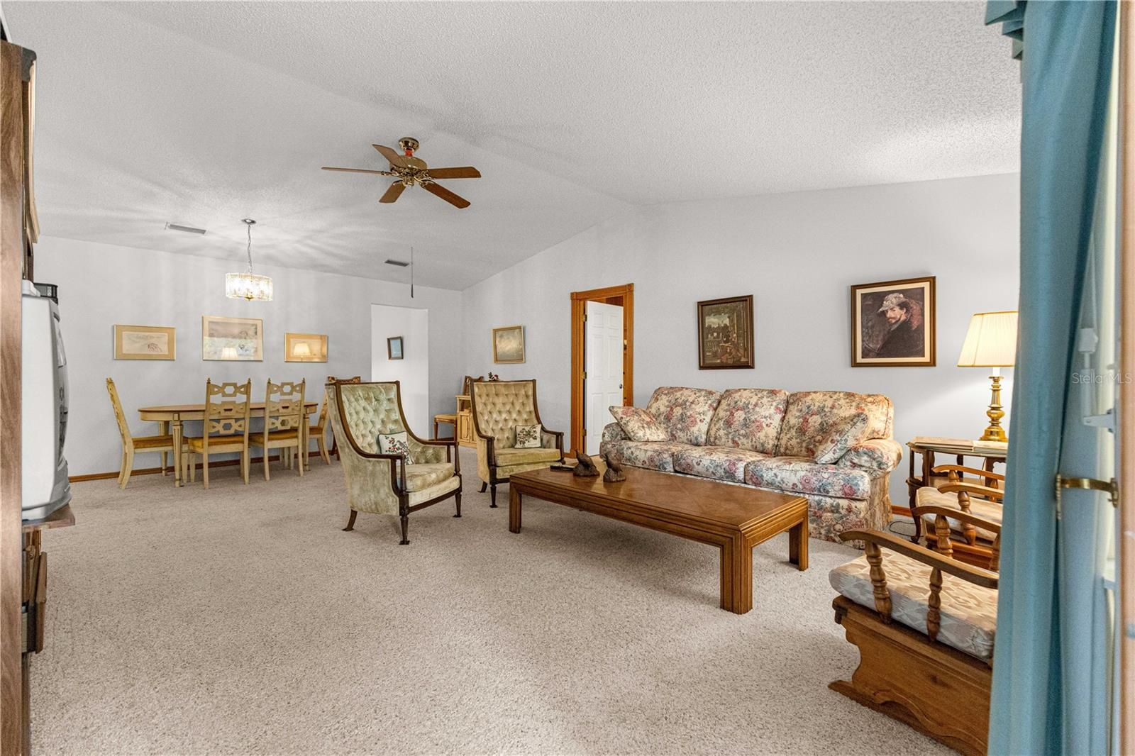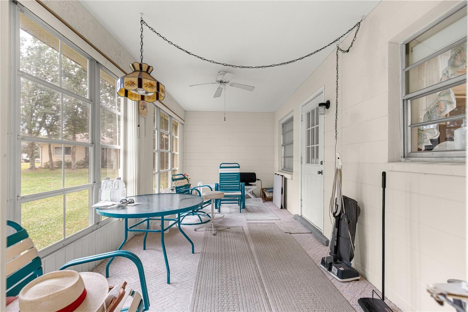 This Augusta model home is located in the premier 55+ community of On Top of the World. This home is an end unit featuring a nice lot, 2 bedrooms, 2 baths and a library/den with a 2 car garage. Roof scheduled to be replaced in 2026 (paid by seller) There is a nice sized front porch perfect for you morning cup of coffee. Upon entering you will notice the spacious living/dining combo with vaulted ceilings. The den/office space is to the right side with plenty of cabinets and shelves for storage. The eat-in kitchen is quite large with several cabinets and lots of counter space. There is an enclosed 3 season Lanai in the back and a concrete pad partially covered. Perfect for grilling and entertaining. The primary bedroom is generously sized, walk in closet, step in shower and new vanity. Guest side of the home has a nicely sized bedroom with walk-in closet and tub/shower combo in the bath. The 2 car garage also houses your washer and dryer.