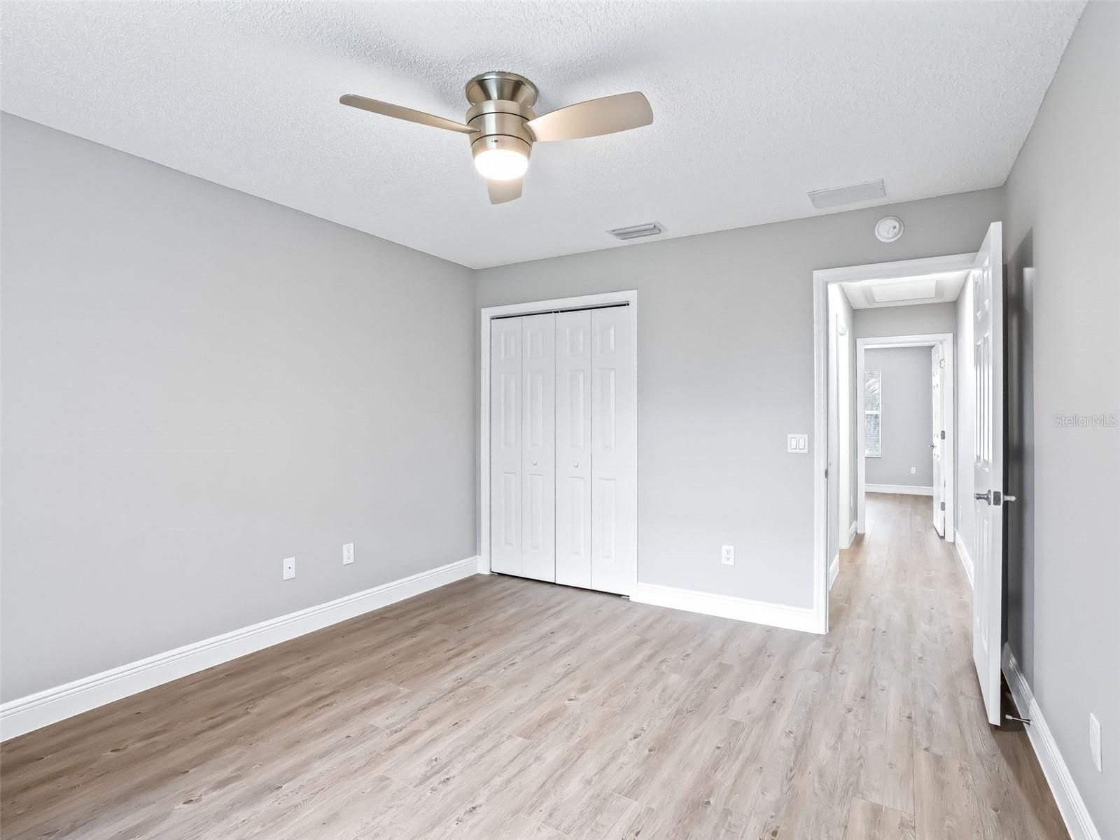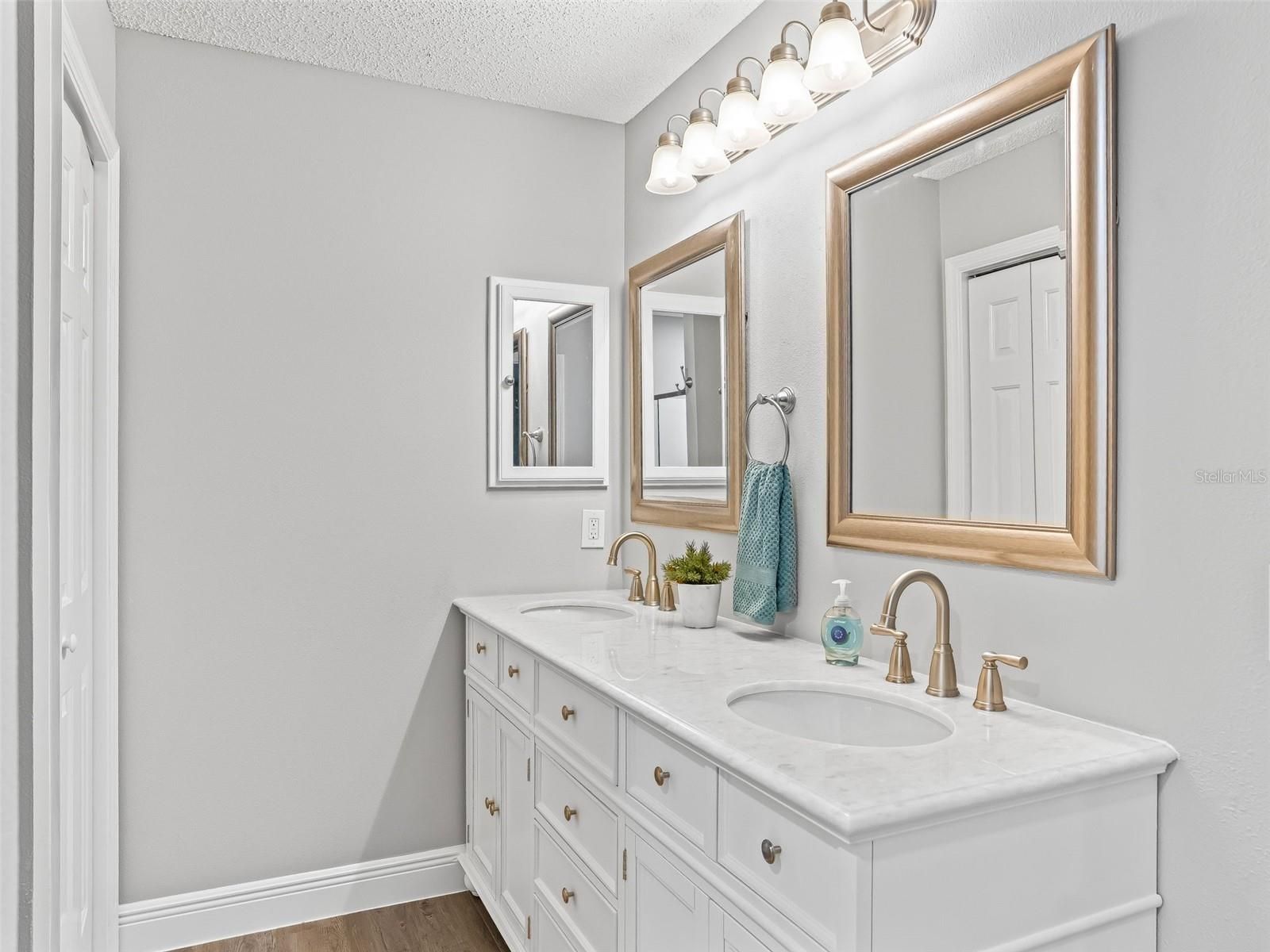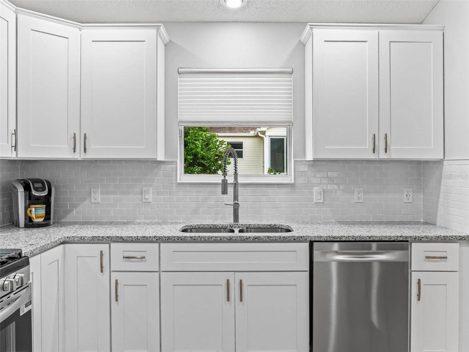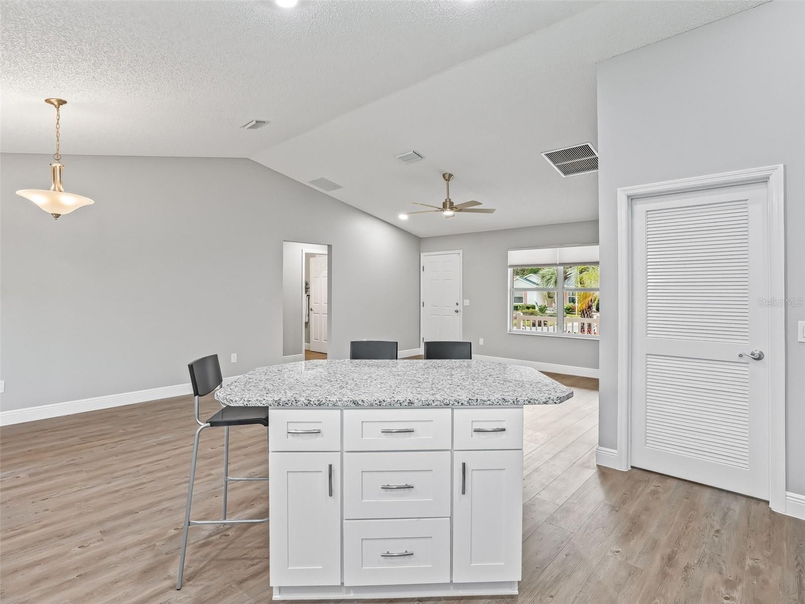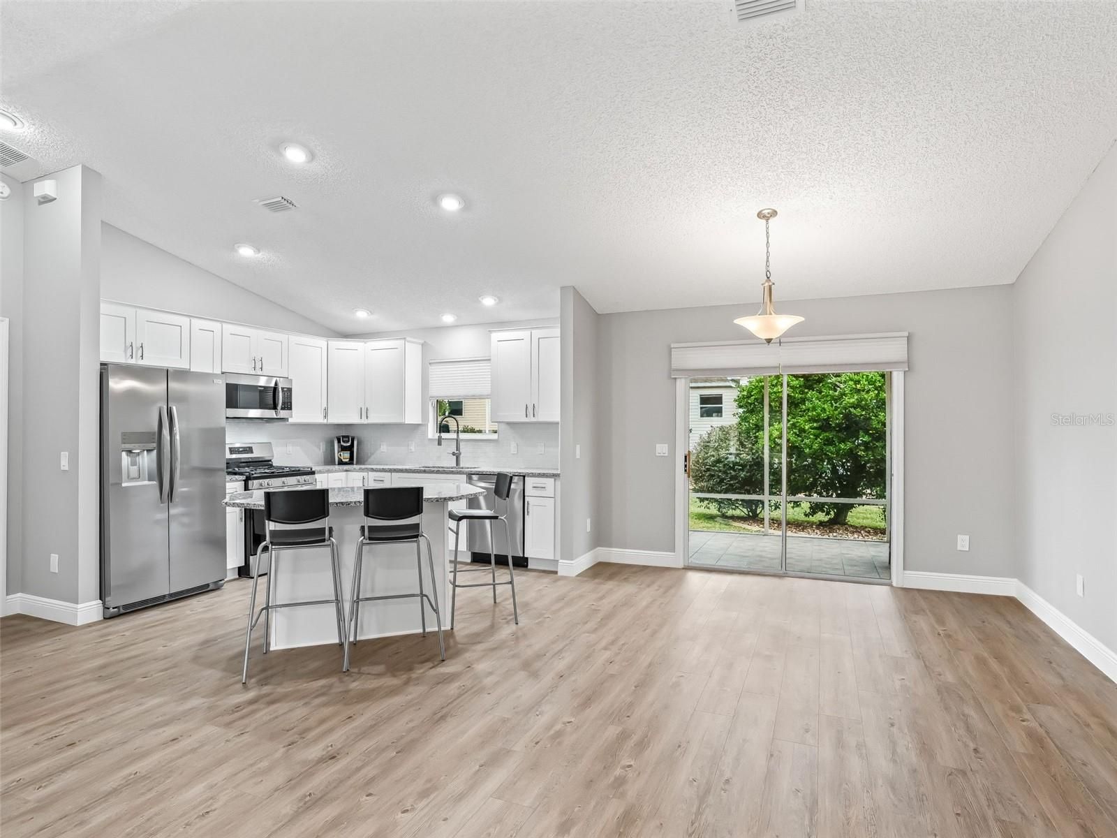 SPECTACULAR! Beautifully RENOVATED in 2025! This 3 Bedroom, 2 Bath home is located on a quiet cul-de-sac in the Woodbury neighborhood of The Villages. RENOVATIONS include: NEW - LUXURY PLANK FLOORS throughout, WHITE CABINETRY with SOFT CLOSE and CROWN MOLDING, STAINLESS STEEL APPLIANCES, GRANITE COUNTERTOPS, TILE BACKSPLASH, UPDATED LIGHTING, and a SPACIOUS BREAKFAST BAR. The OPEN FLOOR PLAN invites you to entertain and enjoy this newly appointed home. The INDOOR LAUNDRY ROOM features a NEW WASHER & DRYER and sits just off the kitchen for added convenience. The Primary Bedroom includes a WALK-IN CLOSET and a beautifully RENOVATED EN-SUITE BATHROOM with DUAL VANITIES, GRANITE COUNTERTOPS, and updated finishes. The split bedroom design provides privacy for guests with two guest rooms sharing a RENOVATED HALL BATHROOM and linen closet for additional storage. Enjoy Florida living on the PRIVACY LANDSCAPED screened lanai with an additional stone patio. The 2-car garage with storage shelving completes this well laid out home. Ideally located near Championship and Executive Golf Courses, heated pools, recreation centers, scenic walking trails, dog parks, pickleball, tennis, restaurants, shopping, and medical facilities. ROOF & HVAC - 2019; TANKLESS GAS HOT WATER HEATER. This home has NO BOND and is MOVE-IN ready!