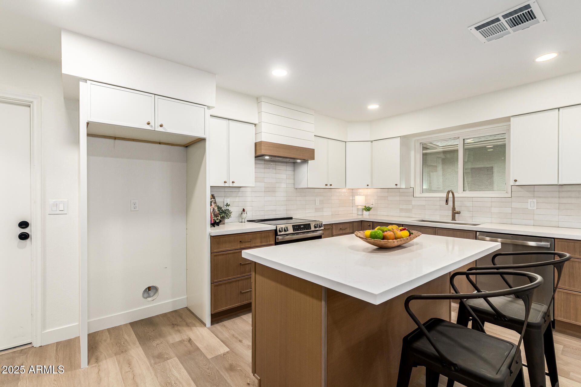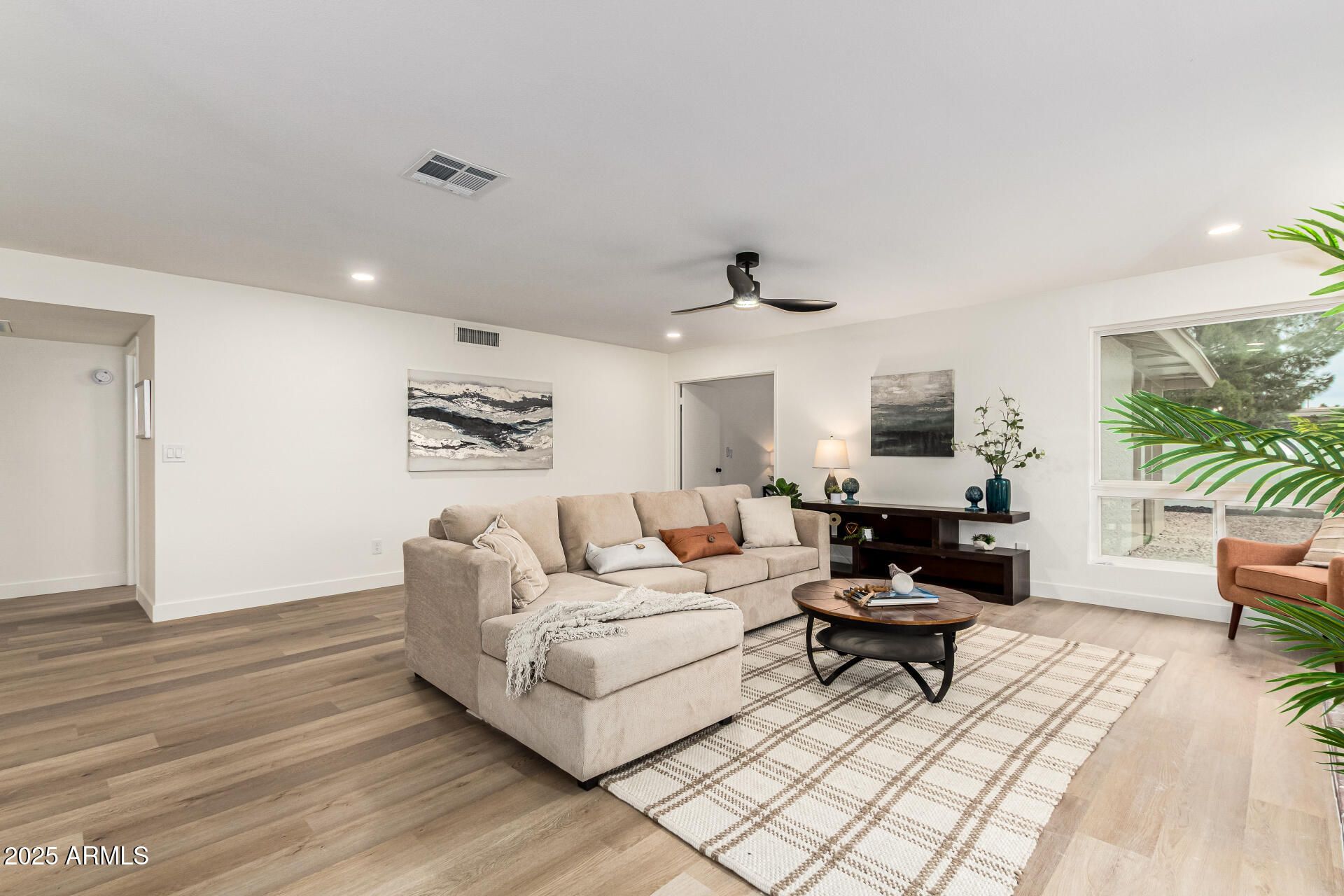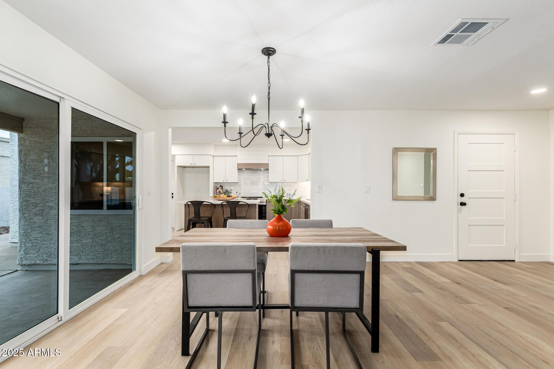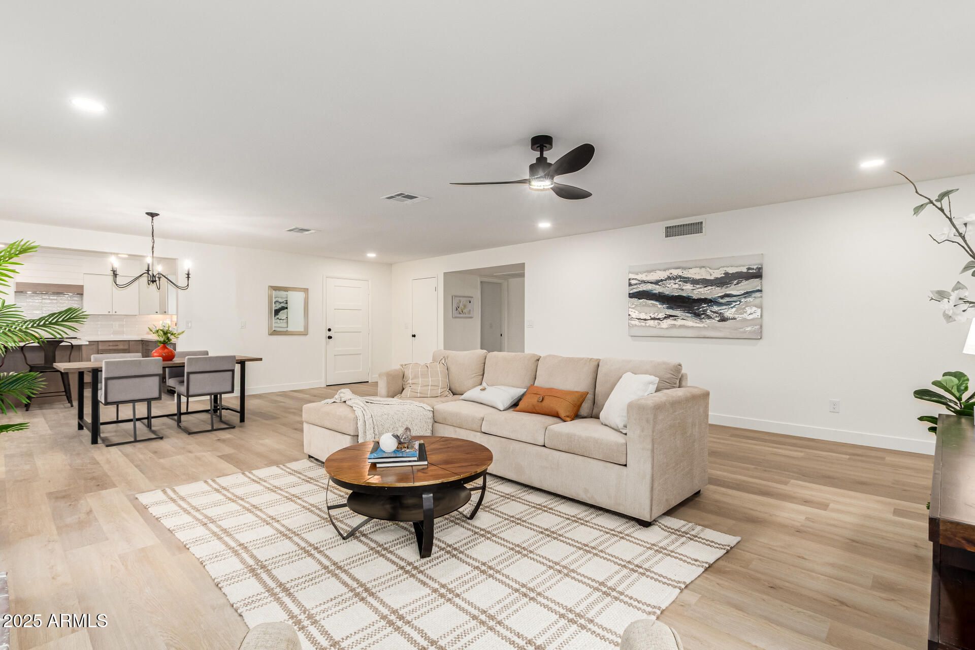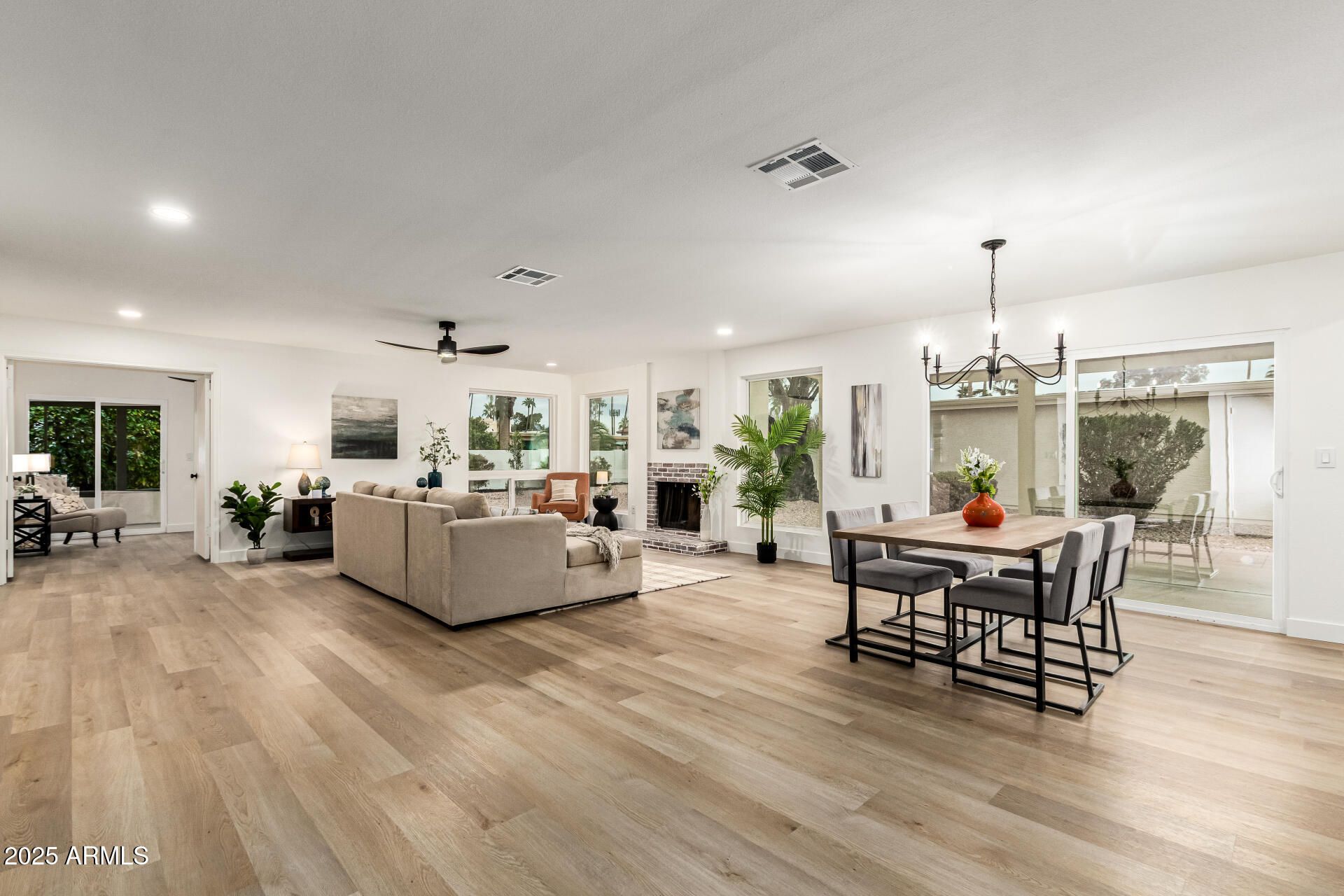 Discover this beautifully renovated 3-bedroom, 2-bath Zuni Model home, where modern updates and thoughtful design create a comfortable and inviting retreat. Inside, you'll find durable wood-inspired luxury vinyl plank flooring flowing throughout the home, paired with fresh interior paint in a soft, neutral palette that complements a wide range of styles. The open and functional floor plan offers easy everyday living and effortless entertaining. The reimagined kitchen is a standout, featuring sleek slim-shaker cabinetry, quartz countertops, a contemporary tiled backsplash, and stainless steel appliances, including a wine refrigerator for added convenience. The primary suite provides a relaxing escape with ample closet space and a spa-inspired ensuite bathroom complete with custom cabinetry, dual sinks, a dedicated makeup vanity, and a beautifully tiled walk-in shower. The secondary bathroom has also been tastefully updated with modern finishes, creating a cohesive look throughout the home. The dining area opens to the backyard through new sliding glass doors, enhancing natural light and providing seamless access to outdoor living. A classic wood-burning fireplace anchors the living room, adding warmth and character. The backyard has been designed with low-maintenance xeriscaping, offering a peaceful space to relax or entertain. Recent improvements include dual-pane windows, new sliding glass doors, and a new air conditioning system, and an electric vehicle charger in the garage, contributing to energy efficiency and year-round comfort. Fresh exterior paint completes this move-in-ready home. Enjoy life in the Cottonwood Palo Verde of Sun Lakes, where residents enjoy an 18-hole championship golf course, a par-62 executive course, pickleball, tennis, and racquetball courts, a state-of-the-art Fitness Activity Center, multiple swimming pools, scenic walking paths, on-site dining, and over 60 clubs and social activitiesperfect for active adults seeking both relaxation and connection.