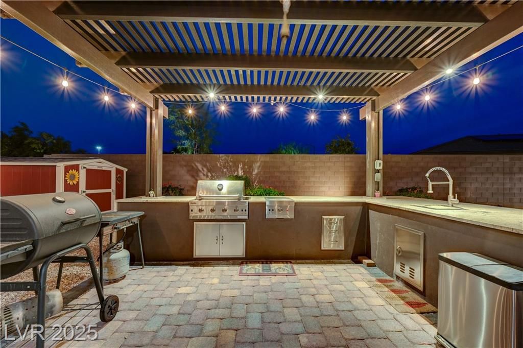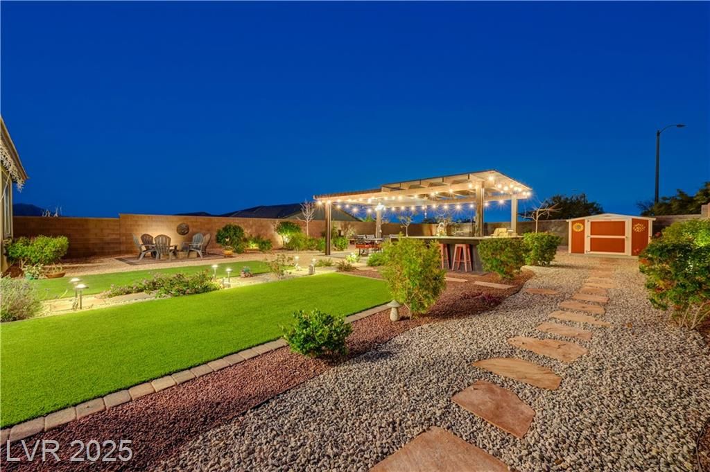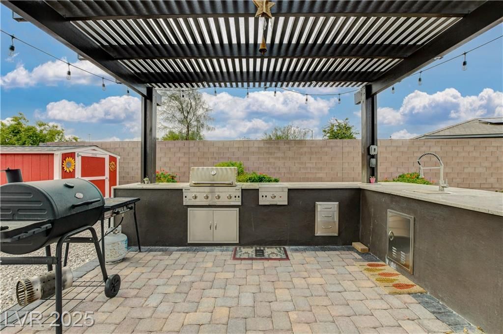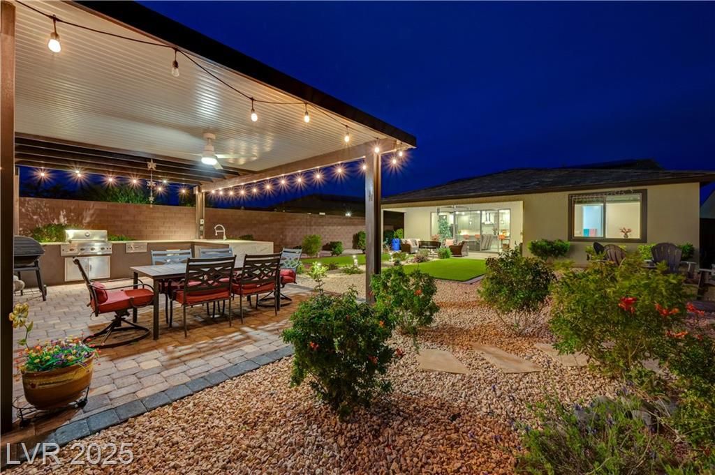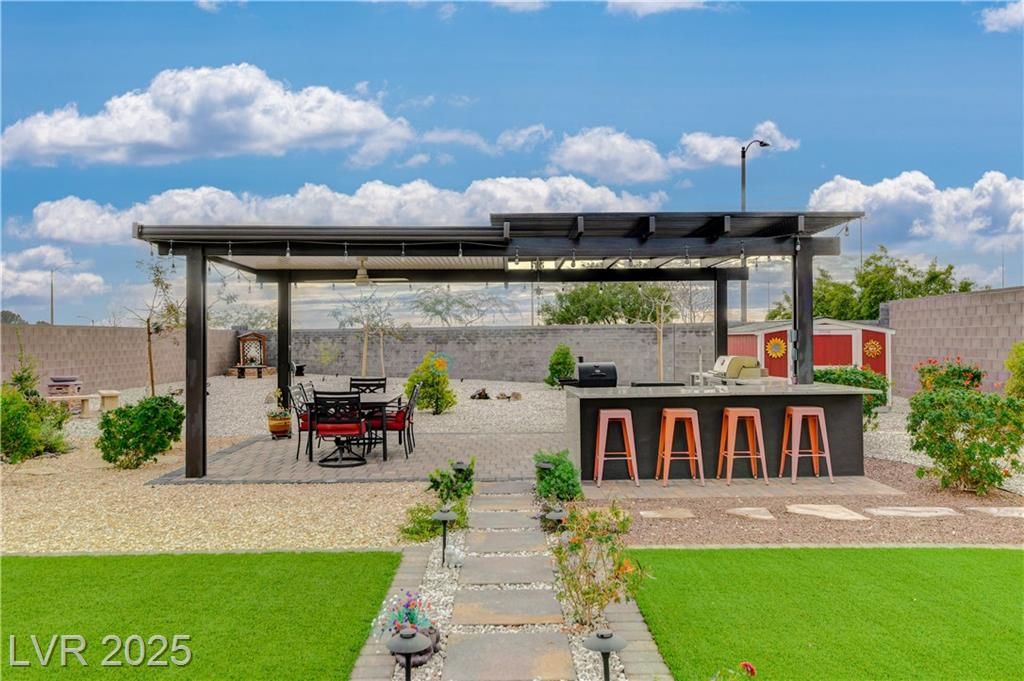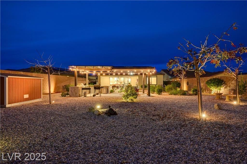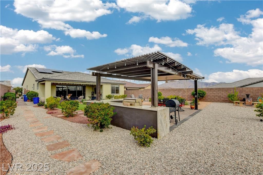 Welcome home to Sunstone at Trilogy a premier guard-gated 55+ community. This highly sought after Synergy model features 3 bedrooms, 2.5 bathrooms, plus a versatile den. The open concept layout boasts fully tiled floors throughout, soaring 9-foot ceilings, and an oversized sliding glass door that floods the home with natural light.The gourmet kitchen is highlighted by an extended island with pendant lighting, modern shaker cabinets, built-in oven, cooktop, and vent hood, fully tiled backsplash, soft close drawers and convenient trash pull out. The laundry room and den have been thoughtfully customized with built-in storage including a utility sink in the laundry. Step outside to your private backyard oasis one of the largest and best lots in Trilogy at an expansive 11,326 sq. ft. Perfect for entertaining, complete with built-in barbecue, lattice-covered patio, granite countertops, and sink. Storage shed conveys. The home benefits from an leased solar system on the roof. Must See!