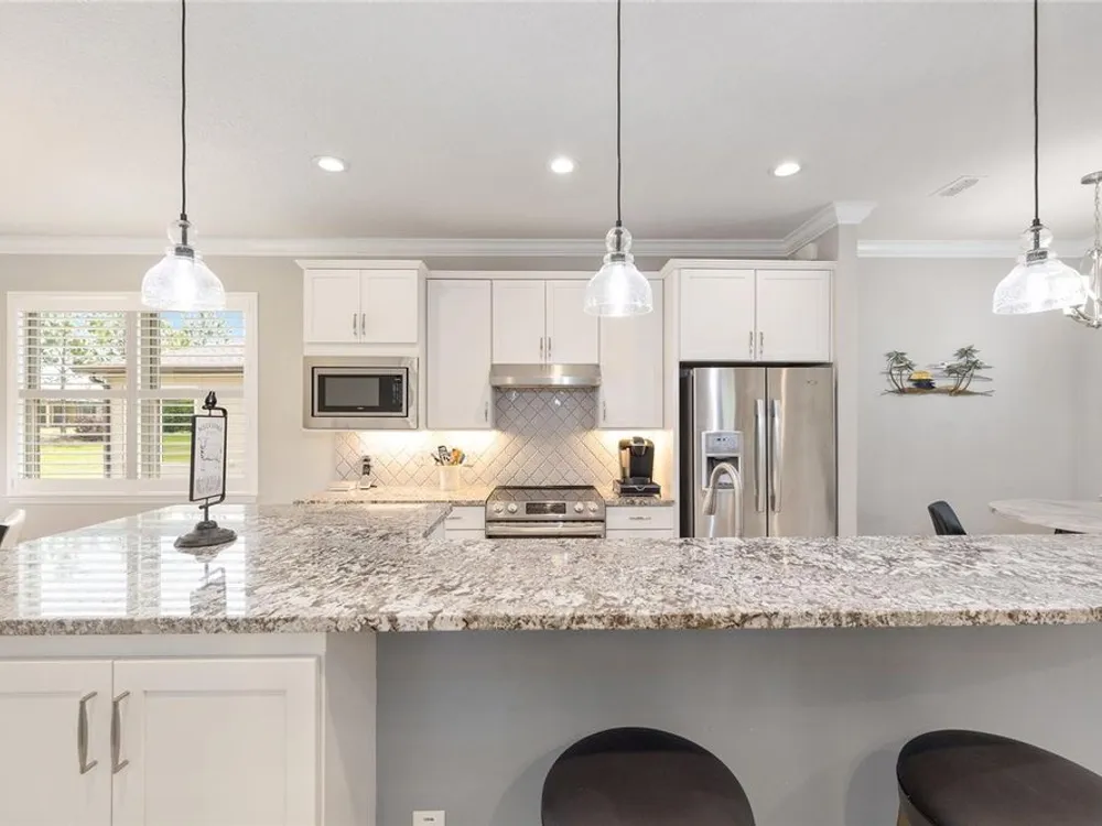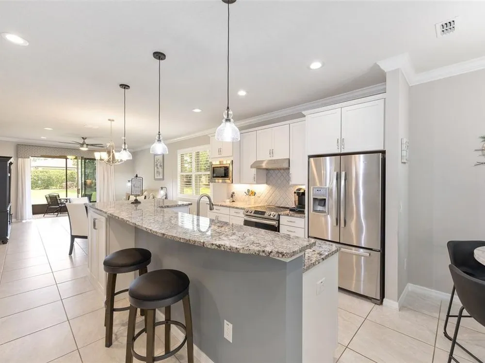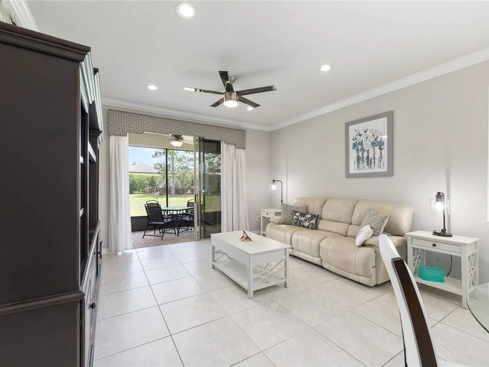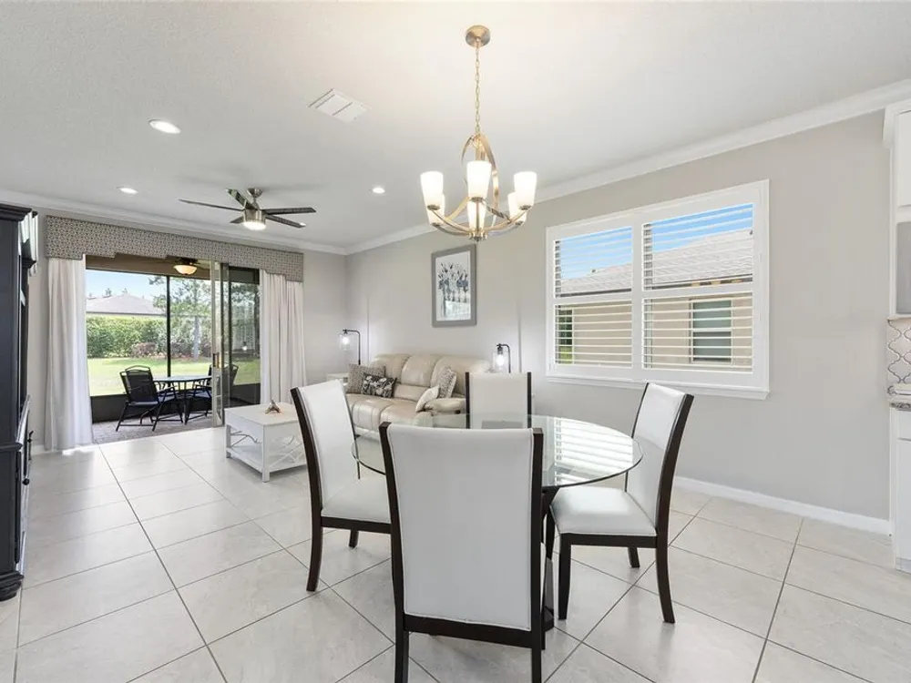 Experience the ease of carefree living in this stunningly designed Steel Creek garden series model situated within the gated 55+ Stone Creek golf community. Overlooking a private nature berm, this exceptional home blends serenity with resort-style amenities, all while offering the convenience of professionally managed lawn and landscaping maintenance. Inside, the thoughtfully crafted open living plan is bathed in natural light, enhanced by sleek tile flooring, Plantation shutters, LED downlighting, and exquisite crown molding throughout the main living areas. The chef-inspired kitchen is a dream, featuring a cozy dining nook, stainless steel appliances—including a comfort-height dishwasher and vented range hood—Shaker-style cabinetry, gleaming granite countertops, and a spacious island with stylish pendant lighting. Retreat to the Owner’s Suite, where a generous walk-in closet and oversized window frame tranquil nature views, inviting relaxation. A sliding barn door leads to the spa-like ensuite bath, complete with a step-in shower with a fiberglass surround, two transom windows for natural illumination, and a luxurious granite-topped double vanity. Outside, the screened-in lanai and extended birdcage patio offer a private escape overlooking the serene nature berm—an ideal spot to unwind and savor the beauty of your surroundings. Embrace the exceptional lifestyle of this vibrant community, featuring a 24/7 staffed gated entrance for security and peace of mind. Luxury-inspired amenities include heated pools, a state-of-the-art fitness center, a spa, and relaxing hot tubs and saunas. Stay active with pickleball, bocce, tennis, and a softball field, while a dedicated lifestyle staff curates entertainment, activities, and special events to foster connections. Just beyond the gates, enjoy a golf course, pro shop, and restaurant—perfect for socializing and unwinding. Make your move today and experience resort-style living at its finest!