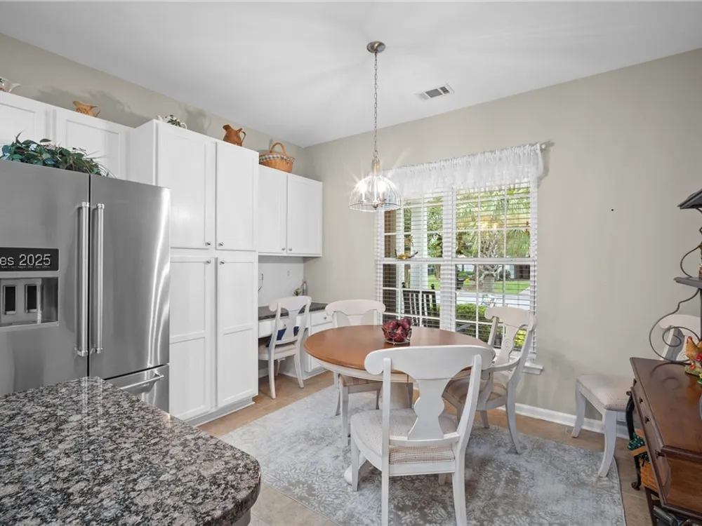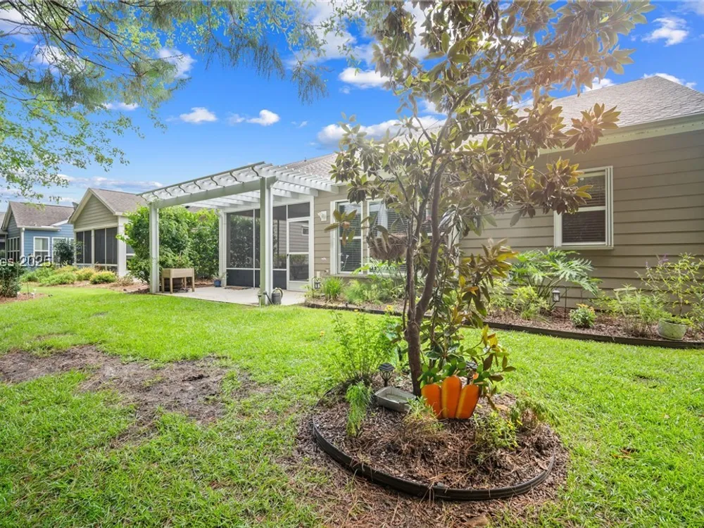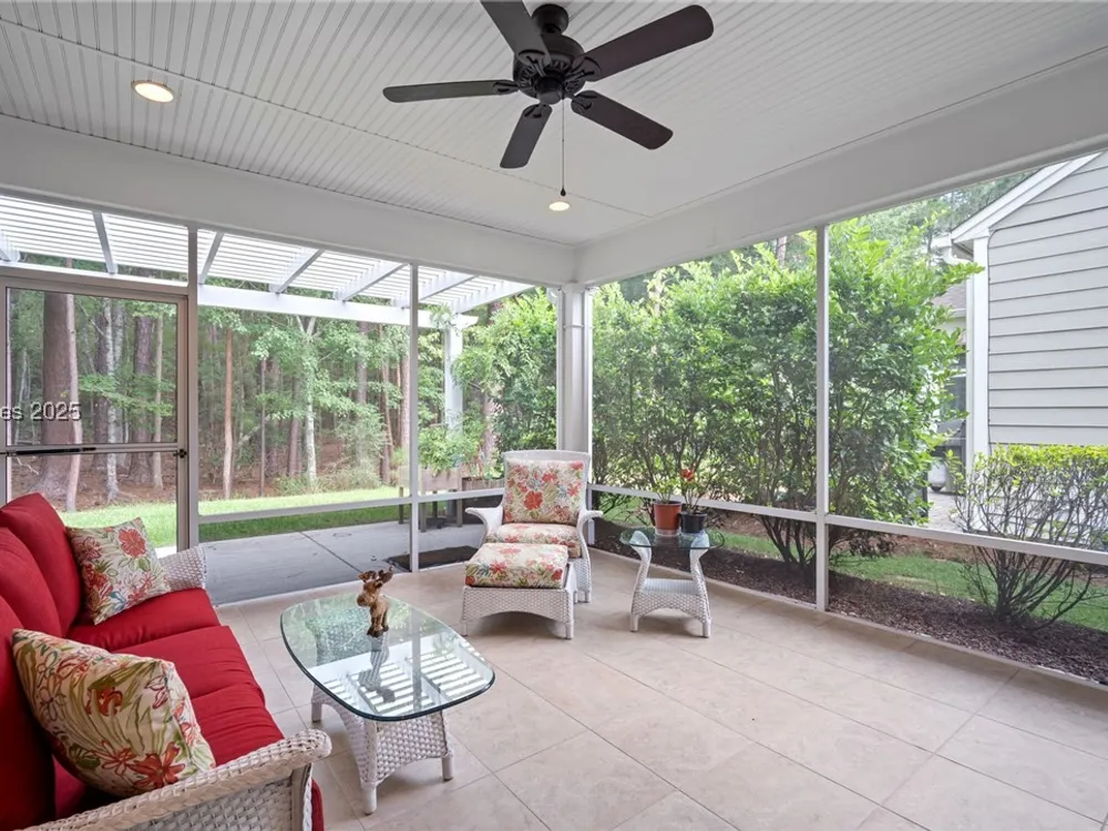 Exceptional Willow Bend model in Sun City - Move in Ready! This meticulously maintained 2 bed, 2 bath home w/Office/Den is ideally situated on a cul-de-sac street. Enjoy the curb appeal of a charming southern style front porch & the security of a 2020 roof & 2022 HVAC. Inside, admire the continuous 18 x 18 tile flooring, carpeted bedrooms & a well-appointed eat-in-kitchen w/granite counters, stainless steel appliances, built in desk & a central island. The family room flows to a screened in covered Lanai for year round enjoyment & an extended patio w/a pergola overlooking the wooded views. Accordion shutters enhance windows & door protection