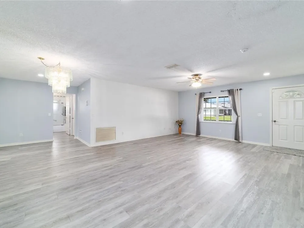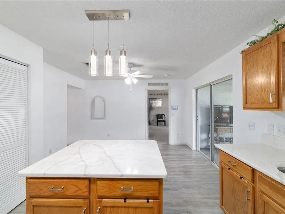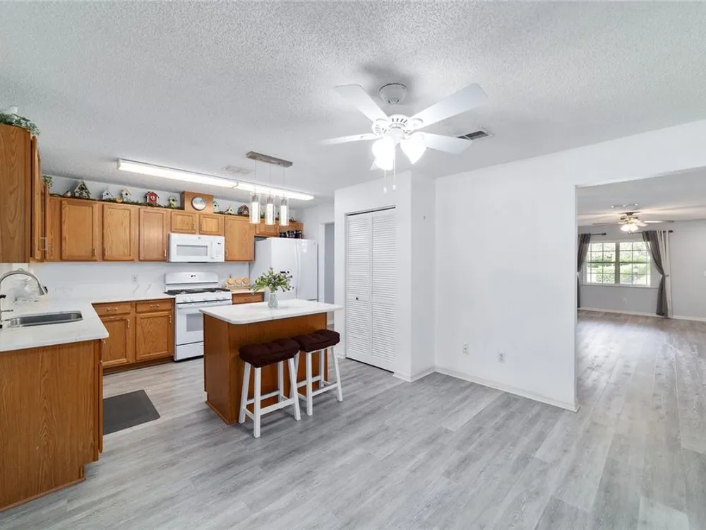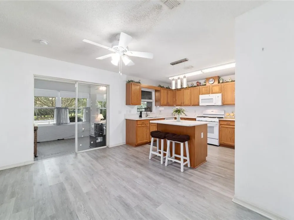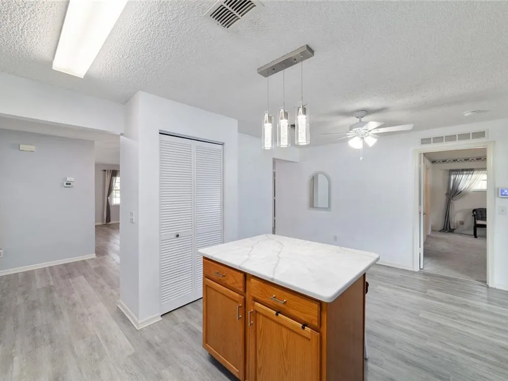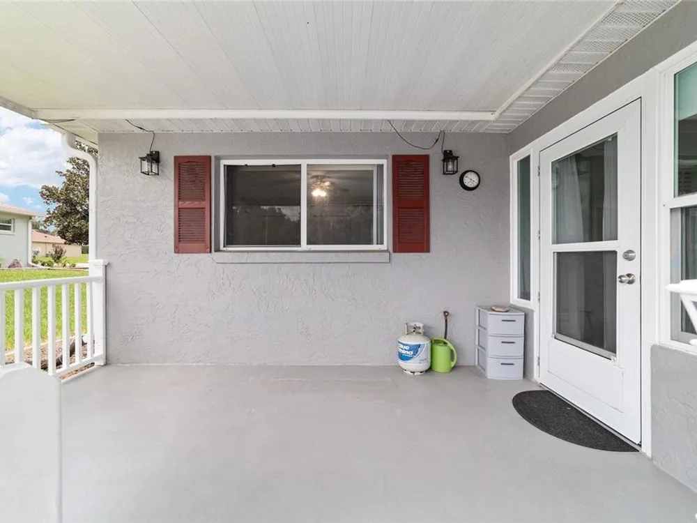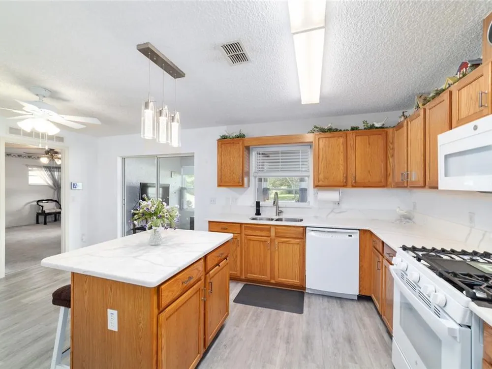 Nestled in desirable Crescent Ridge, this beautifully updated 3-bedroom, 2-bath corner home is just steps from Veterans Park and the community mailboxes. Inside, enjoy newly installed luxury vinyl flooring, fresh paint, and generous closets throughout, including a master suite with a spacious walk-in closet. The kitchen is a chef's delight with quartz countertops, a center island with designer lighting, gas stove, and all appliances included, while the baths feature a walk-in tub and raised toilets. Natural light fills the enclosed lanai under air, and a generous laundry room with washer, dryer, and hanging racks adds everyday convenience. Additional highlights include leaf-guard gutters, water softener system, inviting front porch, private fenced patio, and a garage work area with extra shelving. With its thoughtful updates, modern comforts, and ideal north/south exposure, this home is move-in ready--the sellers have already relocated, making it the perfect opportunity for a new buyer to step in, fall in love, and make it their own.