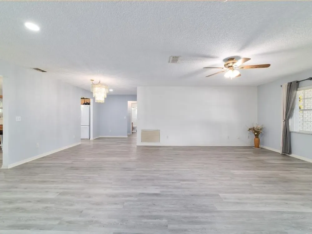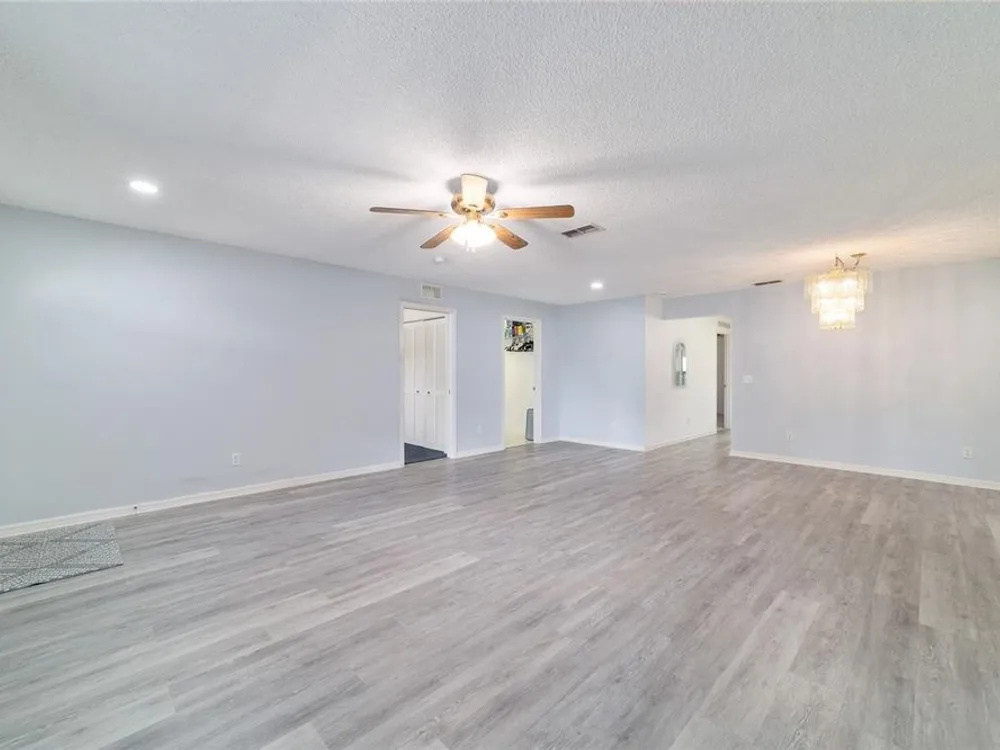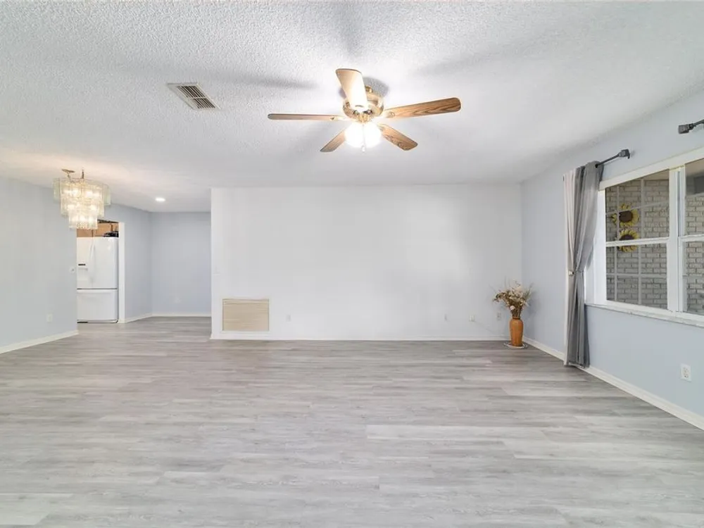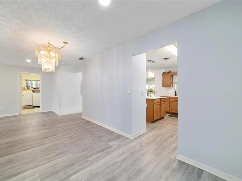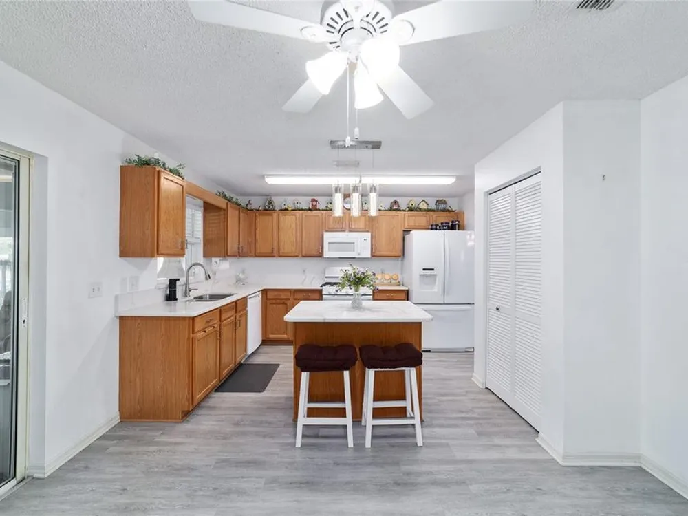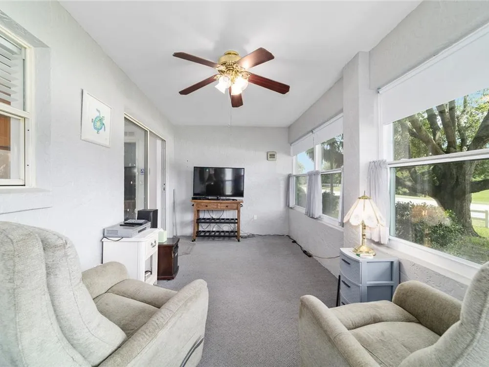 Nestled in desirable Crescent Ridge, this beautifully updated 3-bedroom, 2-bath corner home is just steps from Veterans Park and the community mailboxes. Inside, enjoy newly installed luxury vinyl flooring, fresh paint, and generous closets throughout, including a master suite with a spacious walk-in closet. The kitchen is a chef's delight with quartz countertops, a center island with designer lighting, gas stove, and all appliances included, while the baths feature a walk-in tub and raised toilets. Natural light fills the enclosed lanai under air, and a generous laundry room with washer, dryer, and hanging racks adds everyday convenience. Additional highlights include leaf-guard gutters, water softener system, inviting front porch, private fenced patio, and a garage work area with extra shelving. With its thoughtful updates, modern comforts, and ideal north/south exposure, this home is move-in ready--the sellers have already relocated, making it the perfect opportunity for a new buyer to step in, fall in love, and make it their own.