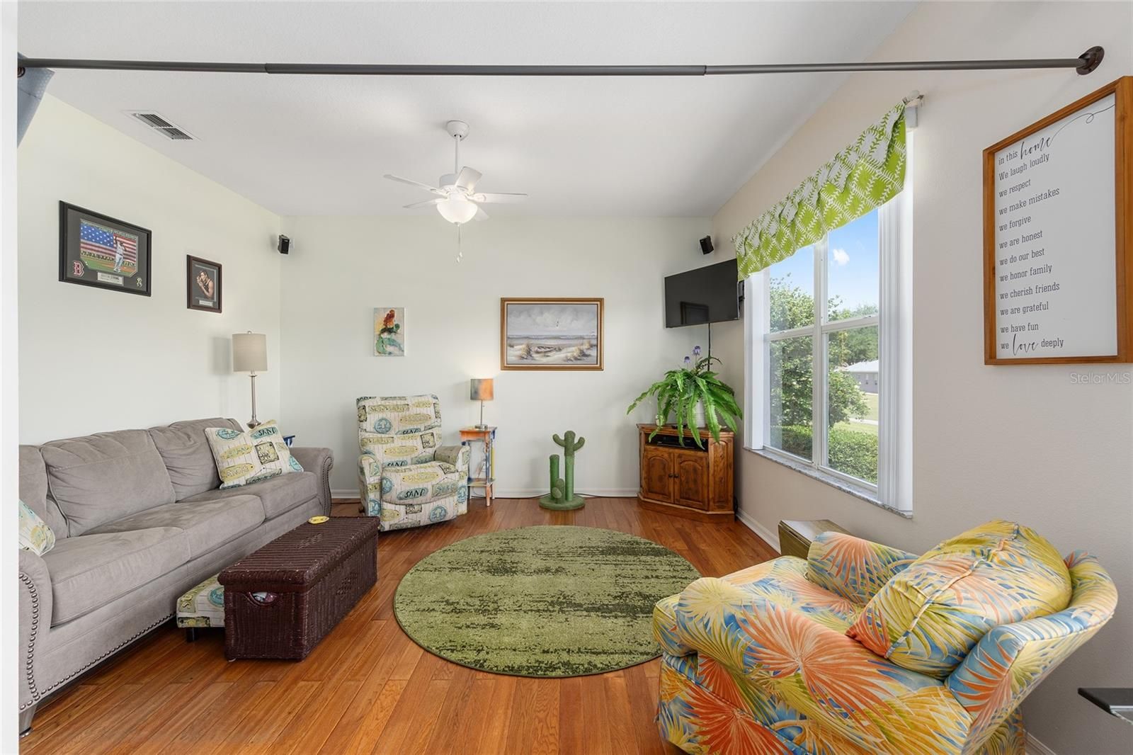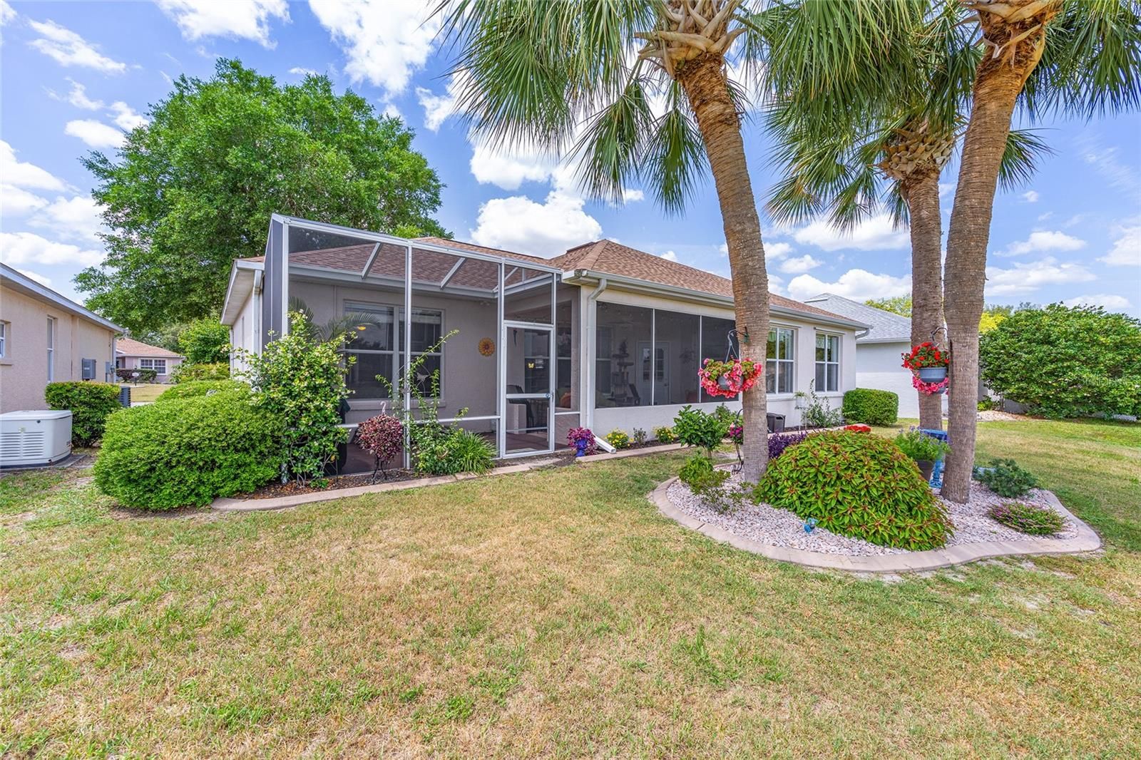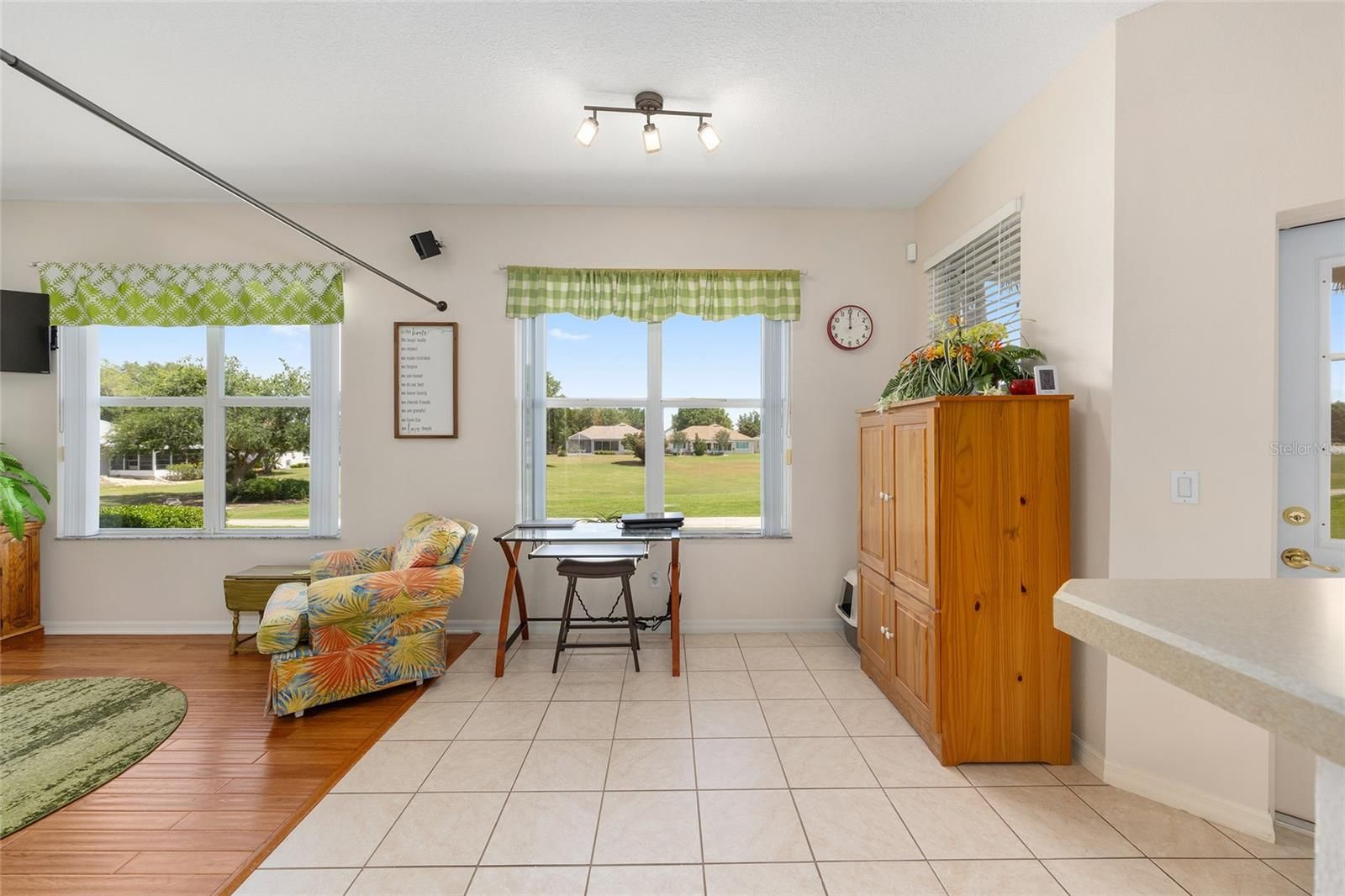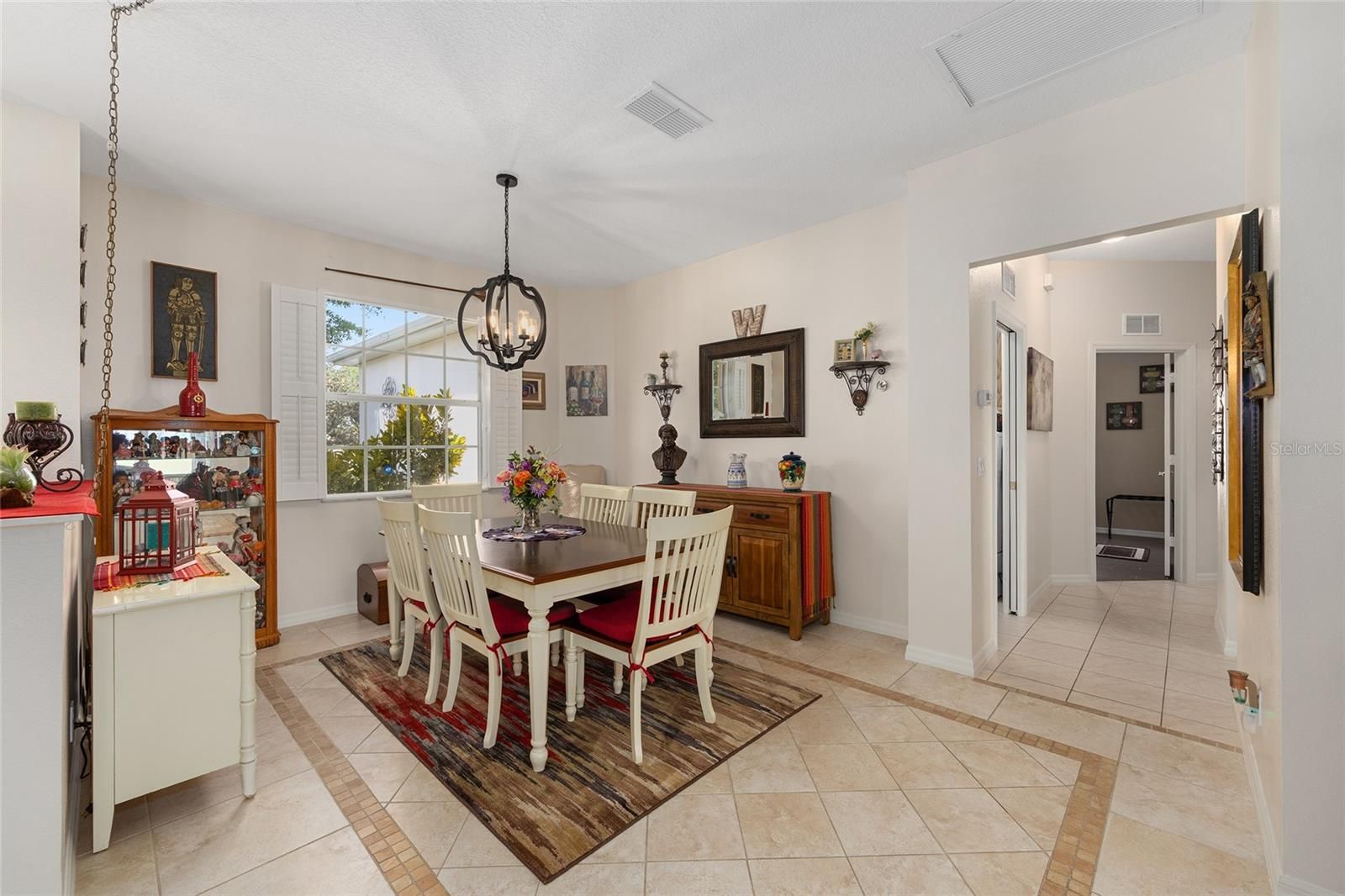 This well-maintained Jamestown model in Providence offers 2 bedrooms, 2 bathrooms, a versatile flex room, and a 2-car garage, ideally positioned on a premium lot overlooking the 11th hole of the Tortoise & Hare golf course. A tiled entry welcomes you into the home, leading to a bright formal dining area with a chandelier and large front window. The main living space is filled with natural light from 3 windows framing peaceful golf course views and opening to the screened lanai. The kitchen features wood cabinetry, stainless steel appliances, and a pantry, and flows seamlessly into an informal living area complete with a ceiling fan and TV mount. The primary suite showcases wood-look tile flooring, a walk-in closet, and an ensuite bath with a Roman-style tiled shower, enclosed water closet, dark cabinetry, and linen storage. A comfortable guest bedroom sits adjacent to a full bath with a tiled tub/shower combination and additional linen storage. The laundry room offers overhead cabinetry and a washer and dryer for added convenience. The garage is thoughtfully equipped with built-in cabinets, a workbench, utility sink, overhead storage, and a screened door for ventilation. Outdoors, enjoy a screened front entry and a spacious lanai with an extended birdcage added in 2019 and ceiling fan-perfect for relaxing and taking in the scenic golf course setting.