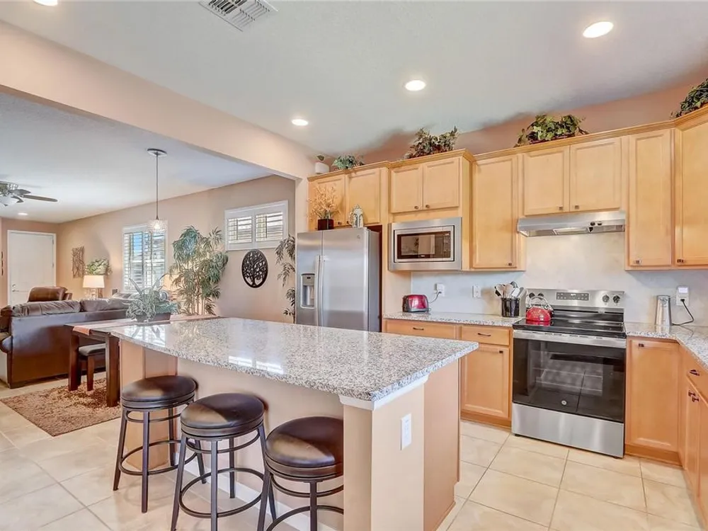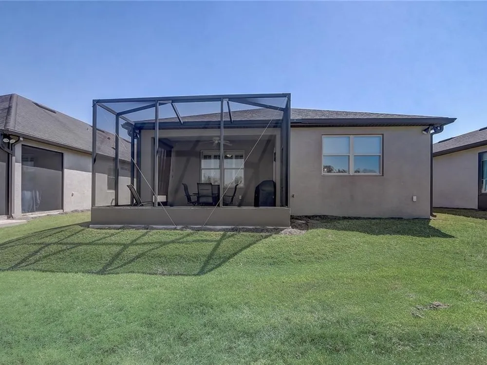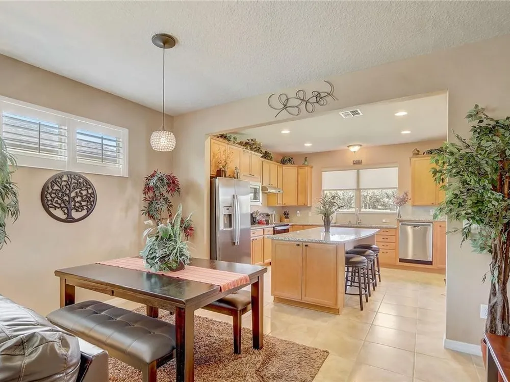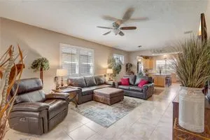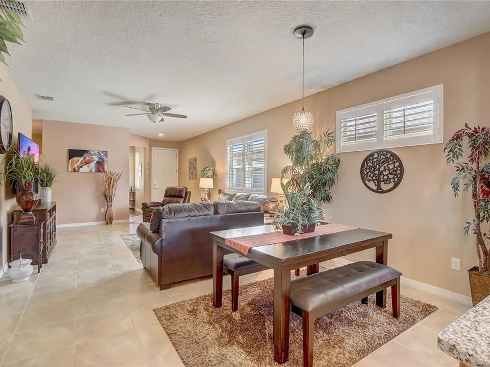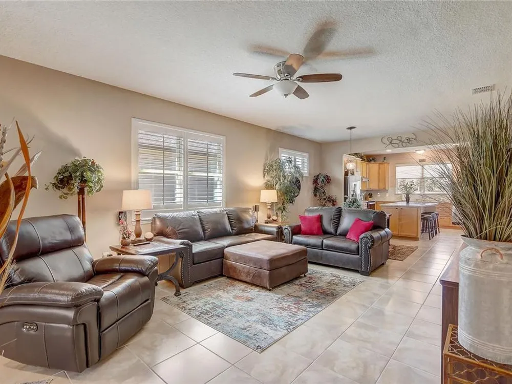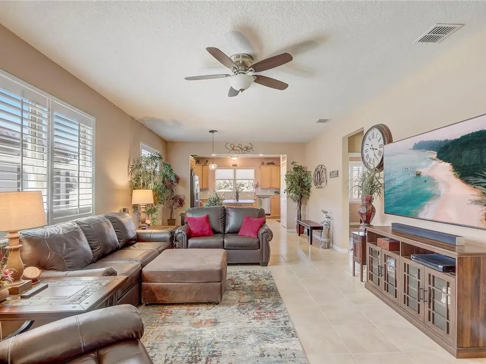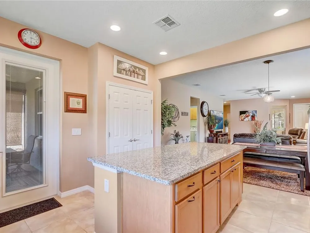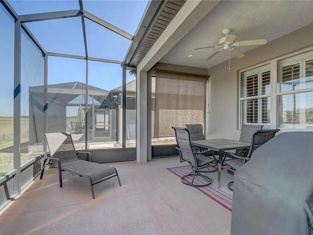 Furniture is negotiable, offering added flexibility for buyers looking for a move-in-ready option. Mortgage savings may be available for buyers of this listing. Welcome to this charming 2-bedroom, 2-bathroom home with a versatile den, perfect for use as an office, extra bedroom, or whatever suits your needs. As you enter, you'll be captivated by the open-concept design that seamlessly connects the living room, dining room, and kitchen, creating a spacious and inviting atmosphere. The kitchen is a chef's dream, featuring a large center island, a generous pantry, and stainless steel appliances, including a brand-new stove (2024) and a 2-year-old GE refrigerator. The primary suite offers a relaxing retreat with an en-suite bathroom that includes dual sinks, a walk-in shower, and a walk-in closet. Step outside to your private lanai, where you can unwind while overlooking a large backyard, providing plenty of space for outdoor activities. Located in the desirable 55+ community of Stone Creek, you'll enjoy a wealth of amenities, including a dog park, pickleball and tennis courts, a basketball court, and even a baseball field. This home offers the perfect blend of comfort, convenience, and community living.