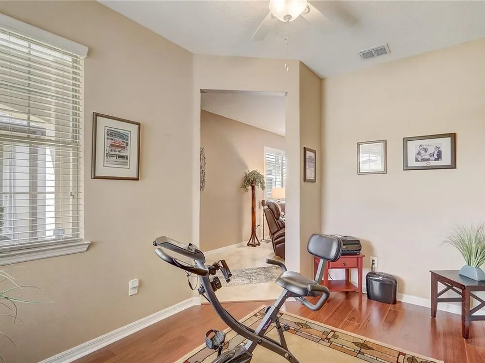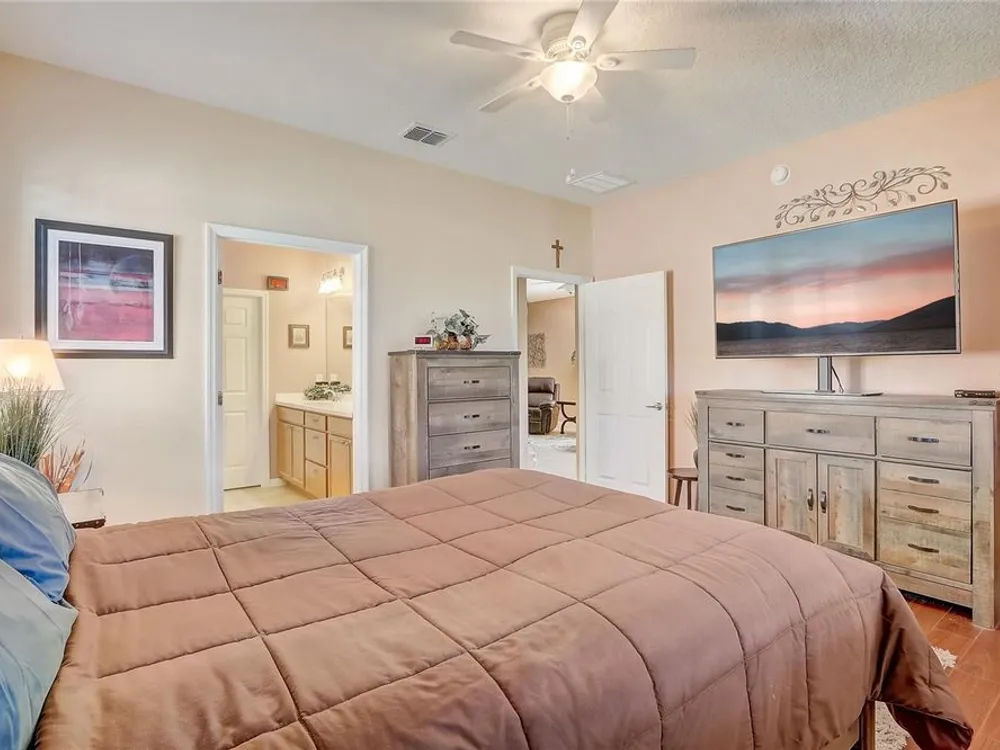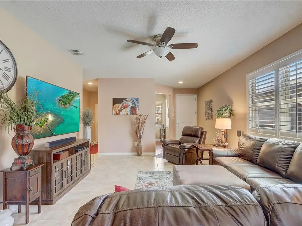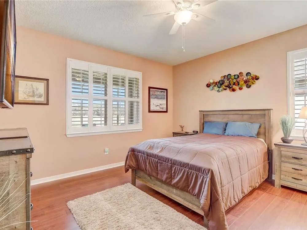 - Ceiling Fan(s), Eat-in Kitchen, High Ceilings, In-Wall Pest Control, Kitchen/Family Room Combo, Living/Dining Room, Open Floorplan, Main Level Primary, Solid Surface Counters, Solid-Wood Cabinets, Stone Counters, Thermostat, Walk-In Closet(s), Window Treatments