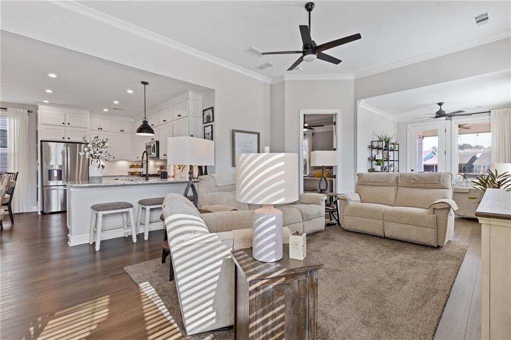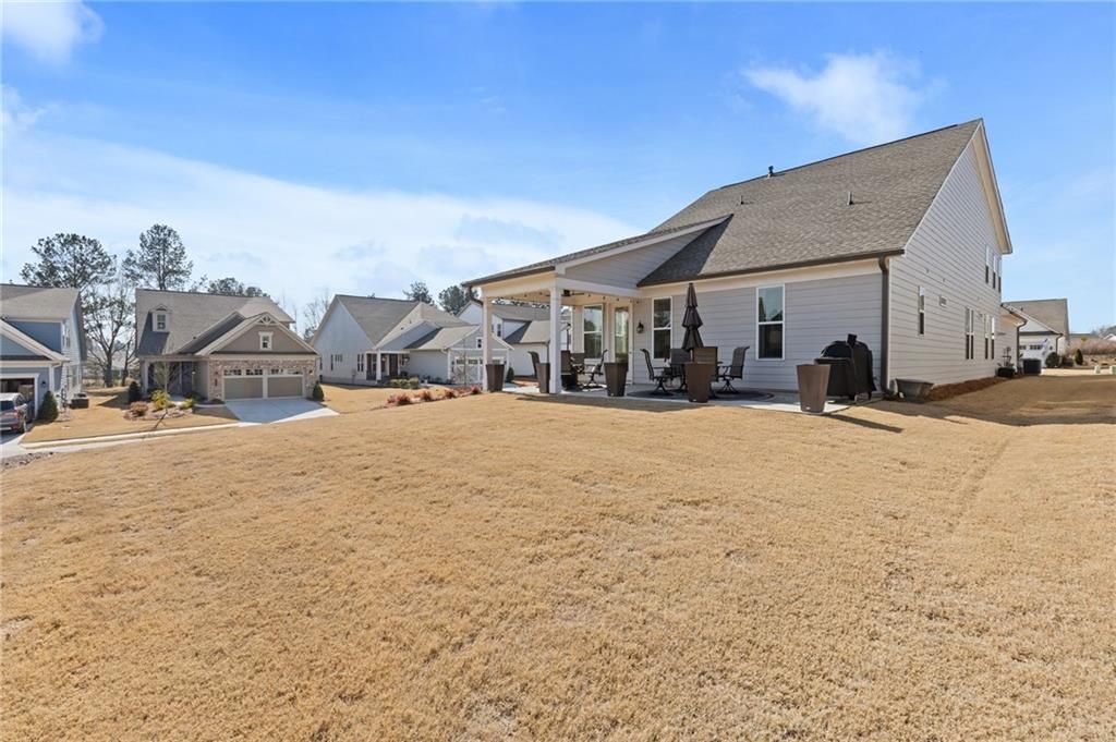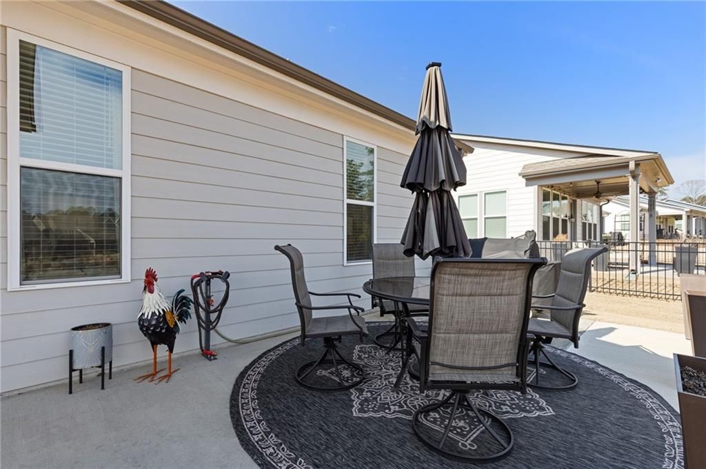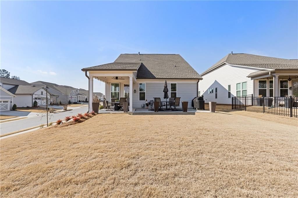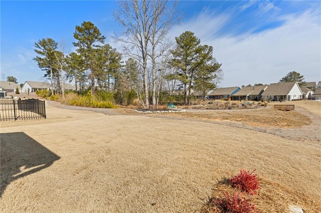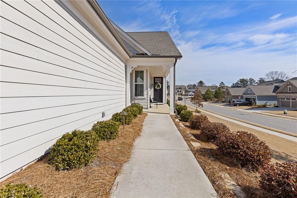 MOVE-IN READY! Exceptional One-Level Living in the Popular Ash Floor Plan. With over $100,000 in upgrades, this beautifully designed home offers effortless single-level living featuring 2 bedrooms, 2 full baths, plus a private office or flex space with elegant French doors. Permanent stairs lead to an unfinished upper level—ready to be customized to suit your needs or used for generous storage. The stunning kitchen showcases floor-to-ceiling upgraded white cabinetry, gorgeous quartz countertops, stainless steel appliances, recessed lighting, and a bright breakfast area. The sun-filled great room features 10-foot ceilings, luxury vinyl flooring, additional recessed lighting, and convenient floor outlets for flexible furniture placement. The spacious primary suite includes a spa-like stepless shower with separated double vanities, abundant counter space and cabinetry, and a large walk-in closet. A separate laundry room with built-in cabinets adds functionality and extra storage. Throughout the home, you’ll appreciate the abundance of windows and natural light, as well as the added benefit of a tankless water heater. Outdoor living is just as impressive with a charming rocking-chair side porch and an extended covered back patio—perfect for relaxing or entertaining. The oversized corner lot and level backyard greenspace offers peaceful views of the community Monarch butterfly garden. Located on one of the most desirable streets in Cresswind at Twin Lakes, Caddo Court is known for its vibrant, welcoming atmosphere with monthly dinners out, street cookouts, and festive holiday decorations. And the lifestyle? It’s unmatched. This gated community features a resident-only clubhouse with a full-time Activities Director, a resort-style outdoor pool, indoor lap pool with spa, and a SmartFit Training Center complete with cardio, weights, and EGYM Smart Circuit training. Additional amenities include a cardio studio, yoga room, arts and crafts studio with kiln, lounge spaces, multiple event rooms, demonstration kitchen, and ballroom. Enjoy Georgia’s largest pickleball complex, dog park, community garden, scenic walking trails, lakes with dock and boat launch for non-motorized crafts (kayaking, canoeing, catch-and-release fishing), plus an event lawn with covered stage. Monthly HOA includes cable, internet, security monitoring, yard maintenance, and access to all resort-style amenities. Conveniently located with easy access to Atlanta and less than an hour from the Blue Ridge Mountains, Lake Lanier, Athens, and more. Even better—Publix and Kroger Marketplace are now open and accessible by golf cart! This isn’t just a home — it’s a lifestyle. Come join the fun!