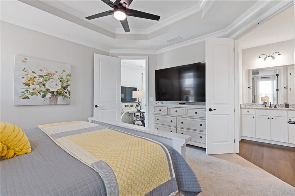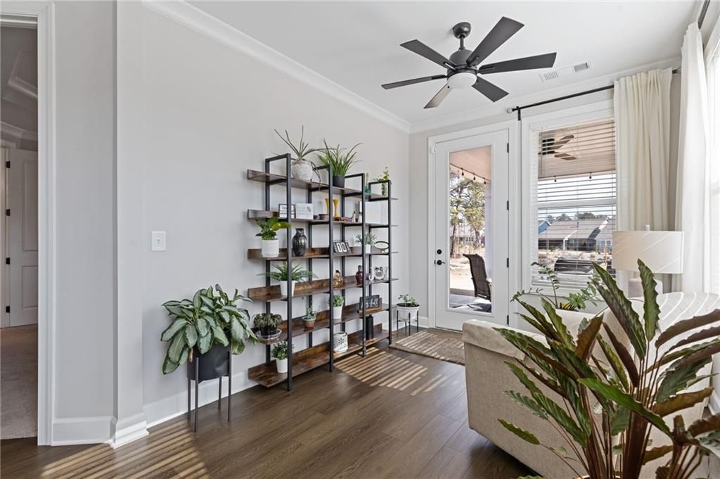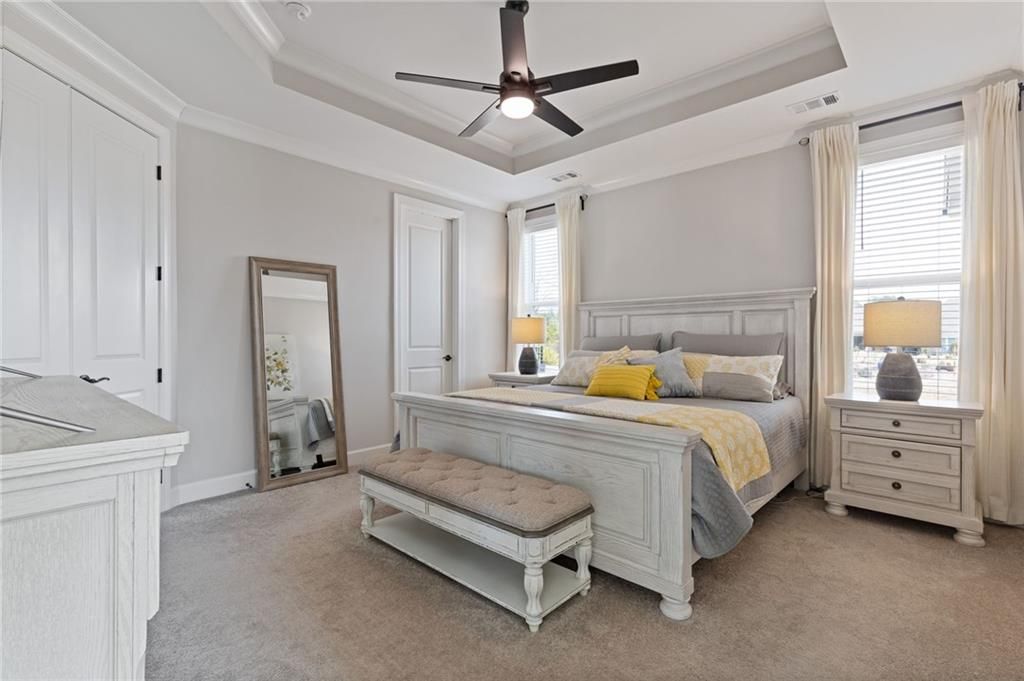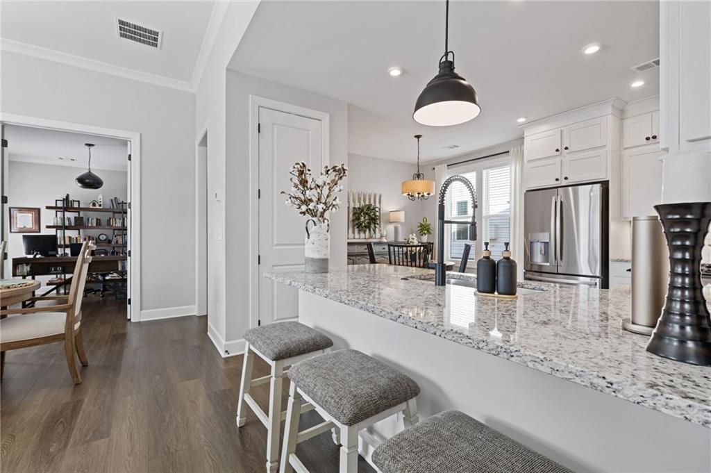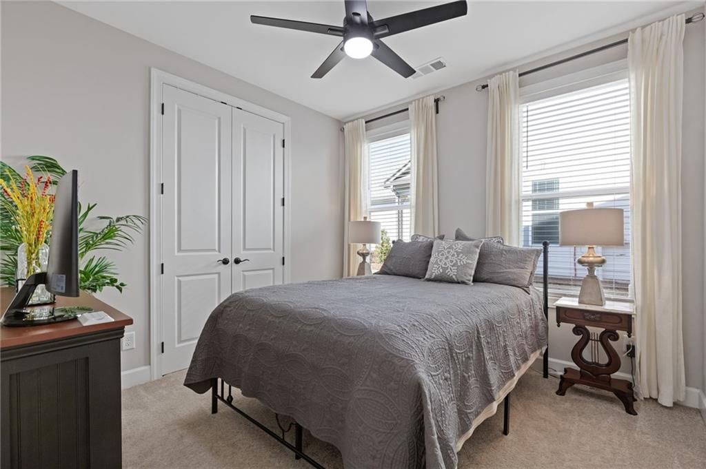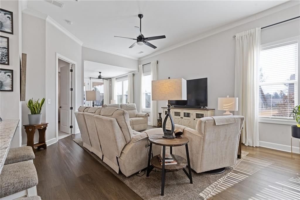 MOVE-IN READY! Exceptional One-Level Living in the Popular Ash Floor Plan. With over $100,000 in upgrades, this beautifully designed home offers effortless single-level living featuring 2 bedrooms, 2 full baths, plus a private office or flex space with elegant French doors. Permanent stairs lead to an unfinished upper level—ready to be customized to suit your needs or used for generous storage. The stunning kitchen showcases floor-to-ceiling upgraded white cabinetry, gorgeous quartz countertops, stainless steel appliances, recessed lighting, and a bright breakfast area. The sun-filled great room features 10-foot ceilings, luxury vinyl flooring, additional recessed lighting, and convenient floor outlets for flexible furniture placement. The spacious primary suite includes a spa-like stepless shower with separated double vanities, abundant counter space and cabinetry, and a large walk-in closet. A separate laundry room with built-in cabinets adds functionality and extra storage. Throughout the home, you’ll appreciate the abundance of windows and natural light, as well as the added benefit of a tankless water heater. Outdoor living is just as impressive with a charming rocking-chair side porch and an extended covered back patio—perfect for relaxing or entertaining. The oversized corner lot and level backyard greenspace offers peaceful views of the community Monarch butterfly garden. Located on one of the most desirable streets in Cresswind at Twin Lakes, Caddo Court is known for its vibrant, welcoming atmosphere with monthly dinners out, street cookouts, and festive holiday decorations. And the lifestyle? It’s unmatched. This gated community features a resident-only clubhouse with a full-time Activities Director, a resort-style outdoor pool, indoor lap pool with spa, and a SmartFit Training Center complete with cardio, weights, and EGYM Smart Circuit training. Additional amenities include a cardio studio, yoga room, arts and crafts studio with kiln, lounge spaces, multiple event rooms, demonstration kitchen, and ballroom. Enjoy Georgia’s largest pickleball complex, dog park, community garden, scenic walking trails, lakes with dock and boat launch for non-motorized crafts (kayaking, canoeing, catch-and-release fishing), plus an event lawn with covered stage. Monthly HOA includes cable, internet, security monitoring, yard maintenance, and access to all resort-style amenities. Conveniently located with easy access to Atlanta and less than an hour from the Blue Ridge Mountains, Lake Lanier, Athens, and more. Even better—Publix and Kroger Marketplace are now open and accessible by golf cart! This isn’t just a home — it’s a lifestyle. Come join the fun!