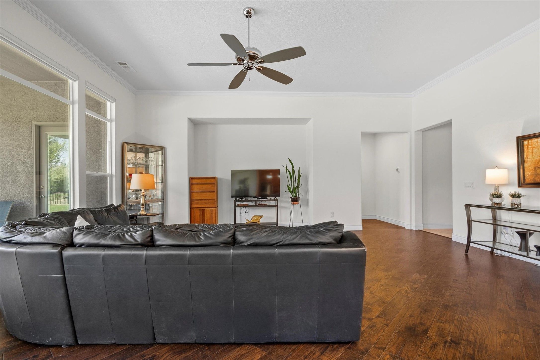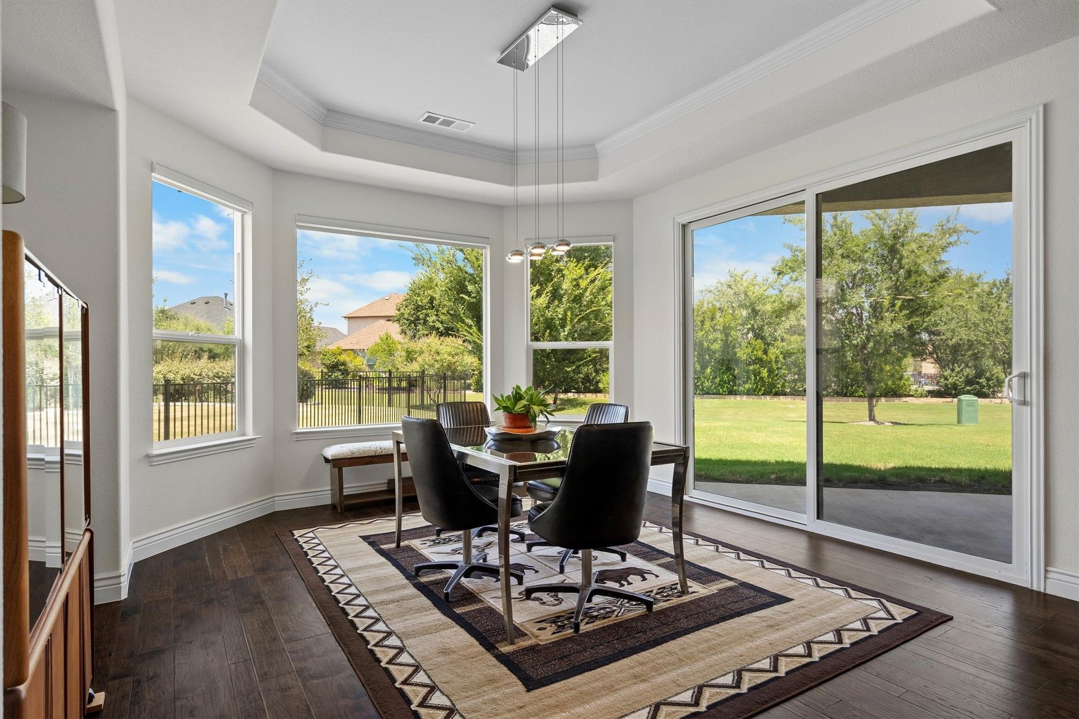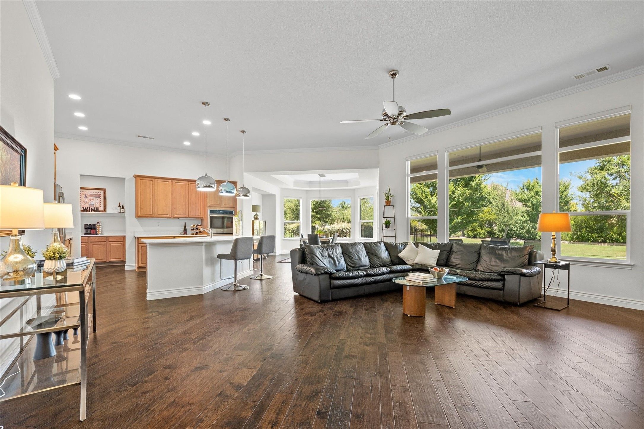 Welcome Home to 9700 Blackwood Drive. Back on the market with a new price! This beautifully maintained 2-bedroom, 2.5 bathroom Ashland model sits on a desirable corner greenbelt lot in Robson Ranch -DFW's premier active adult community. From the moment you step inside, you'll feel the thoughtful design and quality care that has gone into this single-story home. This spacious floor plan offers high ceilings, rich wood floors and abundant natural light- easily adjusted with the remote-controlled electric shades in the living and dining areas. Not far from the main living area is a dedicated office that can easily serve as a cozy den or second living space. The kitchen is a true chef's dream with an oversized island, quartz countertops, stainless steel appliances, a gas cooktop, a wine fridge and a coffee bar. A roomy walk-in pantry provides excellent additional storage. Retreat to the serene primary suite with private access to the covered patio featuring a ceiling fan and cable wiring for an outdoor TV. Phantom screens on the front entry, garage entry and the dining room patio door allow for fresh air to flow while keeping bugs out. The oversized 3-car garage includes a storage alcove and a partially floored attic Beyond the home, Robson Ranch offers an unmatched lifestyle. From the resort-style outdoor pool and indoor lap pool to a state of-the-art fitness center, wood shop, art studios and endless clubs and classes, every day feels like a vacation. For the outdoor enthusiast, enjoy golf, pickleball, tennis and more -or simply unwind with friends at the Wildhorse grill and Clubhouse. Looking to connect with neighbors? This friendly street is known for its monthly social gatherings making it easy to meet new friends and feel right at home. Don't miss your chance to own this exceptional home in one of the most vibrant 55+ communities in Texas. Schedule your private tour today and come see why Robson Ranch is more than a neighborhood - it's a lifestyle.