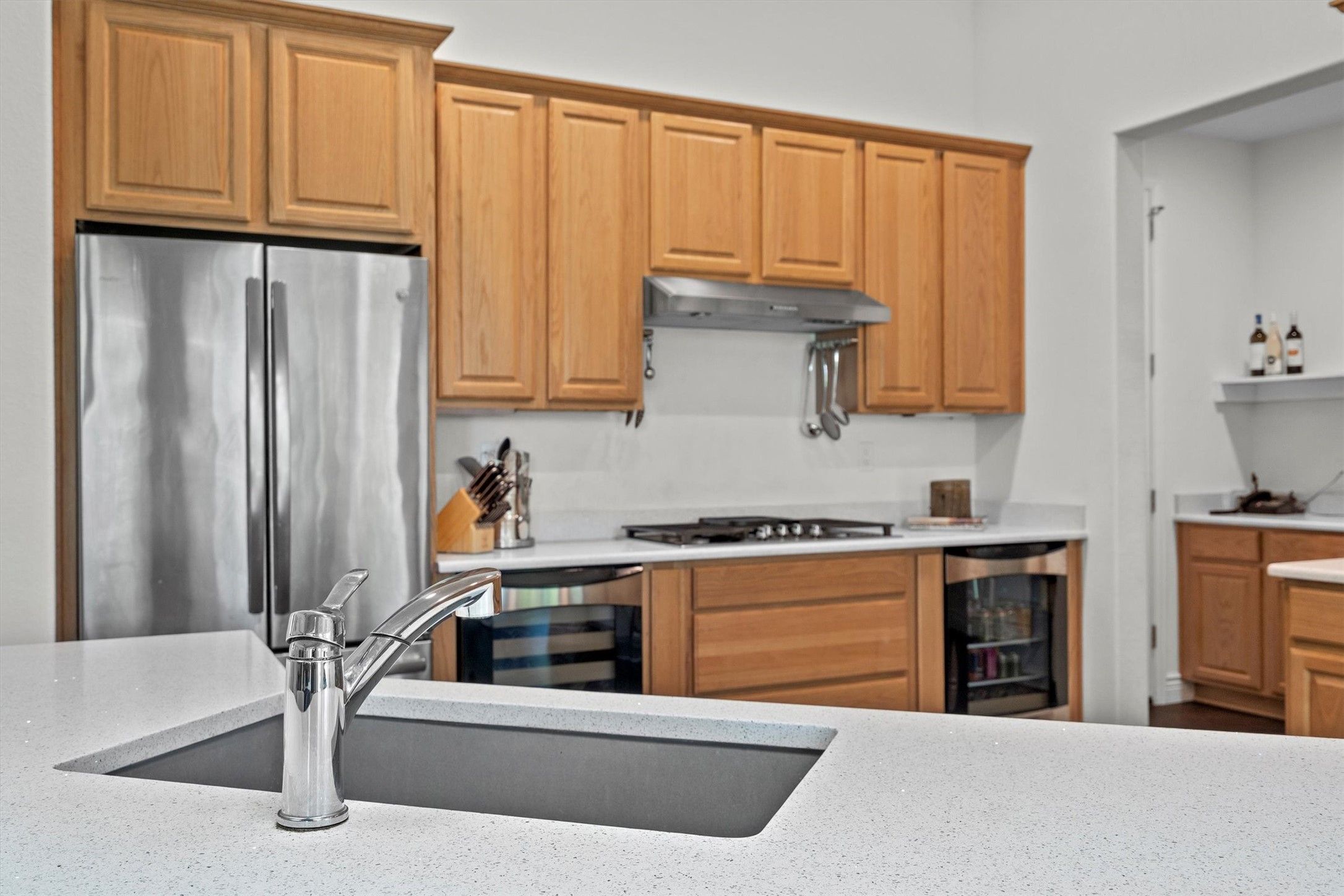 - Some Gas Appliances, Dishwasher, Electric Oven, Gas Cooktop, Disposal, Gas Water Heater, PlumbedForGas, Vented Exhaust Fan, Wine Cooler