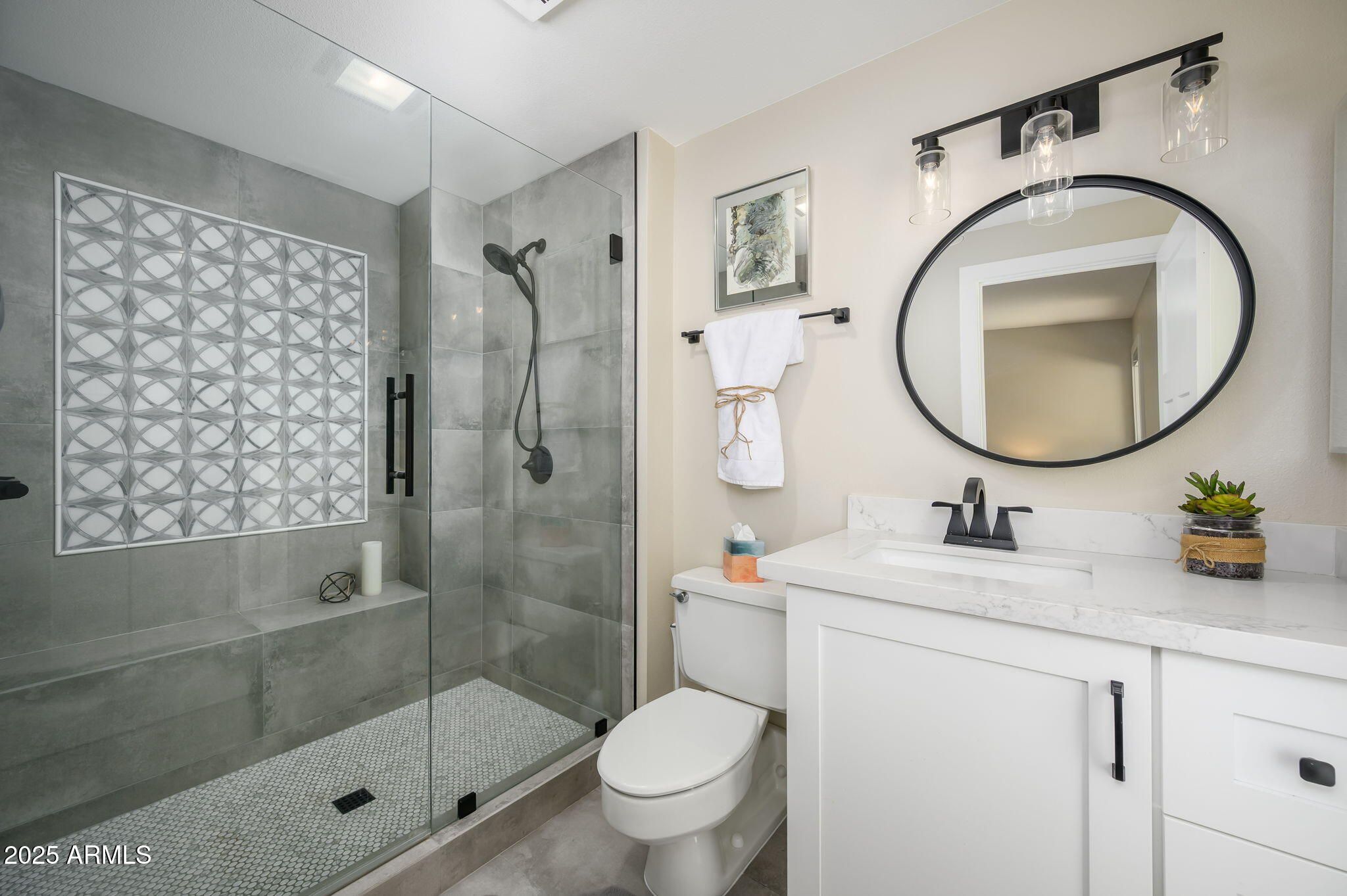 This Sun City Home has won TWO - Best of Tour awards! FULL remodel - turn-key offers - 3 bed, 2 bath home offers a modern open floor plan with designer finishes throughout. The kitchen features custom shaker soft-close cabinets, quartz countertops, bronze pendant lighting, custom backsplash and new stainless steel appliance package. Both bathrooms fully renovated with luxury walk-in tile showers, thick glass doors, and custom cabinetry. Enjoy 100% waterproof luxury vinyl plank flooring throughout with plush carpet in the bedrooms. Recent updates ensure long term peace of mind: New roof (2021), New HVAC (2022), New water heater (2022), New dual-pane windows & doors. New insulation, garage door, and fresh paint inside and outside. Enjoy your winter here. Perfectly situated with desirable north/south exposure, this home is just minutes from the Sun City Community Centers with recreation, music, bowling, golf, fitness, pools, and clubs. Experience the convenience of being close to all the amenities that make Sun City one of Arizona's most sought-after active adult communities. This home truly combines modern comfort with resort-style living - a must see!