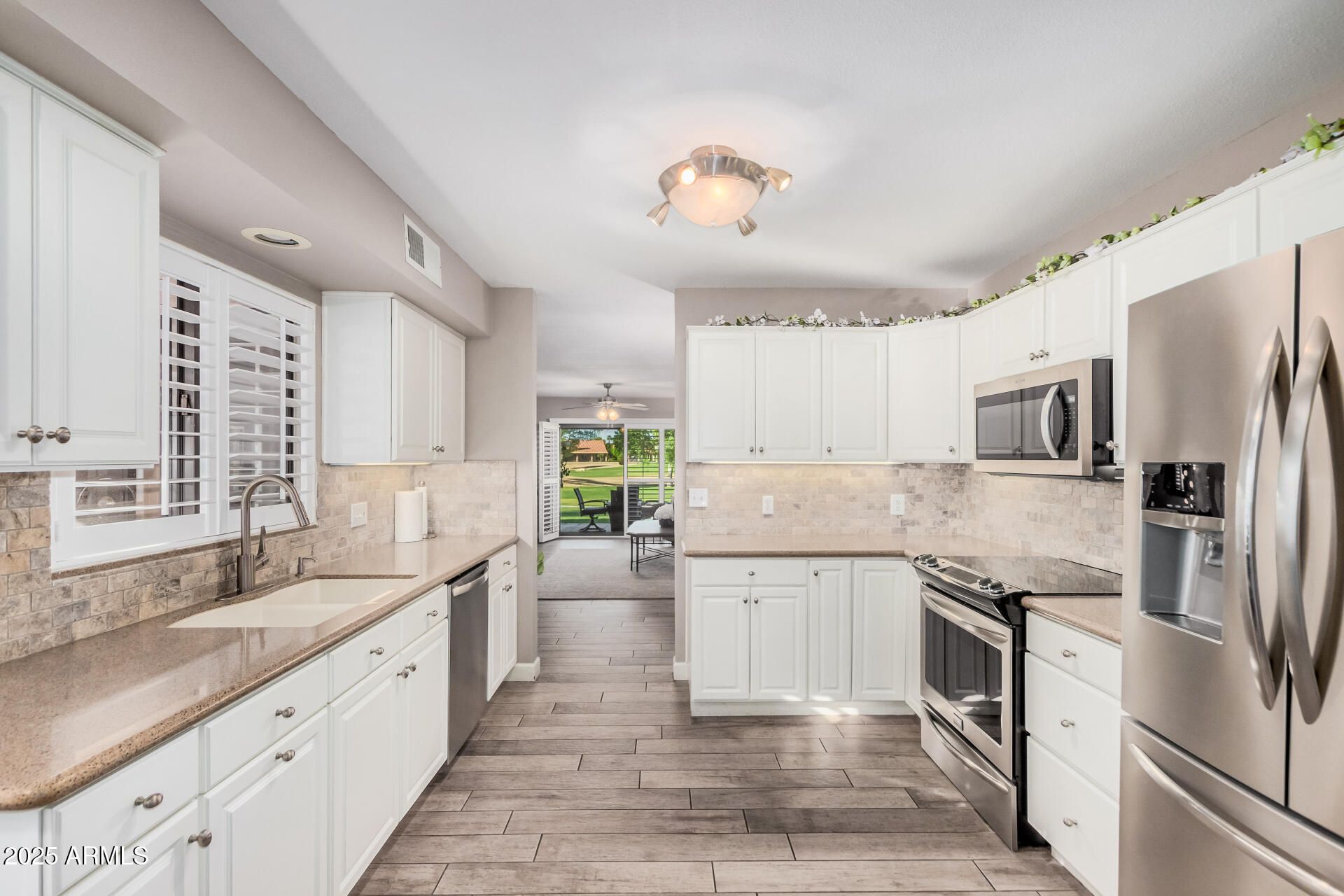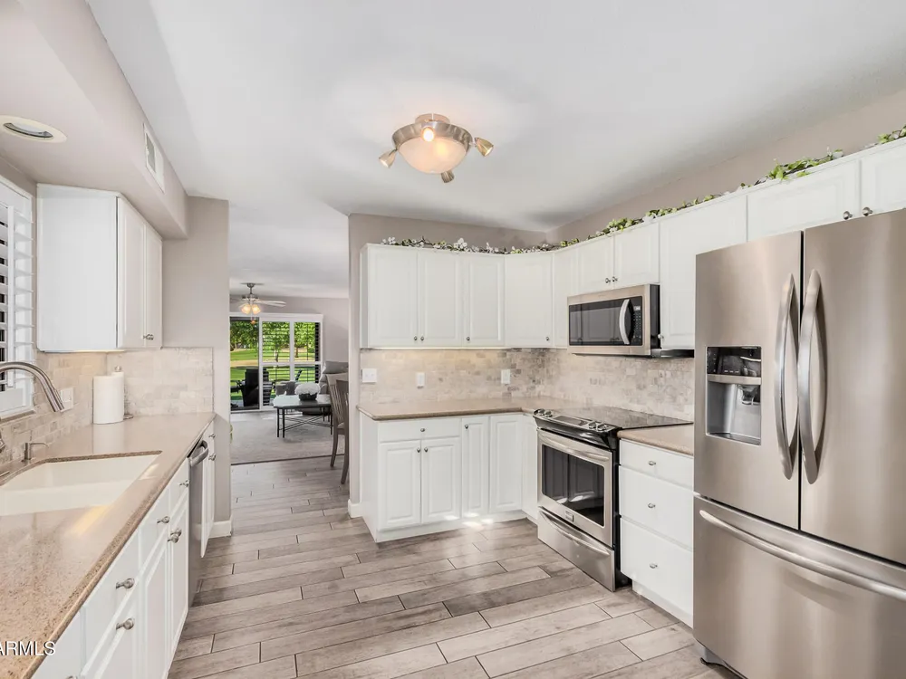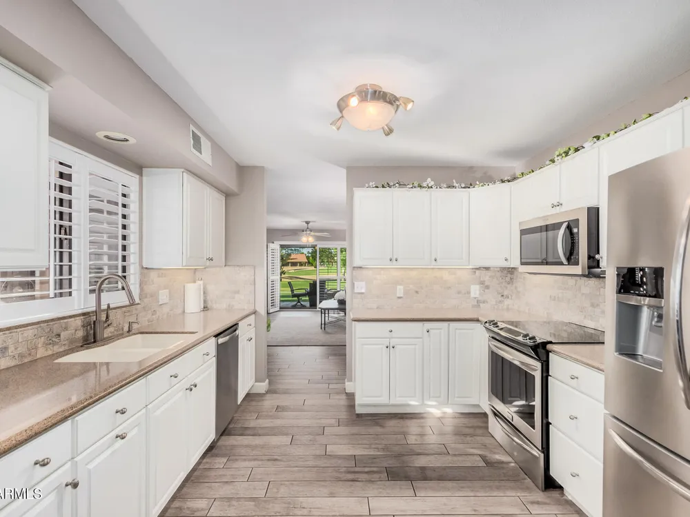 A great LOCATION on the Lakes #6 Fairway w/ views across to the #5 green, fairway! This lovely Ironwood has been TASTEFULLY UPDATED THRUOUT: A soft, neutral palette sets the background for plank tile flooring, high baseboards, plantation shutters, & newer fixtures. Nicely textured ceilings - no popcorn! Newer Anderson patio doors. The kitchen is light & bright w/ a functional layout, SS appls, & breakfast nook overlooking your inviting entryway. These tasteful updates continue to your primary, king-sized bedroom, w/ patio access, & a nice bathroom w/ a walk-in closet. The guest bedroom is also king-sized. Enjoy the amenity-rich Westbrook lifestyle w/ 2 champ golf courses, pickleball, tennis & a multitude of social clubs plus the prox. to Loop 101 and P-83. WELCOME HOME