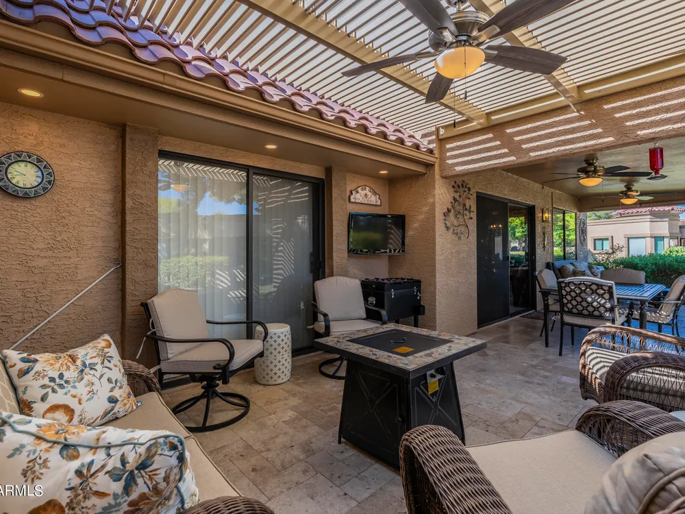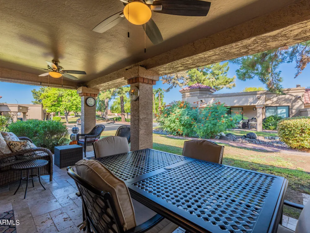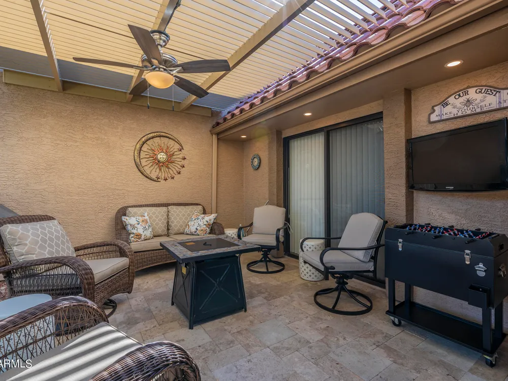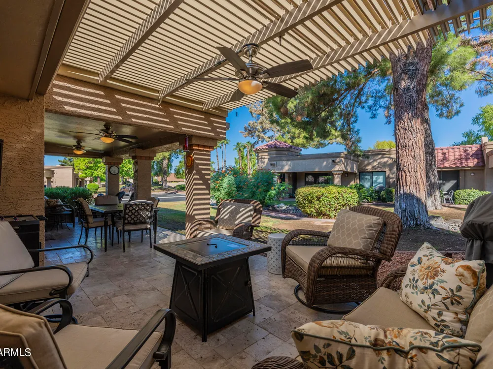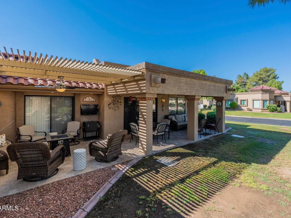 Welcome to Westbrook Village - where resort-style living meets everyday comfort! This beautifully updated 2-bedroom, 2-bath Casita is perfectly situated on a desirable corner lot. The open floor plan creates a natural flow between living spaces, combining style and convenience for easy living. Step outside to enjoy the elegance of new travertine tile and an adjustable pergola—ideal for relaxing or entertaining in any season. The private backyard offers tranquil views of the lush common area, providing a peaceful retreat, while the community pool is just steps away for a refreshing dip anytime. Westbrook Village residents enjoy an active, friendly lifestyle with access to two championship golf courses, two community centers, heated pools and spas, a fitness facility, pickleball