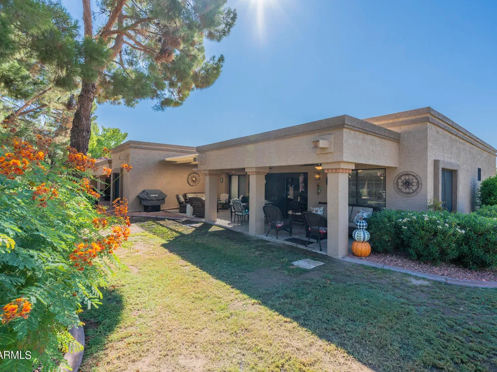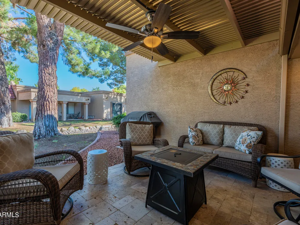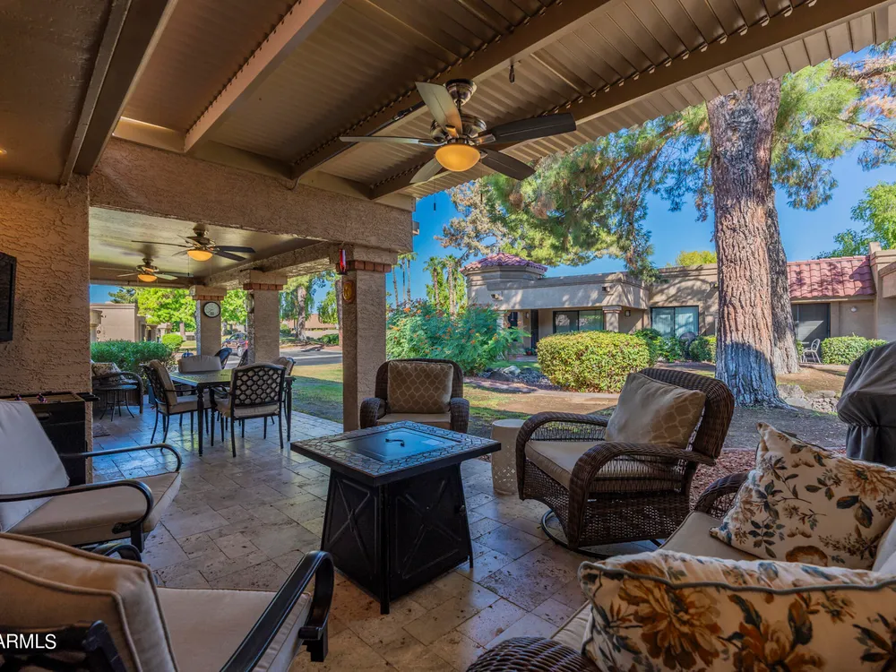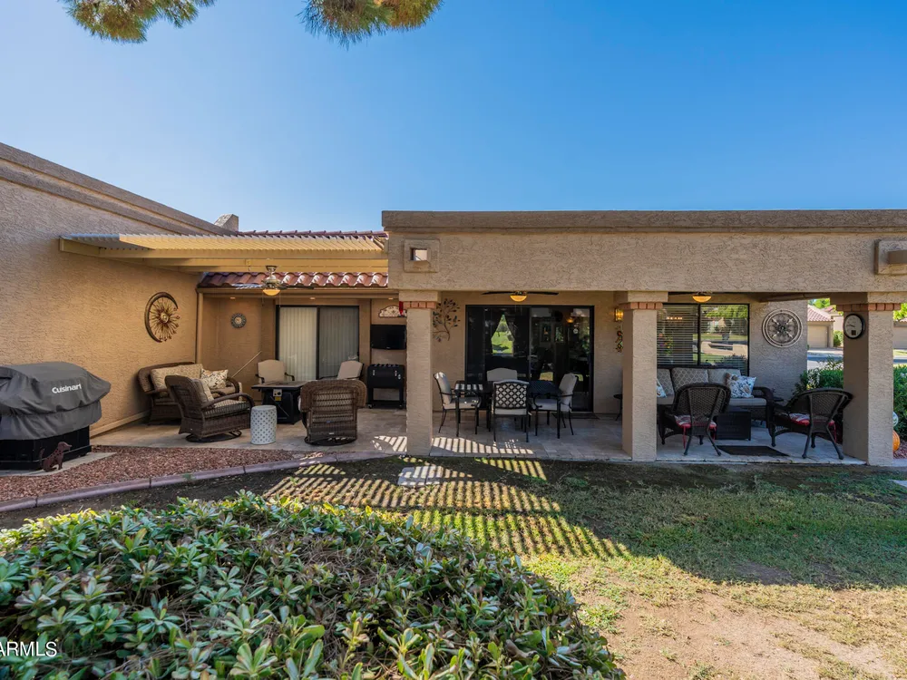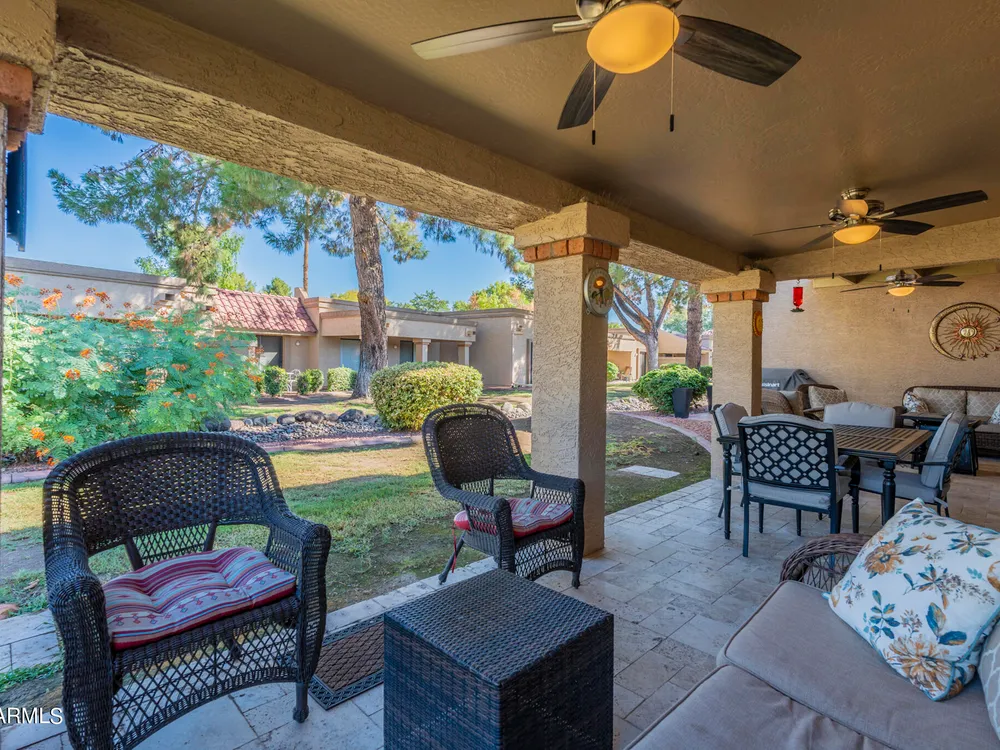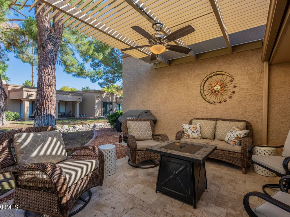 Welcome to Westbrook Village - where resort-style living meets everyday comfort! This beautifully updated 2-bedroom, 2-bath Casita is perfectly situated on a desirable corner lot. The open floor plan creates a natural flow between living spaces, combining style and convenience for easy living. Step outside to enjoy the elegance of new travertine tile and an adjustable pergola—ideal for relaxing or entertaining in any season. The private backyard offers tranquil views of the lush common area, providing a peaceful retreat, while the community pool is just steps away for a refreshing dip anytime. Westbrook Village residents enjoy an active, friendly lifestyle with access to two championship golf courses, two community centers, heated pools and spas, a fitness facility, pickleball