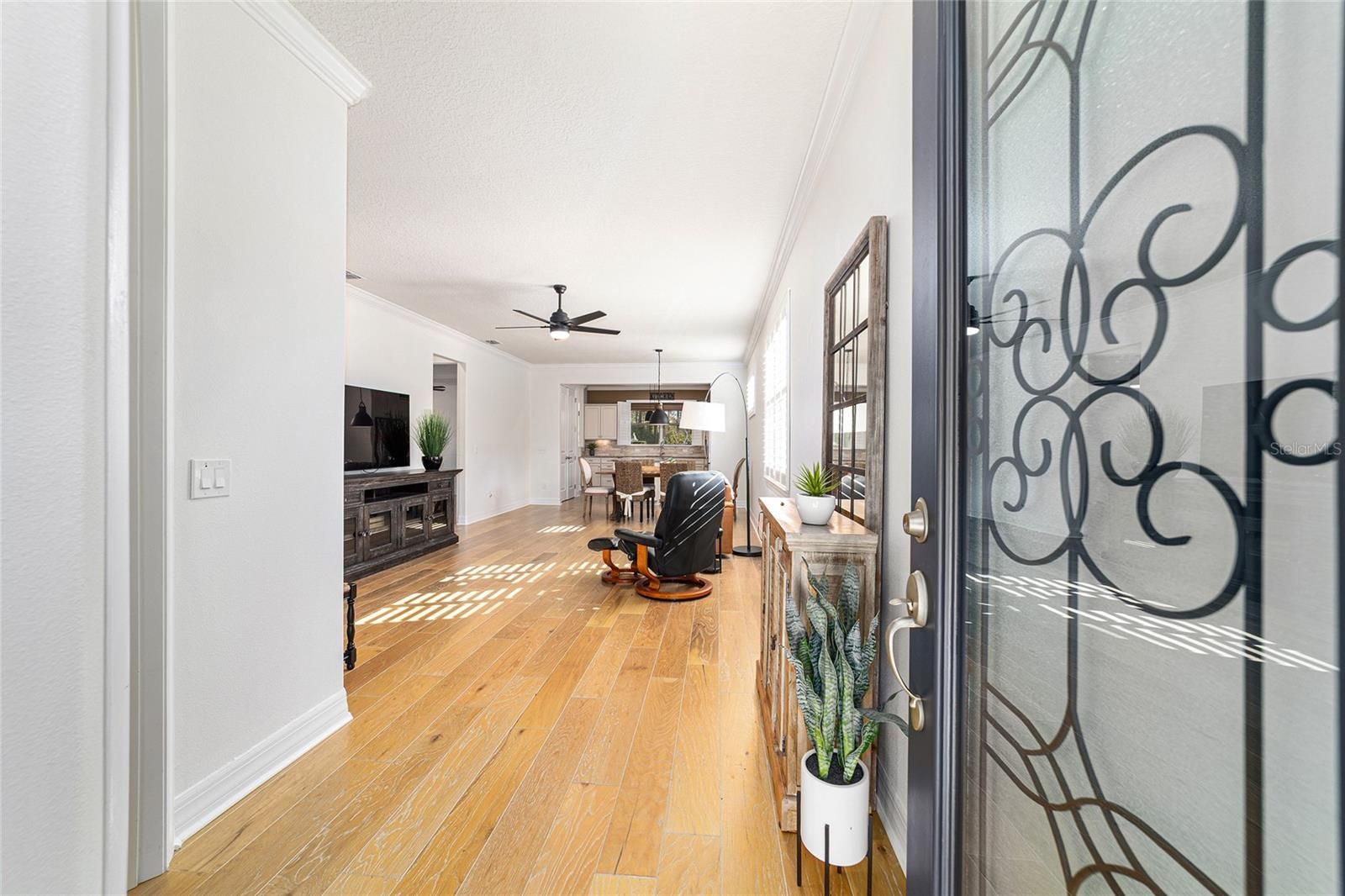 Welcome to this beautifully appointed 2-bedroom, 2-bath home with a versatile flex room and an extended 2-car garage, located in the highly desirable 55+ community of Del Webb Stonecreek. From the moment you arrive, you’ll be impressed by the exceptional curb appeal, storm door, and decorative glass front entry. Inside, an open-concept floor plan seamlessly connects the living, dining, and kitchen areas, creating an inviting space for both everyday living and entertaining. The kitchen features stainless steel appliances, granite countertops, brushed nickel fixtures, real wood cabinetry with under-cabinet lighting, a polished marble backsplash, and custom plantation shutters that overlook the extended screened-in patio. A sunroom extends off the kitchen and leads to the expansive 28-foot partially roofed, screened birdcage patio, offering privacy and views of the landscaped backyard. The spacious owner’s suite boasts of elegant tray ceilings, a large walk-in closet, and a luxurious en-suite bath with granite countertops, dual sinks, and a large walk-in shower with dual shower heads. The guest bedroom is thoughtfully set apart in its own private area near a full guest bath with a tiled shower and granite counters. Additional highlights include: crown molding, plantation style shutters, a new stove, 8-foot interior doors, 5¼-inch base moldings, recent interior paint, rounded drywall corners, upgraded light fixtures and ceiling fans, and a flex room perfect for an office, hobby space, or den. The extended garage features an epoxy-coated floor, storage shelving, sliding garage screen, remote free entry, and is pre-wired for a generator. The home also includes a house water softener and irrigation system. HOA benefits include: irrigation water, repair and maintenance as well as lawn and shrub maintenance. Del Webb Stonecreek offers an unmatched lifestyle with a state-of-the-art fitness center, spa, heated resort style pool, basketball, golf, pickleball, softball, tennis, scenic walking and biking paths, multiple clubhouses, and an on-site café and grill. This exceptional home offers so many upgrades and combines comfort, style with resort-style living—schedule your private showing today!