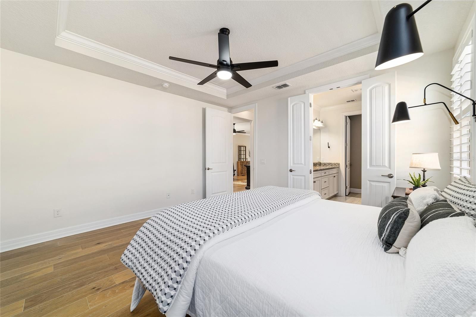 - Ceiling Fan(s), Crown Molding, Eat-in Kitchen, High Ceilings, Kitchen/Family Room Combo, Open Floorplan, In-Wall Pest Control, Main Level Primary, Solid-Wood Cabinets, Split Bedrooms, Stone Counters, Thermostat, Tray Ceiling(s), Walk-In Closet(s), Window Treatments