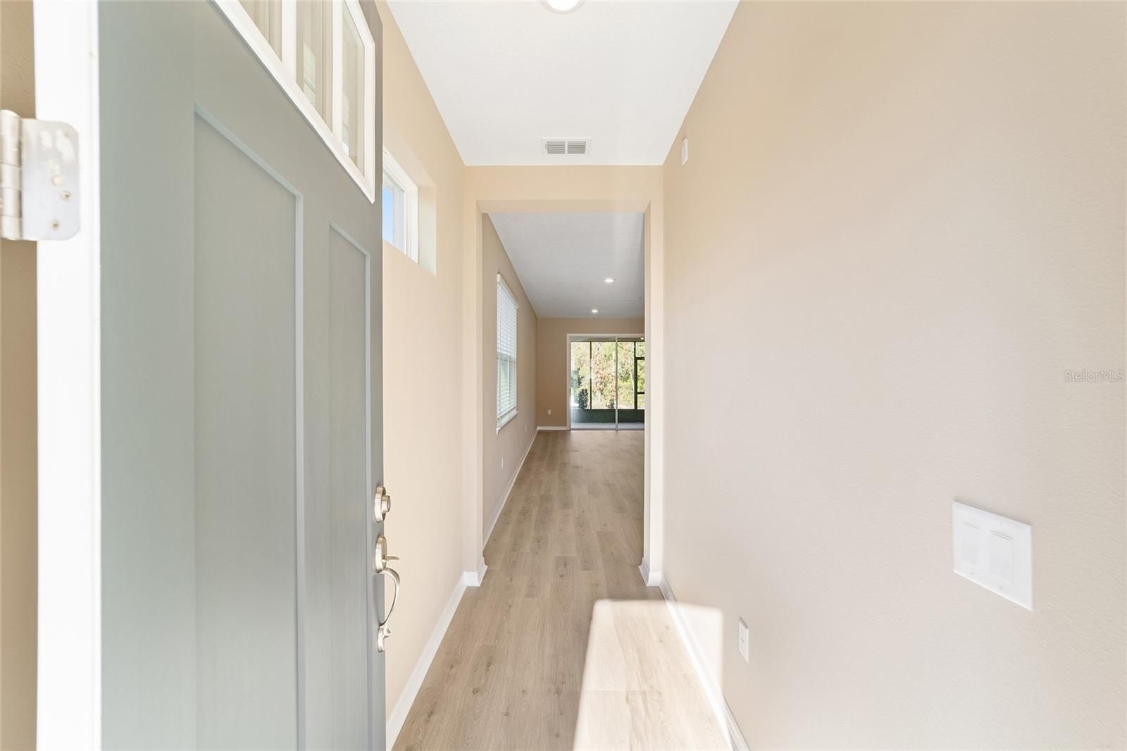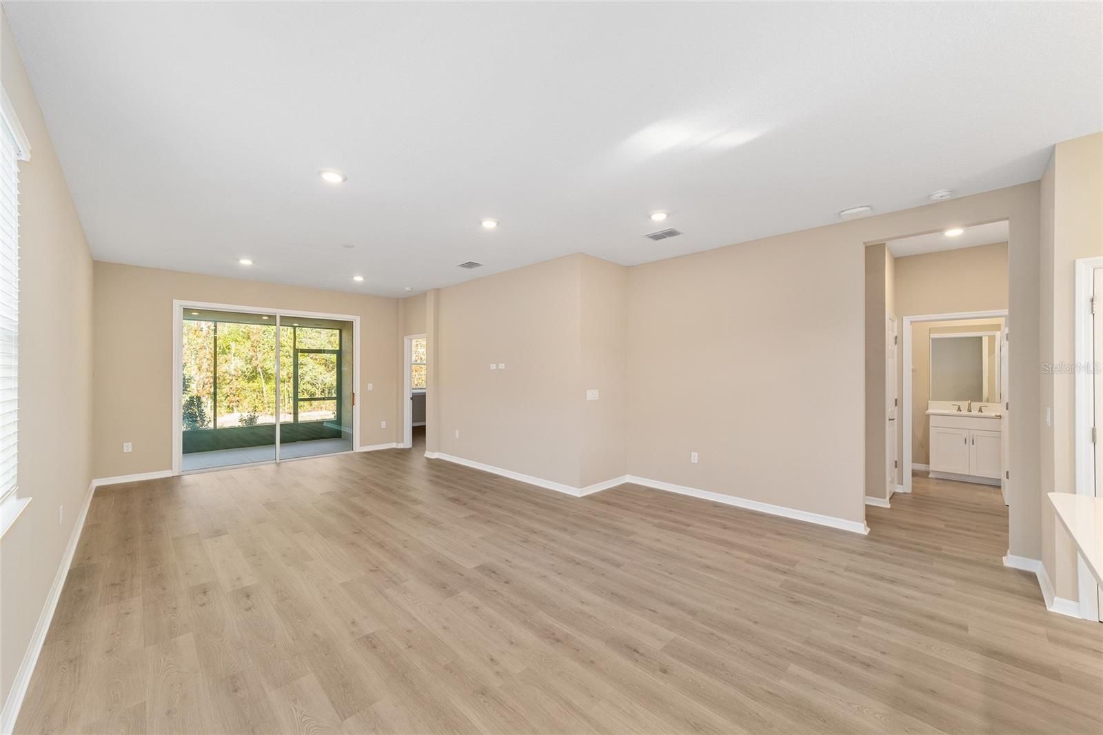 Discover exceptional new construction with this beautifully finished Oasis model, offering refined craftsmanship and a thoughtfully designed open layout perfect for modern living. The gourmet kitchen boasts pristine white shaker cabinetry, stainless steel appliances, a subway-tile backsplash, and an expansive peninsula that seamlessly connects to the spacious great room with elegant laminate flooring. The spa-inspired primary bath features dual quartz vanities, brushed-nickel fixtures, and a luxurious tiled walk-in shower with frameless glass. Neutral tones throughout create a bright, inviting atmosphere, while sliding glass doors lead to the private enclosed lanai overlooking peaceful wooded views with no rear neighbors. Additional highlights include a 2-car garage, dedicated laundry room, rear patio, covered entry, and energy-efficient construction—all situated within Ocala’s premier 55+ community, On Top of the World, renowned for its world-class amenities, recreational facilities, and active lifestyle.
