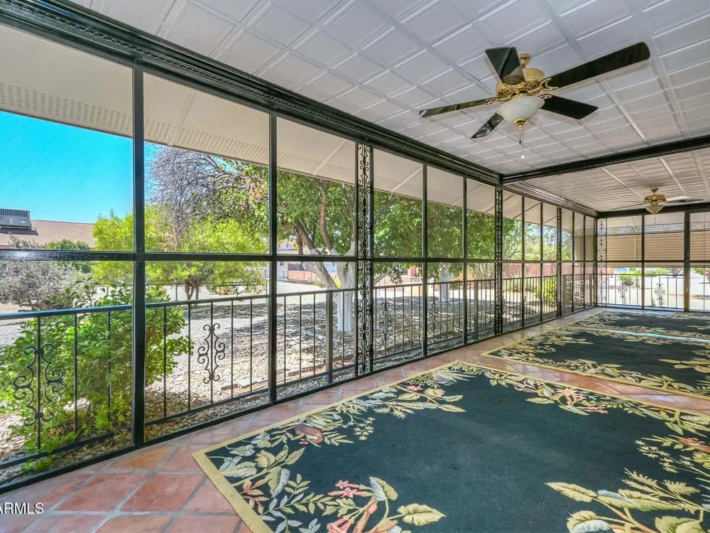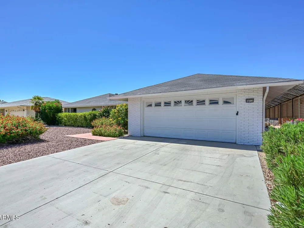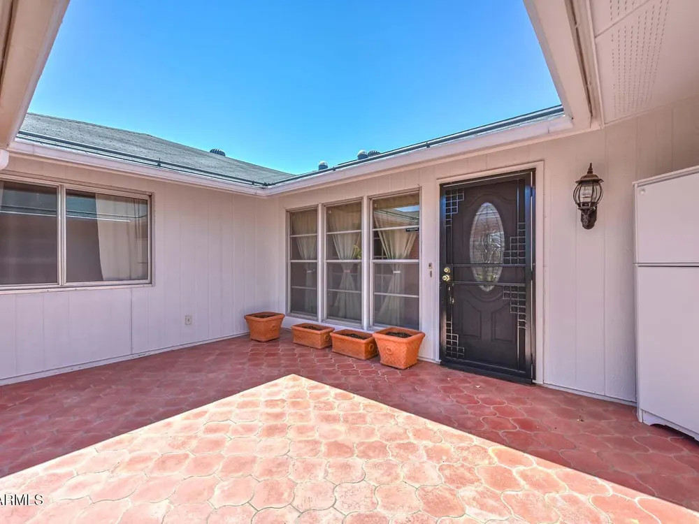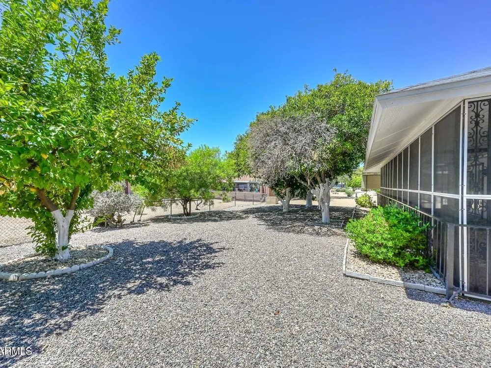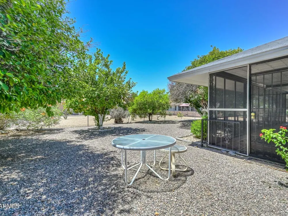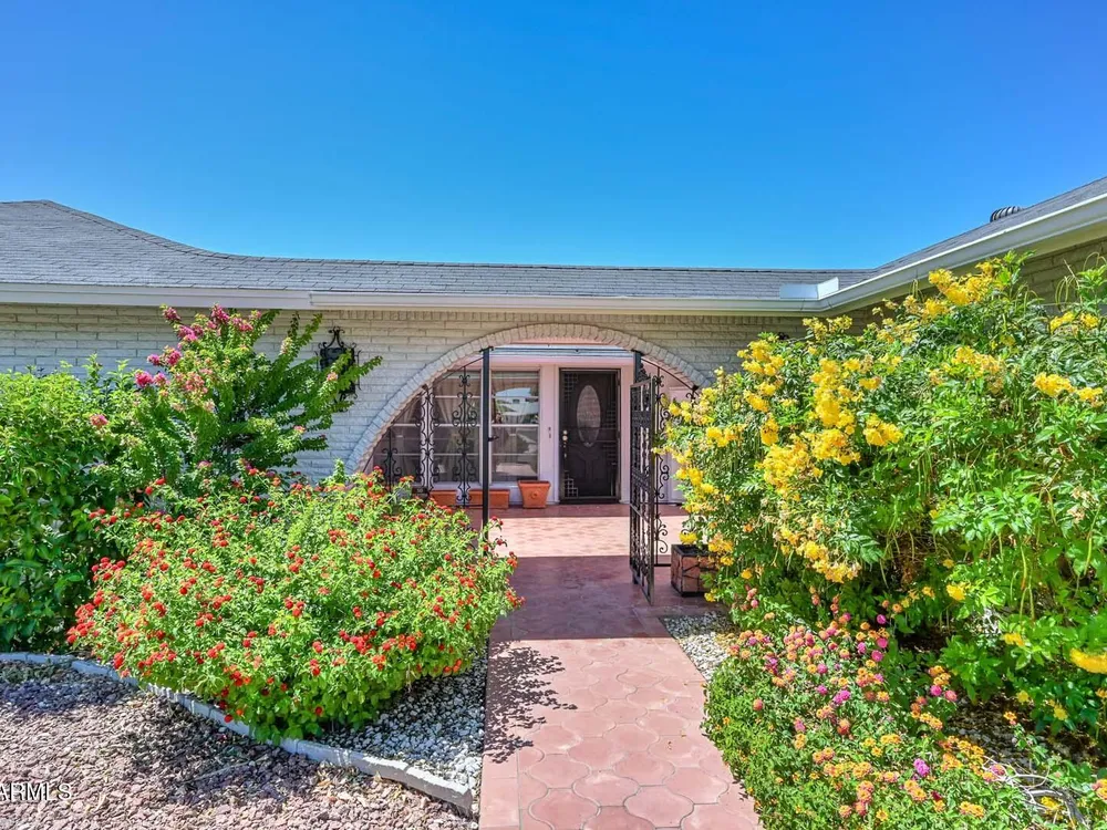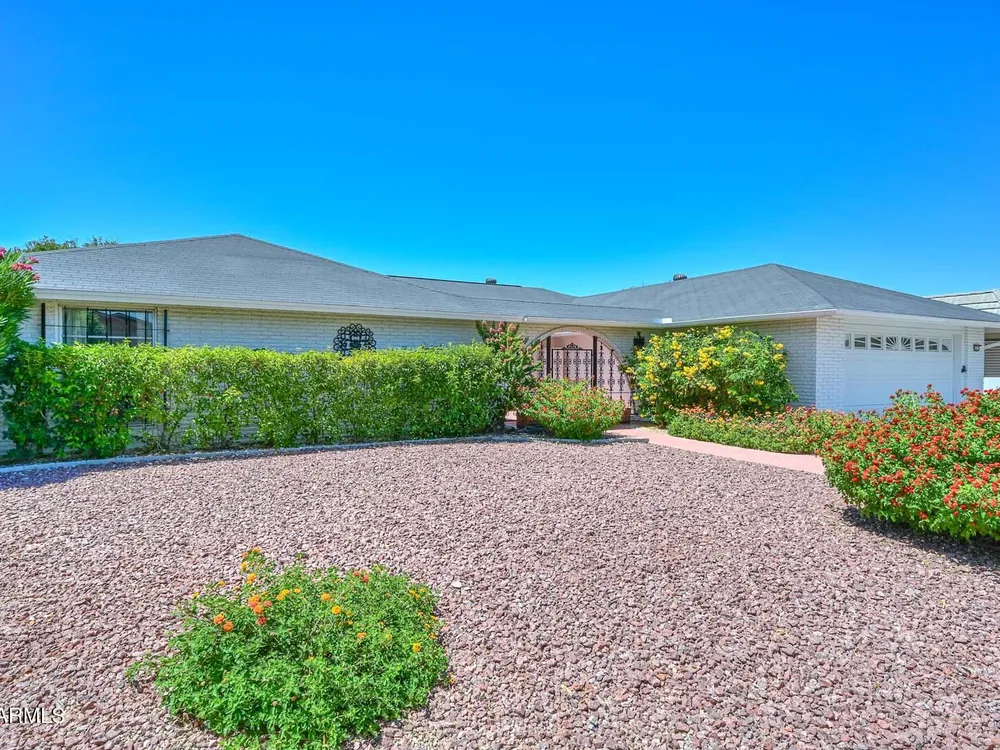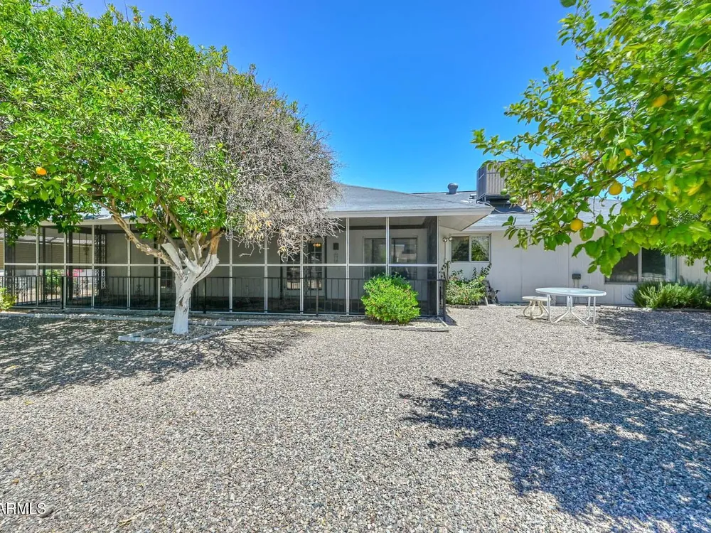 Beautiful upgraded N/S facing 3-bedroom home (with space for a 4th!) is in one of the most affordable & vibrant 55+ communities around. Step through a private courtyard into this updated popular split bdrm Castillo floor plan featuring newer AC, granite countertops, abundant kitchen cabinetry, crown molding, tile & wood flooring, a jumbo laundry room, peaceful screened-in patio, more storage than I've ever seen and your own fruit trees to sweeten the deal! And talk about location—you're just a quick golf cart cruise away from teeing off at two of our 8 community courses, pickleball & pools. Sun City's amenities are second to none: 8 recreation centers, 8 golf courses, 130+ clubs, sparkling pools, pickleball, tennis, concerts, bowling, and even our very own volunteer Posse keeping watch. This Castillo, split floor plan offers an unbelievable amount of storage with two walk-in closet in the primary suite, walk-in closets in 2nd & 3rd bedroom, wall to wall shelved closets in the living room, sitting/bonus/flex room and a huge hobby/laundry room could be a workshop for any craft you have in mind. 55+ but not ready to retire?.. Good news! Short & long term rentals are permitted. Whether you're chasing birdies or simply basking in the good life, this home scores a hole-in-one!