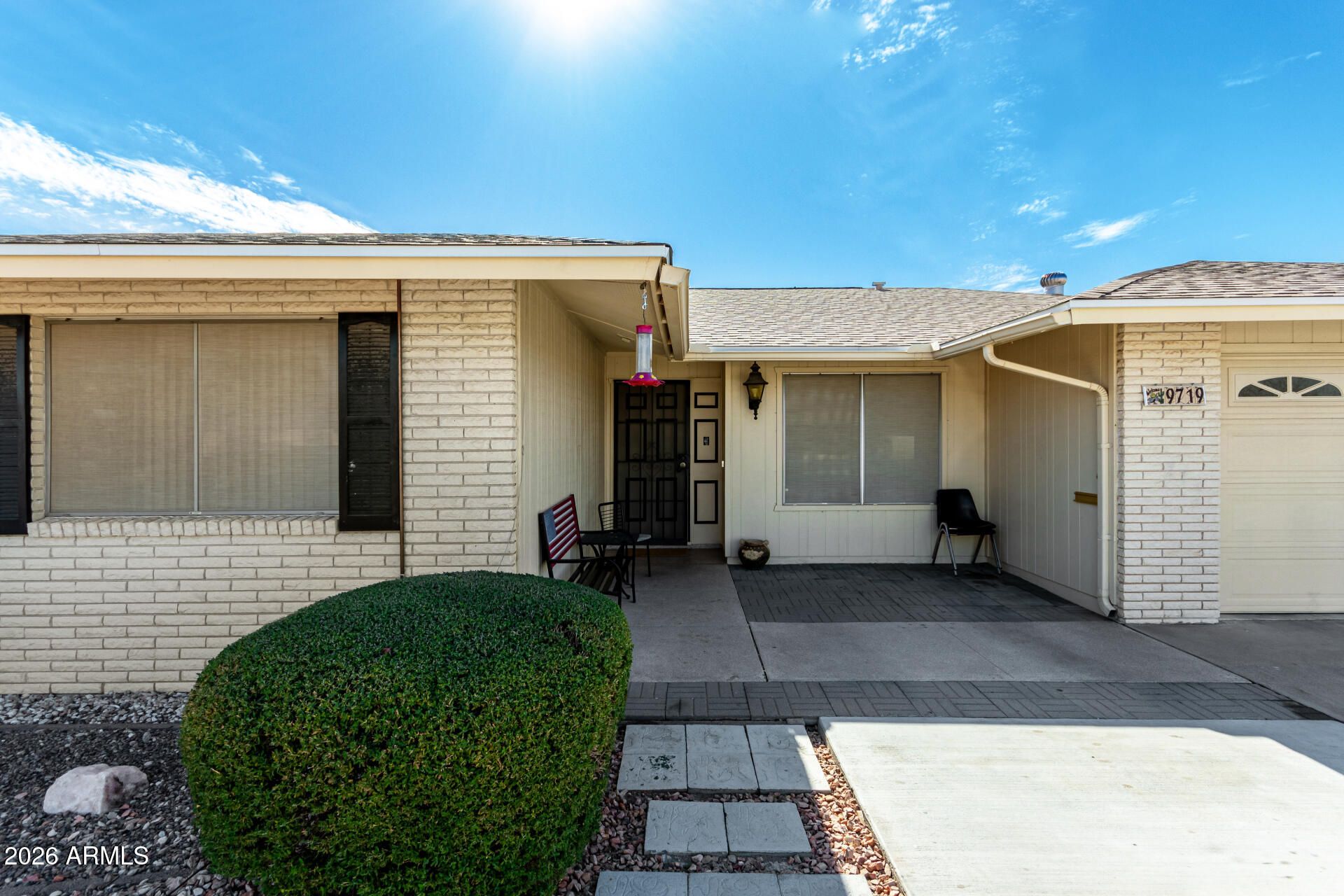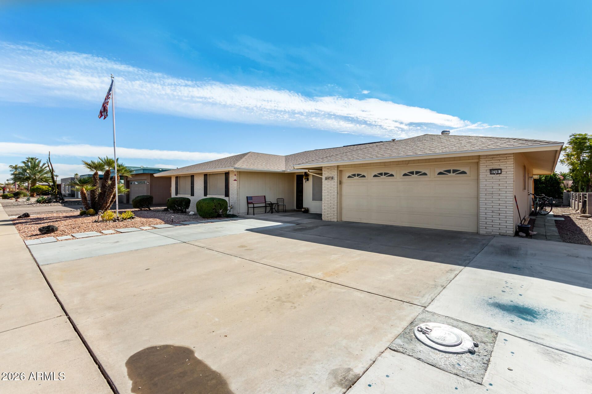 SHORT SALE! Seller will NOT do a Sub 2, please do not ask. Potential assumable VA loan (to VA Buyers) at only 5.479%. Leased Solar system to help with Electric bills. Extended driveway front parking. Clean 3 bed/2 bath home with all new carpet in the popular active adult community of Sun City. Low maintenance desert landscaping & open front courtyard. Spacious living room with extra living space in the family room with sliders to back patio. Galley kitchen with white cabinetry & lots of counter space & eat in Kitchen area with large picture window. Owner's Suite bedroom has large walk-in closet & dressing area with seated vanity. Bathroom has large shower with multiple grab bars. Other 2 bedrooms both have nice size closets. 2 car garage with golf cart parking has lots of cabinet storage & a utility sink. Nice Sized backyard, covered patio with extended open patio area & tons of healthy, producing citrus trees great for shade.