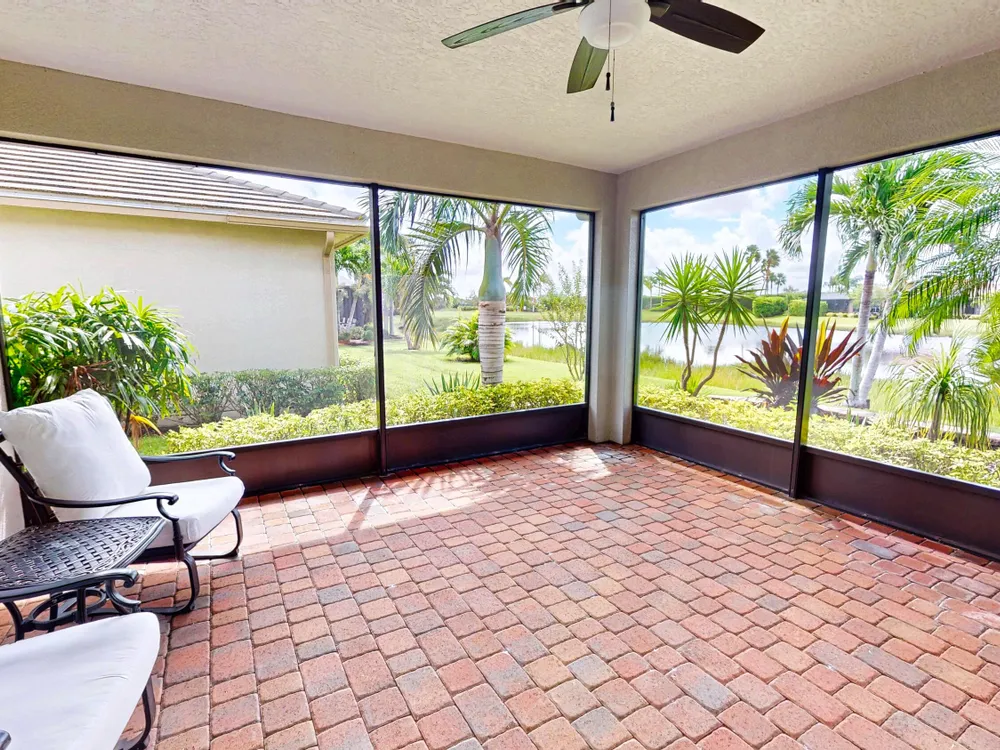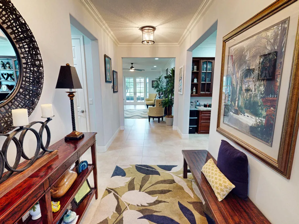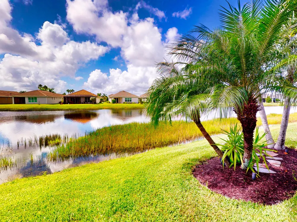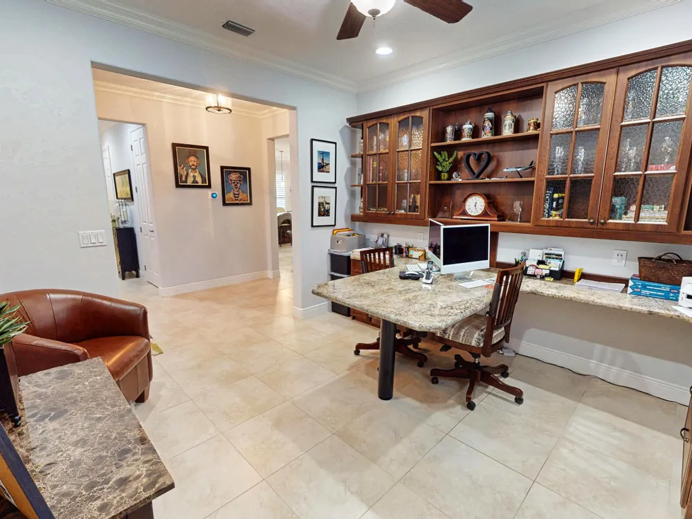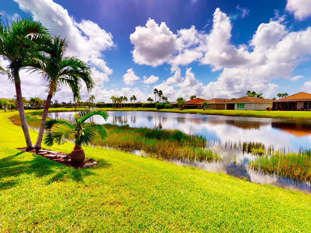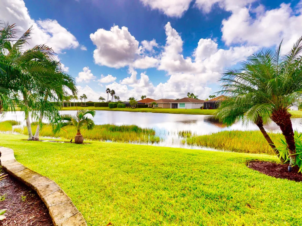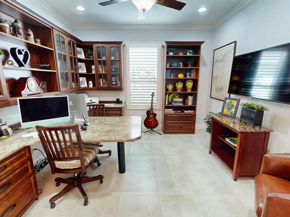 This beautifully appointed 2-bedroom, 2-bath home with a den offers over 2100 sq. ft. of luxurious living space and impeccable design throughout. The open floor plan features a spacious great room that flows seamlessly into the dining area and gourmet kitchen, complete with quartz countertops, 42-inch cabinets, and an upgraded gas range. Unique double glass French doors lead to an extended, covered lanai where you can enjoy stunning lake views and lush, upgraded landscaping, the perfect setting for entertaining or quiet relaxation. The home showcases elegant details such as crown molding, custom cabinetry, a barrel tile roof, and impact windows for peace of mind. The den includes built-in dual desks and cabinets, ideal for a home office or creative space.