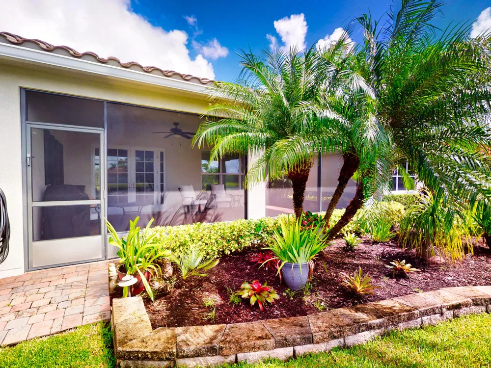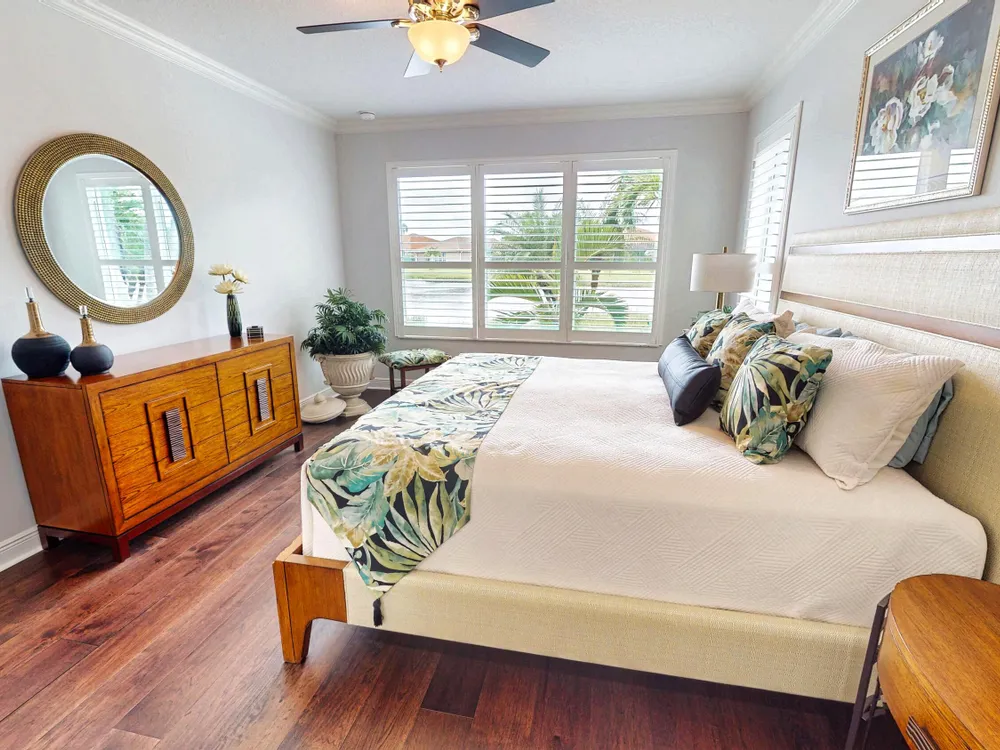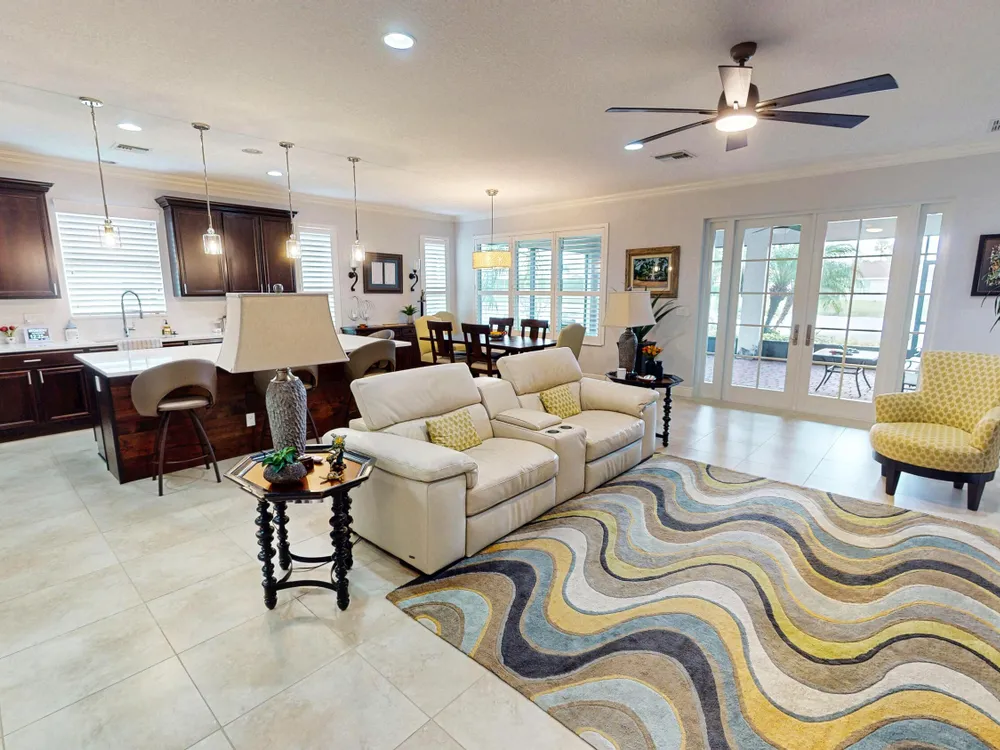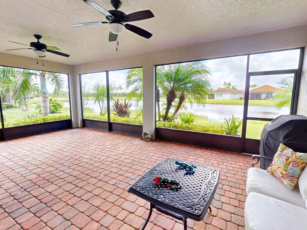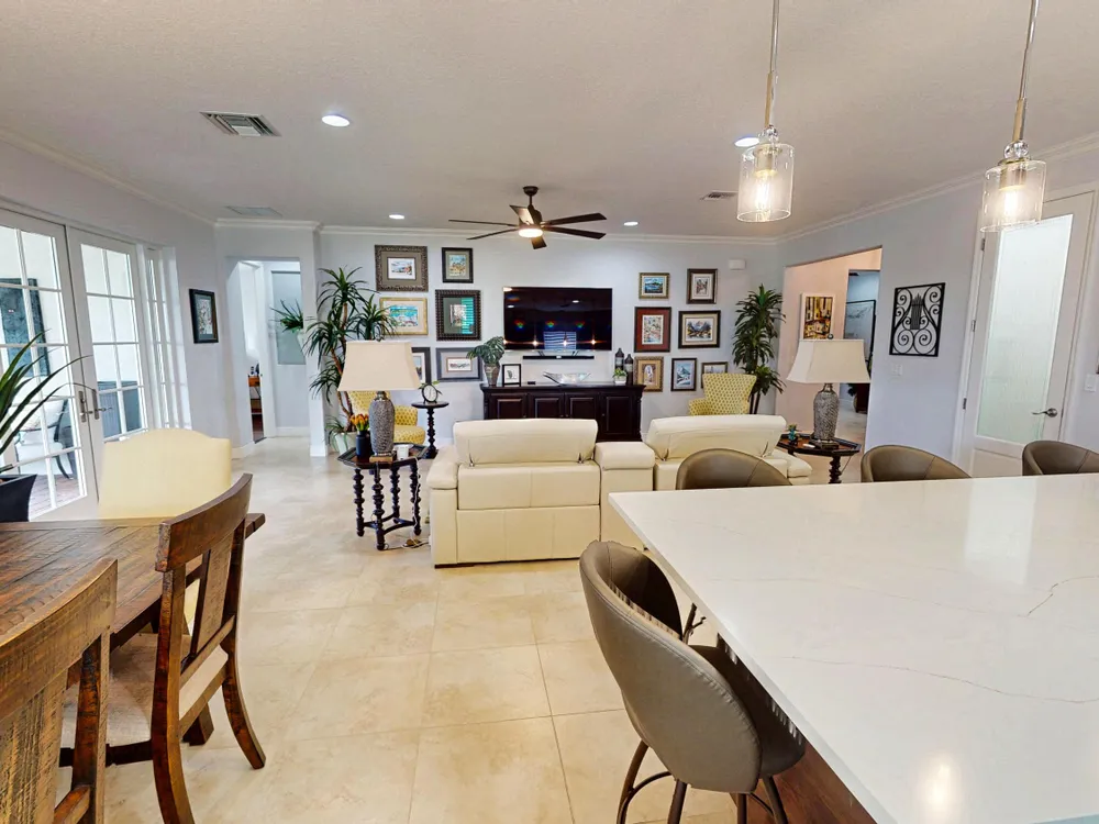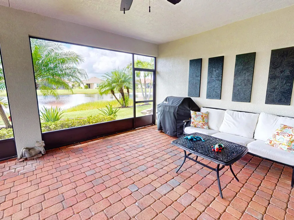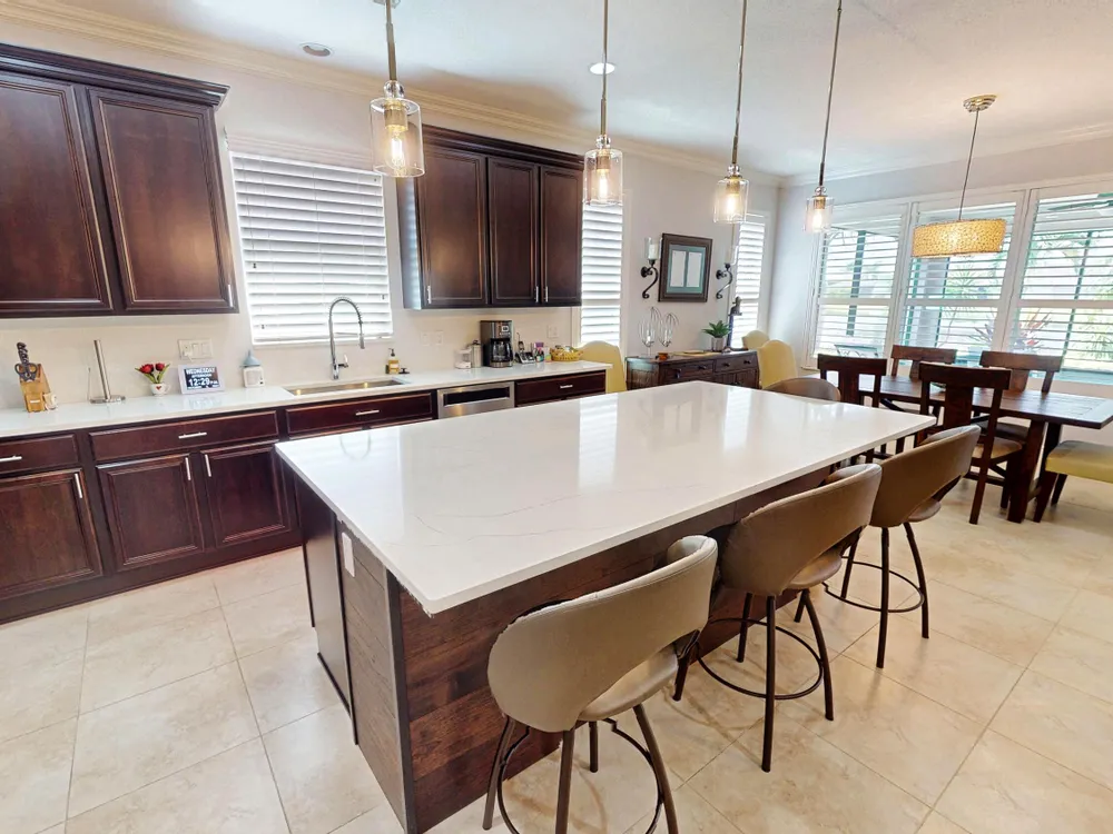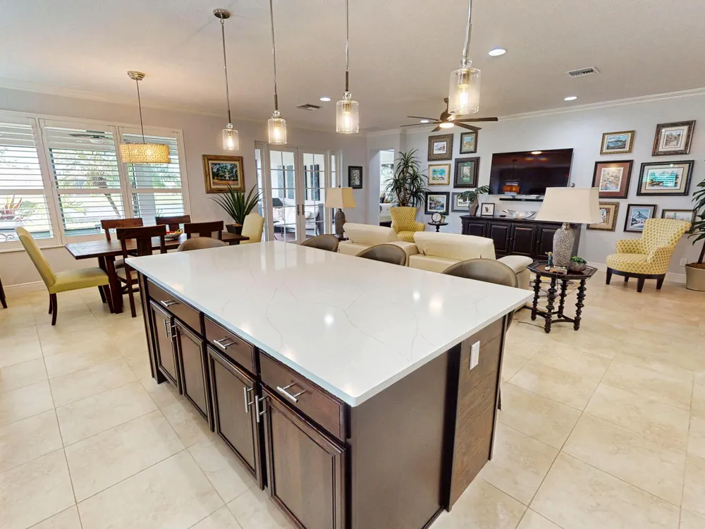 This beautifully appointed 2-bedroom, 2-bath home with a den offers over 2100 sq. ft. of luxurious living space and impeccable design throughout. The open floor plan features a spacious great room that flows seamlessly into the dining area and gourmet kitchen, complete with quartz countertops, 42-inch cabinets, and an upgraded gas range. Unique double glass French doors lead to an extended, covered lanai where you can enjoy stunning lake views and lush, upgraded landscaping, the perfect setting for entertaining or quiet relaxation. The home showcases elegant details such as crown molding, custom cabinetry, a barrel tile roof, and impact windows for peace of mind. The den includes built-in dual desks and cabinets, ideal for a home office or creative space.