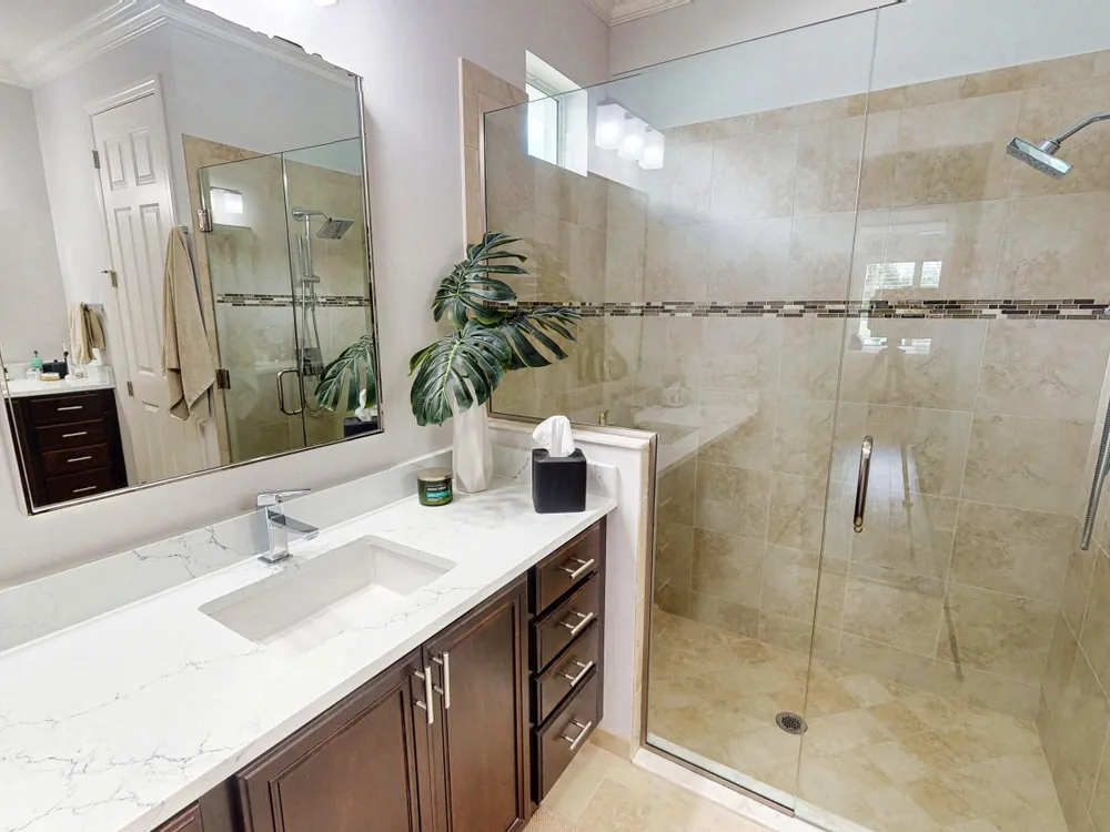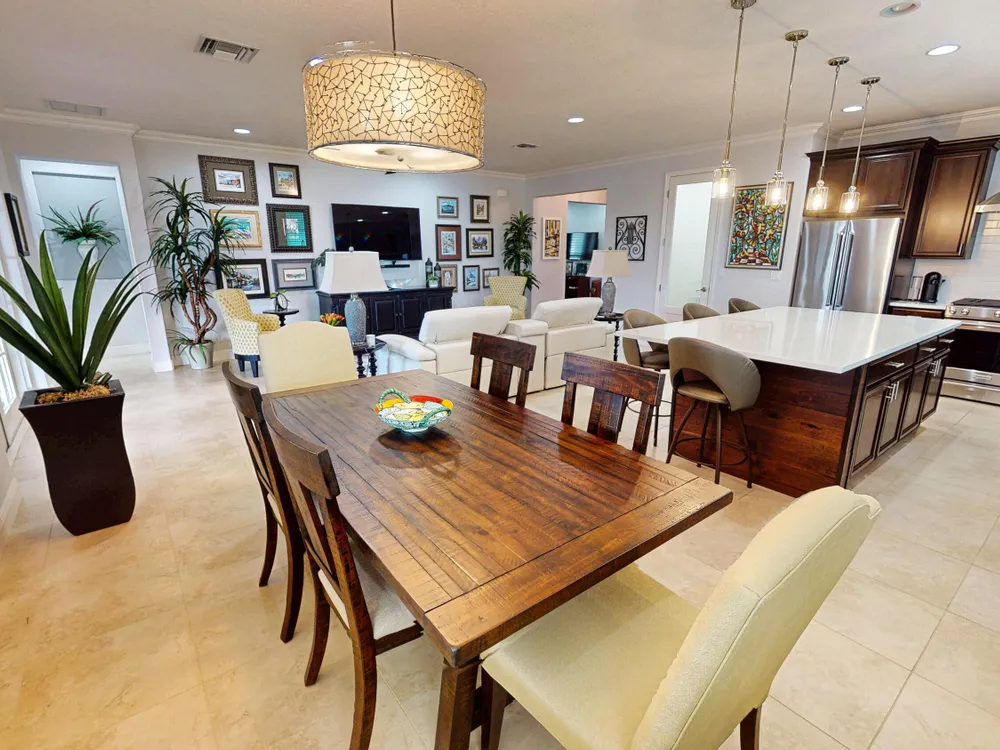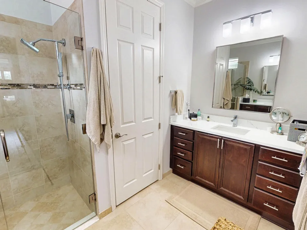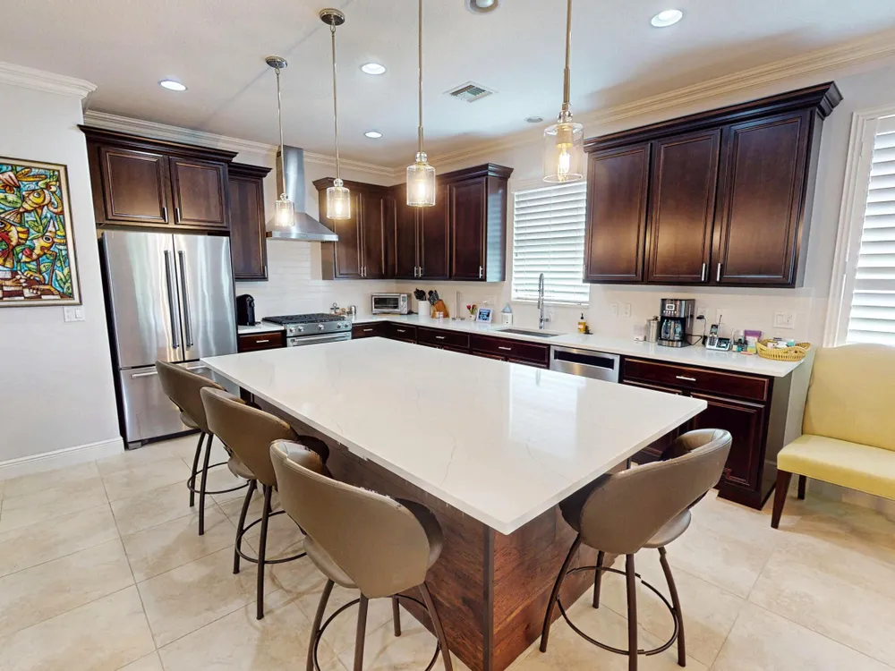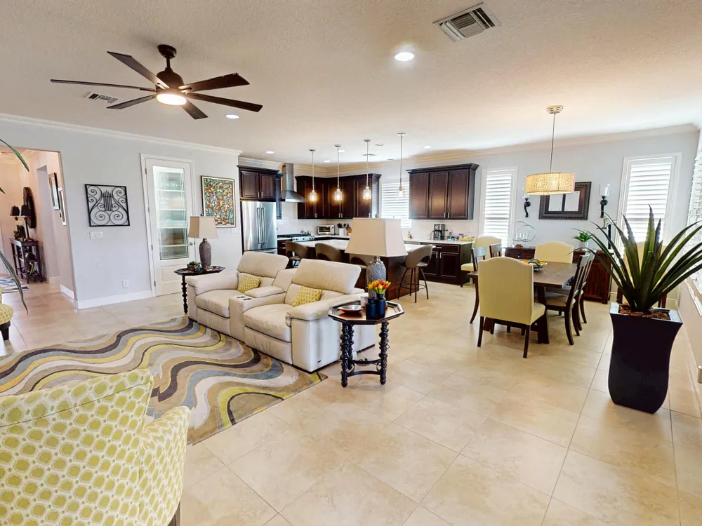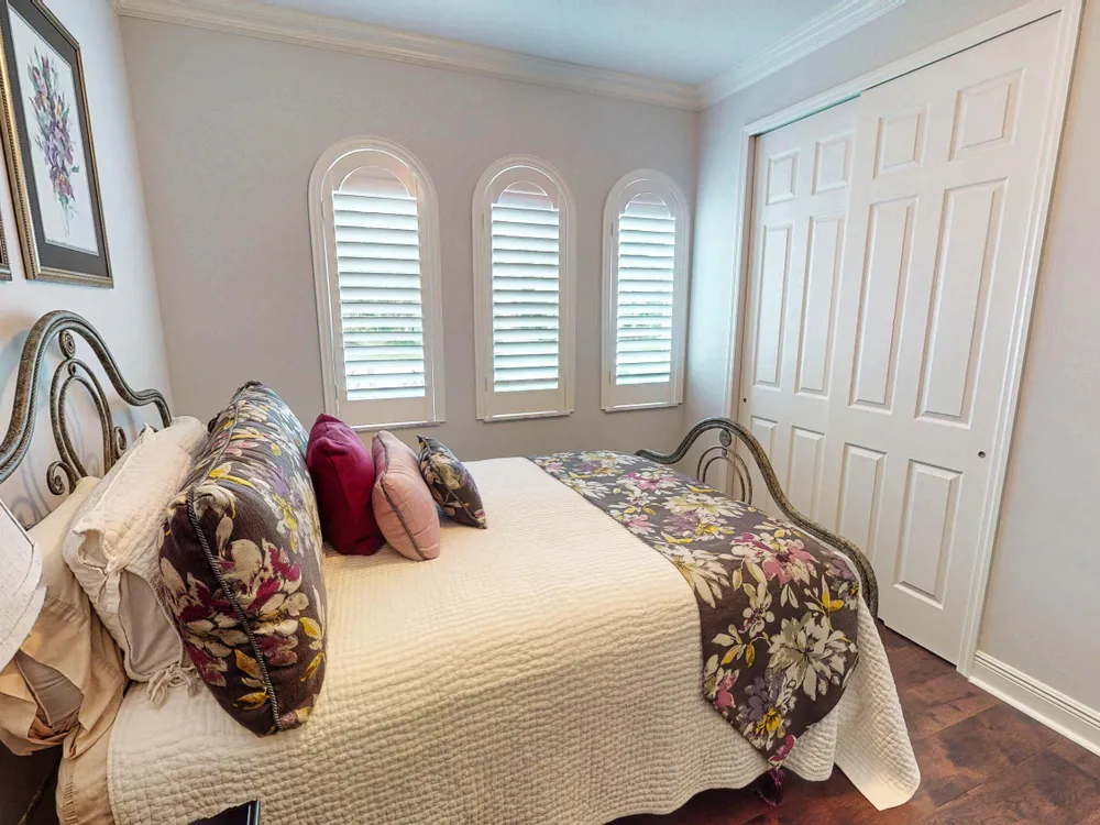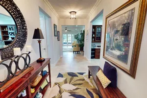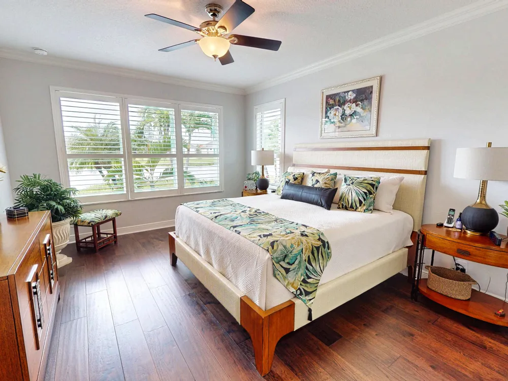 This beautifully appointed 2-bedroom, 2-bath home with a den offers over 2100 sq. ft. of luxurious living space and impeccable design throughout. The open floor plan features a spacious great room that flows seamlessly into the dining area and gourmet kitchen, complete with quartz countertops, 42-inch cabinets, and an upgraded gas range. Unique double glass French doors lead to an extended, covered lanai where you can enjoy stunning lake views and lush, upgraded landscaping, the perfect setting for entertaining or quiet relaxation. The home showcases elegant details such as crown molding, custom cabinetry, a barrel tile roof, and impact windows for peace of mind. The den includes built-in dual desks and cabinets, ideal for a home office or creative space.