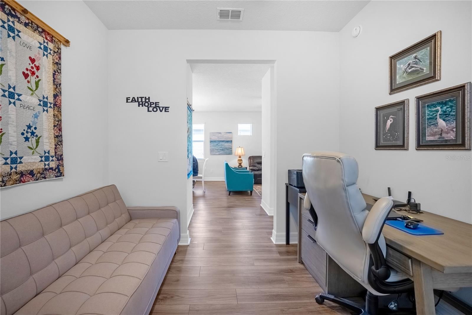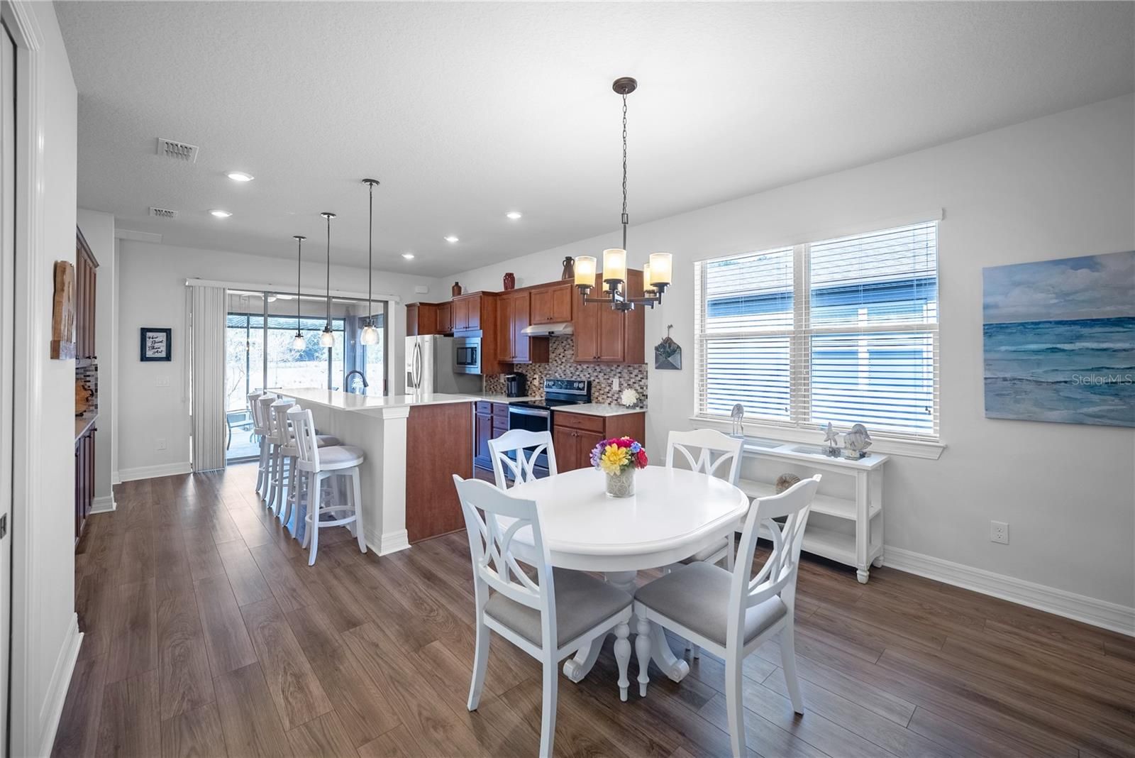 Welcome to this beautifully maintained Crestview model located in the highly sought-after Del Webb Stone Creek community. This 2-bedroom, 2-bath home with a versatile flex room has been gently lived in, used only a few months each year, and shows like new—no pets and no smoking. Luxury vinyl plank flooring flows throughout the home, complemented by high baseboards and ceiling fans in every room. The open kitchen is both stylish and functional, featuring an additional wall of cabinetry for exceptional storage and seamless flow into the main living areas. The spacious primary suite offers a spa-like retreat with a large tiled walk-in shower and a convenient laundry chute directly to the laundry room. The secondary bathroom also features a tiled shower, perfect for guests. The flex room includes a closet for added storage, making it ideal as a home office, hobby room, or guest space. Enjoy peaceful outdoor living with a screened-in extended lanai overlooking a serene pasture, plus an extended paver patio—perfect for relaxing or entertaining. A decorative glass-inset front door fills the home with natural light, adding to its bright and welcoming feel. The laundry room is well-appointed with cabinetry and a utility sink for added convenience. Located in Stone Creek, Ocala’s premier 55+ gated community, residents enjoy world-class amenities including a championship 18-hole golf course, resort-style indoor and outdoor heated pools, fitness center, pickleball, tennis, softball, walking trails, clubs, activities, and a full-service restaurant and bar. This home offers the perfect blend of comfort, style, and resort-style living—move-in ready and truly a must-see.