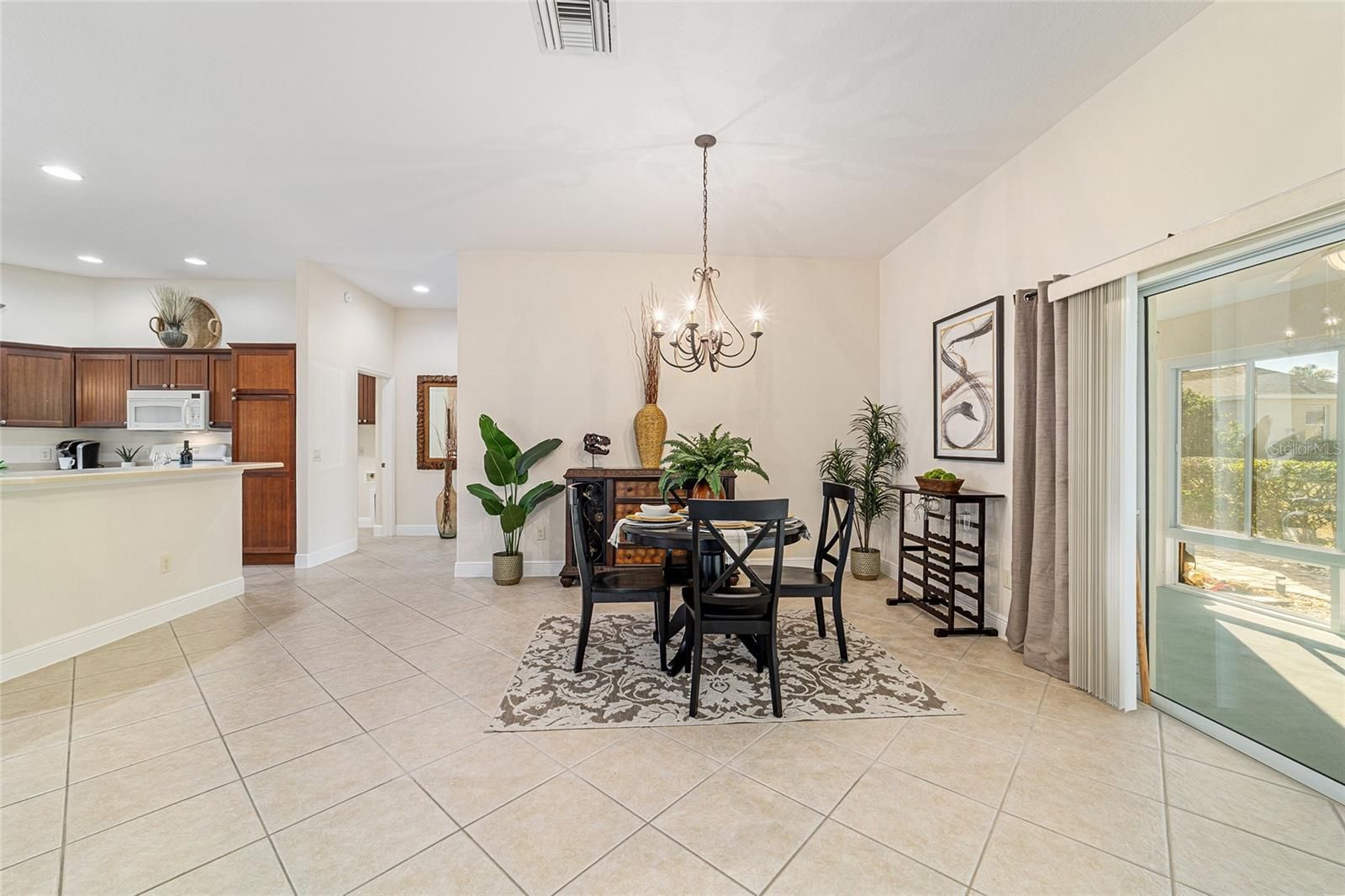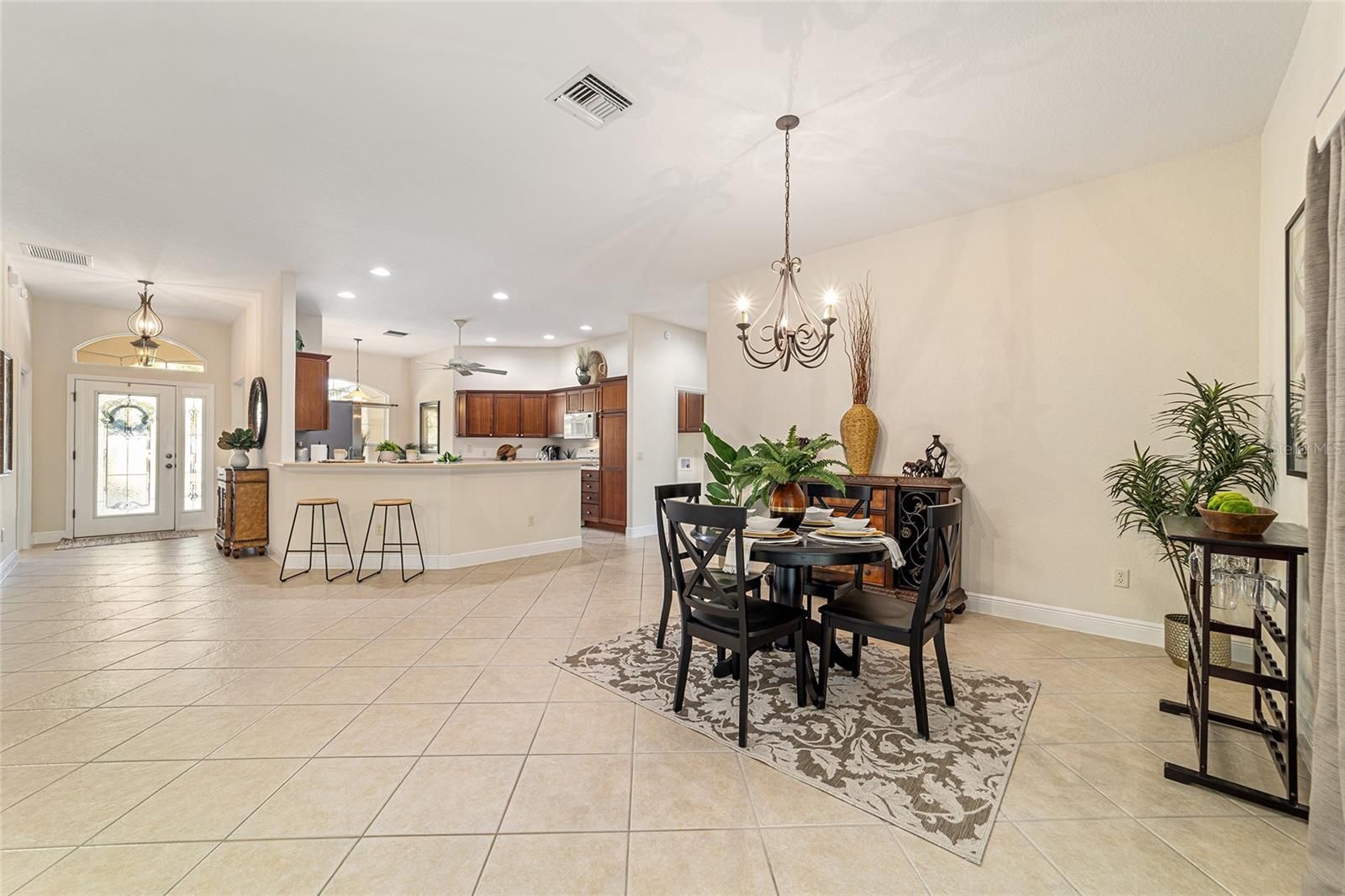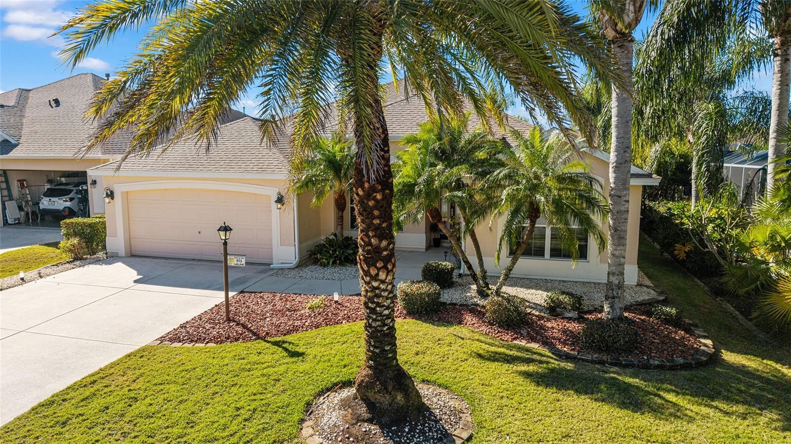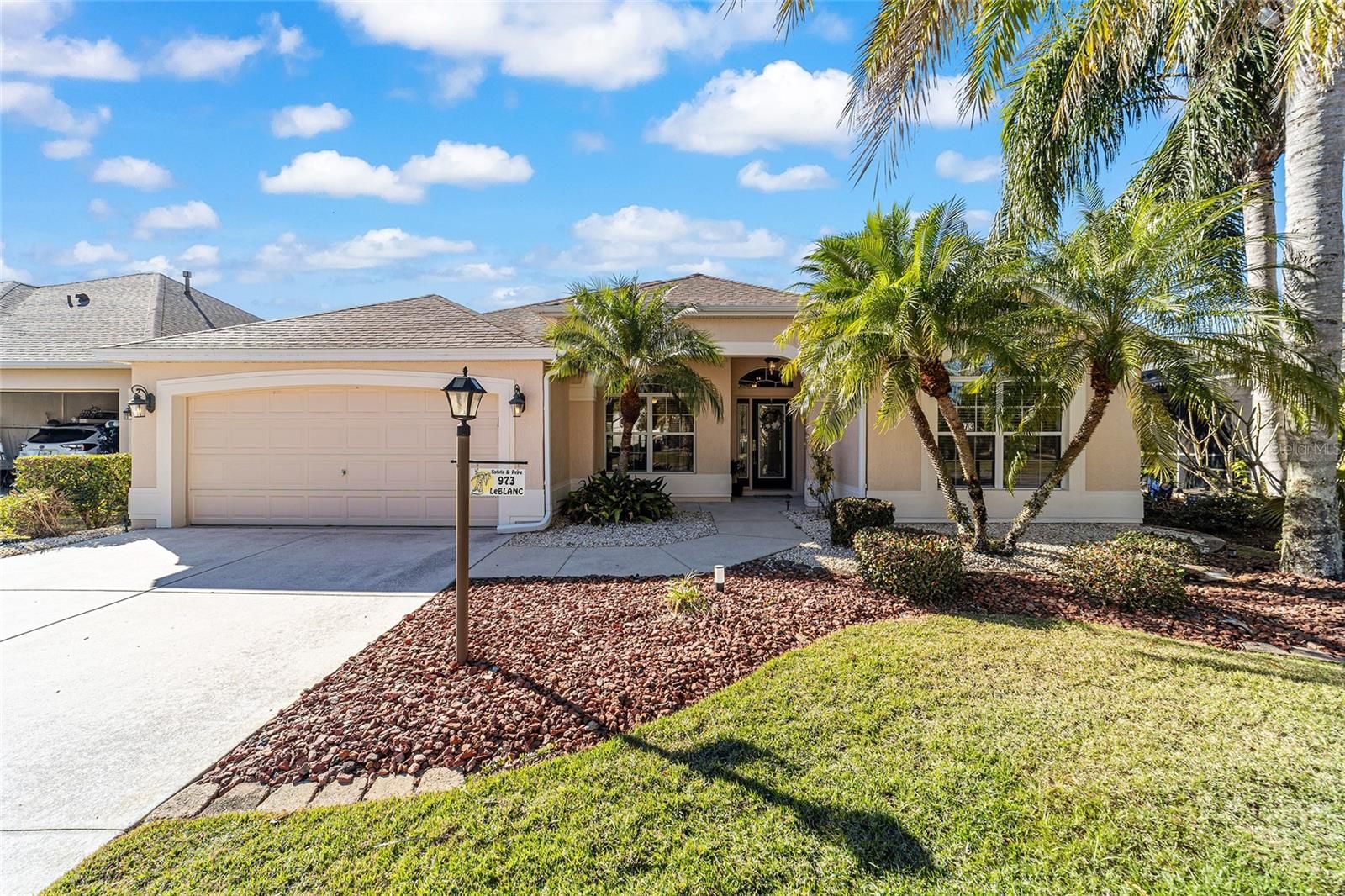 One or more photo(s) has been virtually staged. Welcome to your private retreat in the Village of Largo within The Villages, where elevated design meets effortless Florida living. This beautifully appointed 3-bedroom, 2-bath modified Gardenia model offers a bright, open-concept floorplan ideal for both entertaining and everyday comfort. Spacious living and dining areas flow seamlessly into the heart of the home, creating an inviting atmosphere filled with natural light. With easy care flooring throughout the home, the open floorplan provides plenty of room for everyone. The dining area is perfect for both formal and informal dining, and the breakfast area will allow you to start your days with plenty of light as you enjoy your morning coffee. The kitchen has beautiful wood cabinets, Corian countertops, and lots of storage! This 3 bedroom 2 bath home offers a convenient split bedroom layout, and the generously sized bedrooms provide peaceful retreats for guests, hobbies, or a home office. The primary suite is thoughtfully designed for relaxation and privacy. Enjoy the luxury of two walk-in master closets, offering exceptional storage and organization, and an en-suite bathroom with a large walk in shower, as well as separate vanity areas. Surrounded by swaying palm trees, this home captures the essence of resort-style living—where mornings are tranquil, afternoons are active, and evenings are best spent unwinding in comfort on your oversized lanai, with privacy landscaping surrounding the back of the home. Located within one of the country’s most sought-after 55+ communities, residents enjoy access to world-class amenities, recreation, dining, and entertainment. This is more than a home—it’s a lifestyle defined by comfort, elegance, and ease.