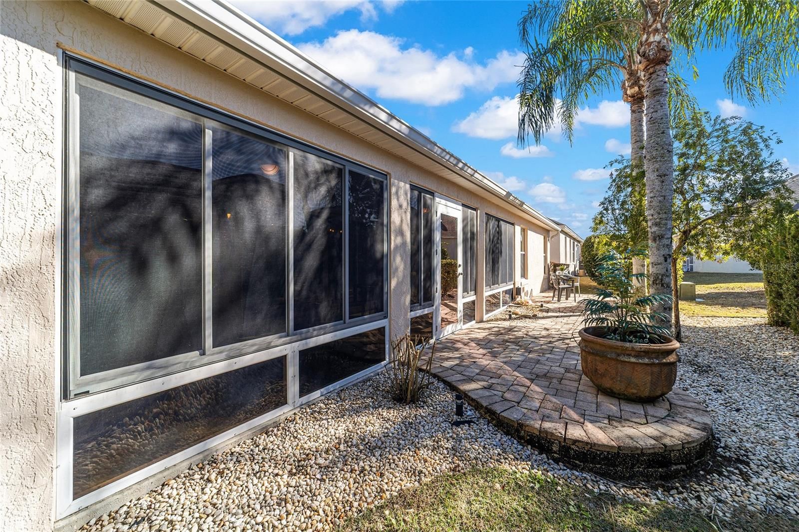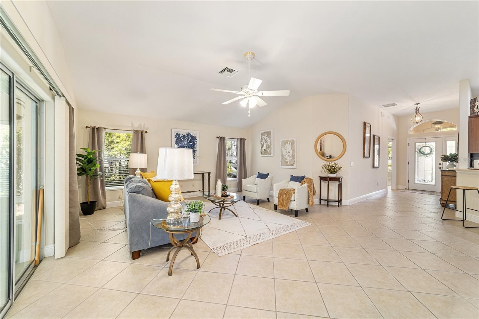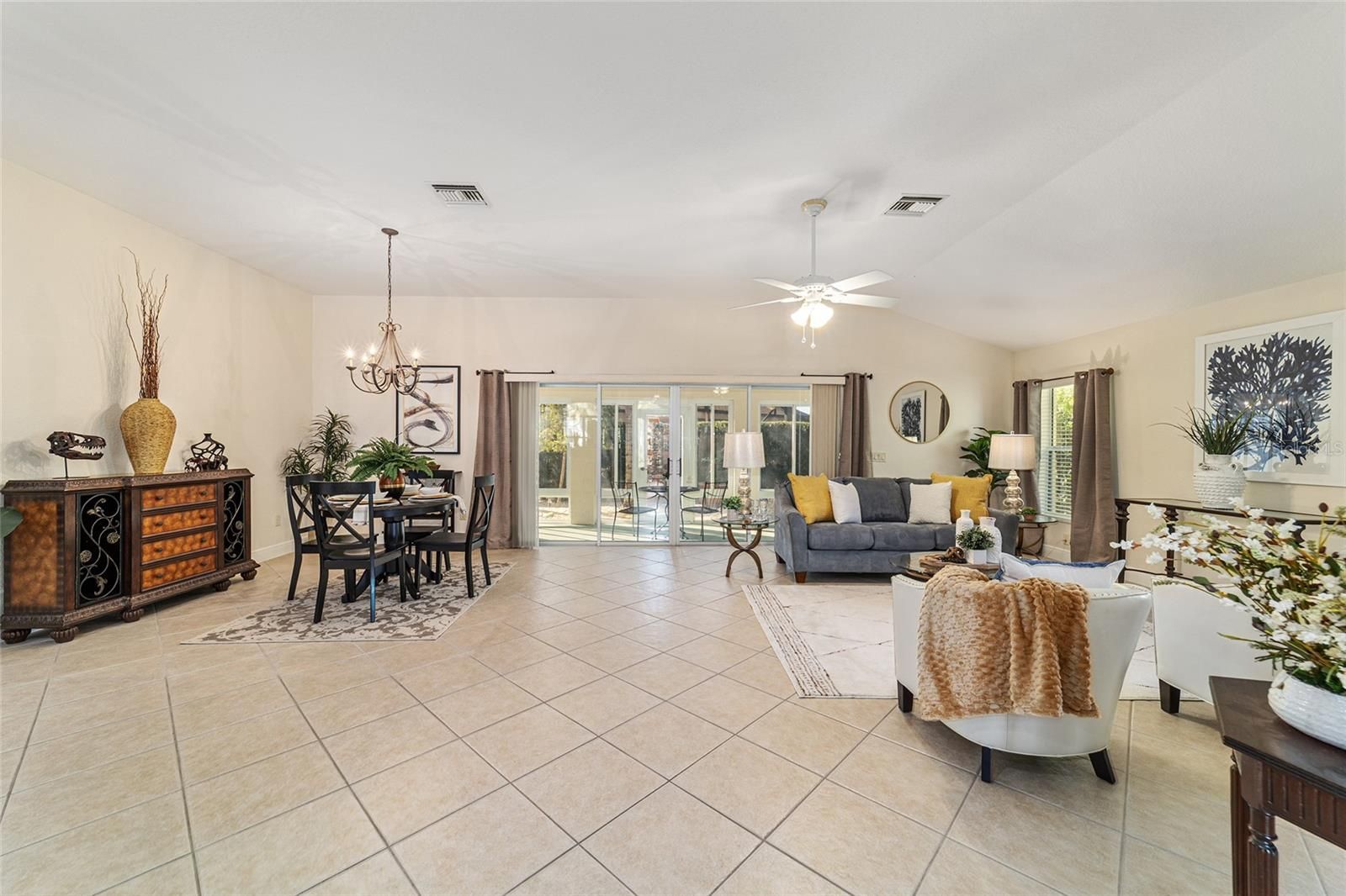 One or more photo(s) has been virtually staged. Welcome to your private retreat in the Village of Largo within The Villages, where elevated design meets effortless Florida living. This beautifully appointed 3-bedroom, 2-bath modified Gardenia model offers a bright, open-concept floorplan ideal for both entertaining and everyday comfort. Spacious living and dining areas flow seamlessly into the heart of the home, creating an inviting atmosphere filled with natural light. With easy care flooring throughout the home, the open floorplan provides plenty of room for everyone. The dining area is perfect for both formal and informal dining, and the breakfast area will allow you to start your days with plenty of light as you enjoy your morning coffee. The kitchen has beautiful wood cabinets, Corian countertops, and lots of storage! This 3 bedroom 2 bath home offers a convenient split bedroom layout, and the generously sized bedrooms provide peaceful retreats for guests, hobbies, or a home office. The primary suite is thoughtfully designed for relaxation and privacy. Enjoy the luxury of two walk-in master closets, offering exceptional storage and organization, and an en-suite bathroom with a large walk in shower, as well as separate vanity areas. Surrounded by swaying palm trees, this home captures the essence of resort-style living—where mornings are tranquil, afternoons are active, and evenings are best spent unwinding in comfort on your oversized lanai, with privacy landscaping surrounding the back of the home. Located within one of the country’s most sought-after 55+ communities, residents enjoy access to world-class amenities, recreation, dining, and entertainment. This is more than a home—it’s a lifestyle defined by comfort, elegance, and ease.
