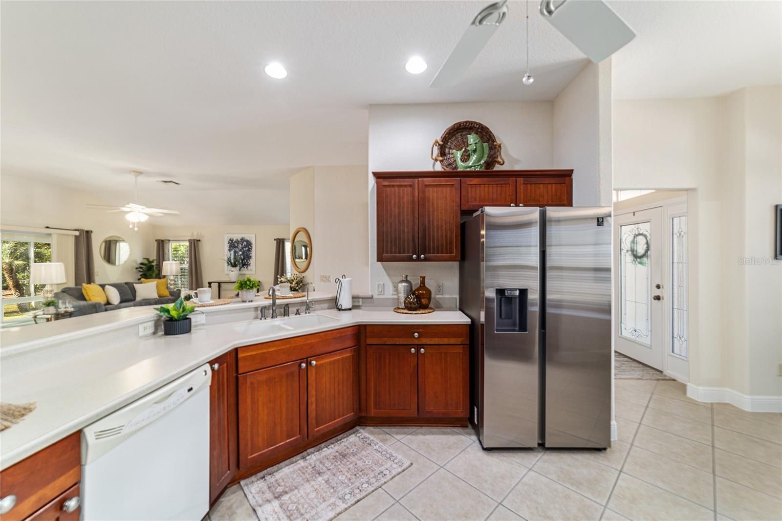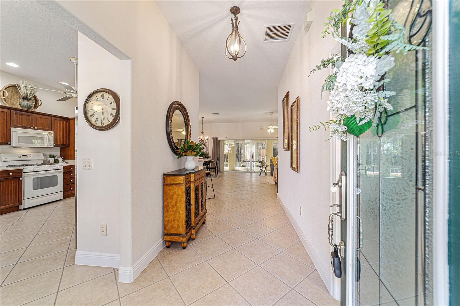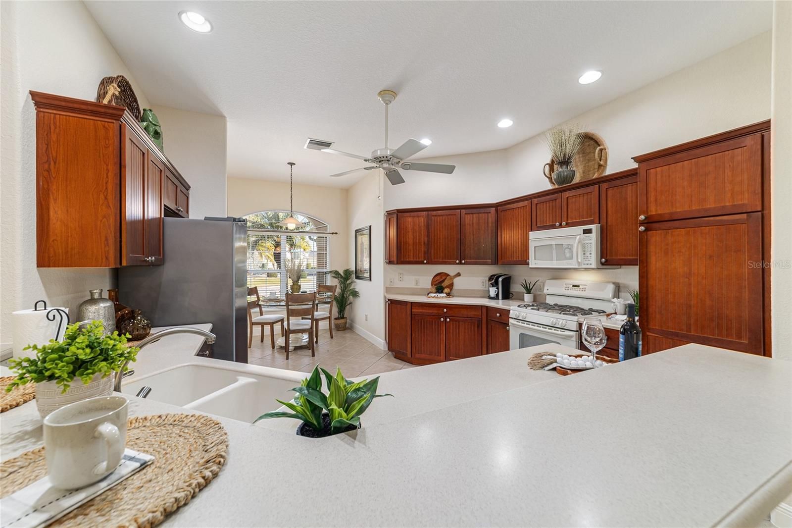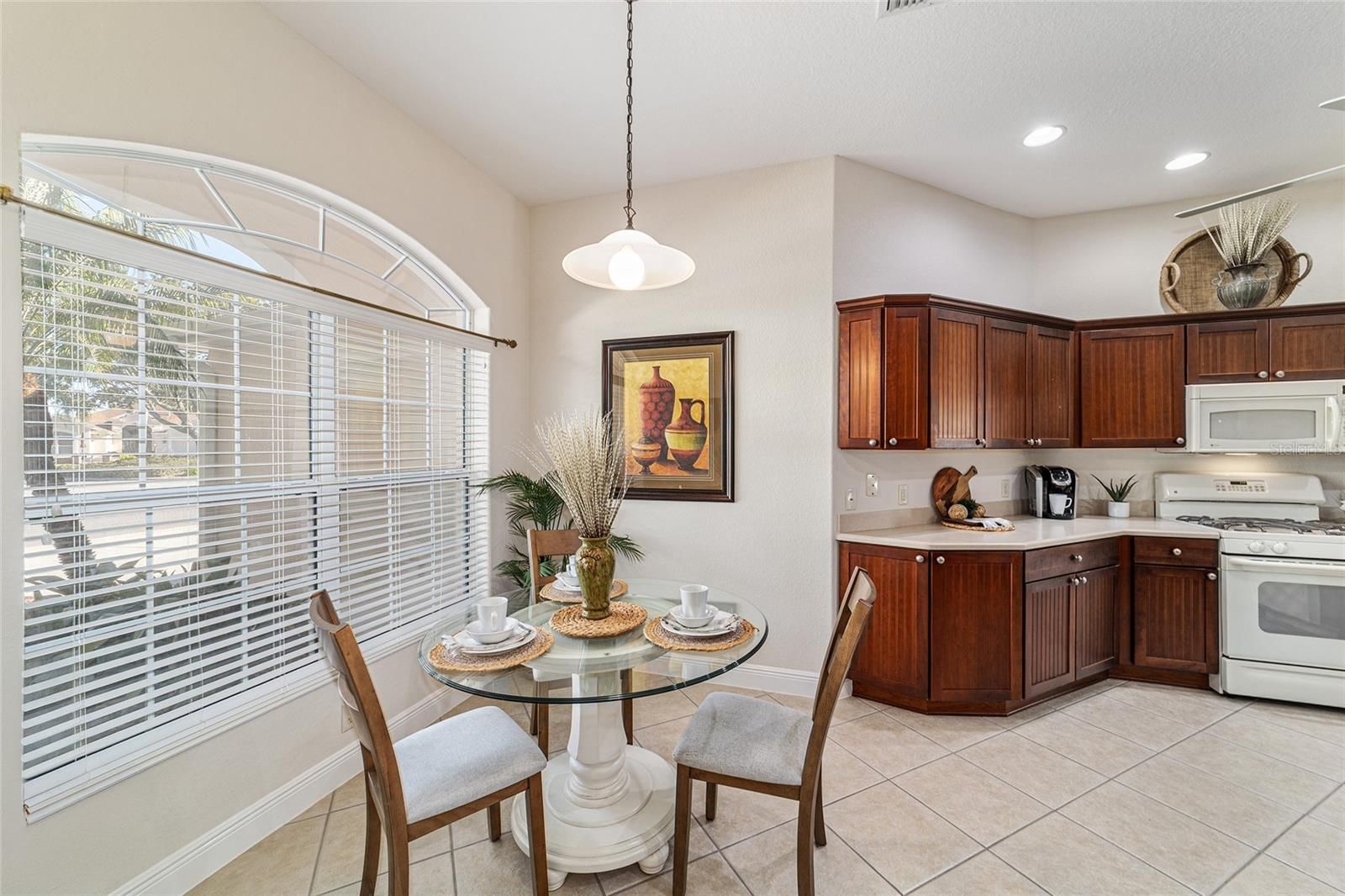 One or more photo(s) has been virtually staged. Welcome to your private retreat in the Village of Largo within The Villages, where elevated design meets effortless Florida living. This beautifully appointed 3-bedroom, 2-bath modified Gardenia model offers a bright, open-concept floorplan ideal for both entertaining and everyday comfort. Spacious living and dining areas flow seamlessly into the heart of the home, creating an inviting atmosphere filled with natural light. With easy care flooring throughout the home, the open floorplan provides plenty of room for everyone. The dining area is perfect for both formal and informal dining, and the breakfast area will allow you to start your days with plenty of light as you enjoy your morning coffee. The kitchen has beautiful wood cabinets, Corian countertops, and lots of storage! This 3 bedroom 2 bath home offers a convenient split bedroom layout, and the generously sized bedrooms provide peaceful retreats for guests, hobbies, or a home office. The primary suite is thoughtfully designed for relaxation and privacy. Enjoy the luxury of two walk-in master closets, offering exceptional storage and organization, and an en-suite bathroom with a large walk in shower, as well as separate vanity areas. Surrounded by swaying palm trees, this home captures the essence of resort-style living—where mornings are tranquil, afternoons are active, and evenings are best spent unwinding in comfort on your oversized lanai, with privacy landscaping surrounding the back of the home. Located within one of the country’s most sought-after 55+ communities, residents enjoy access to world-class amenities, recreation, dining, and entertainment. This is more than a home—it’s a lifestyle defined by comfort, elegance, and ease.