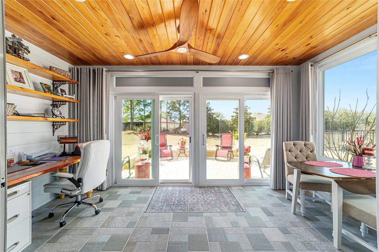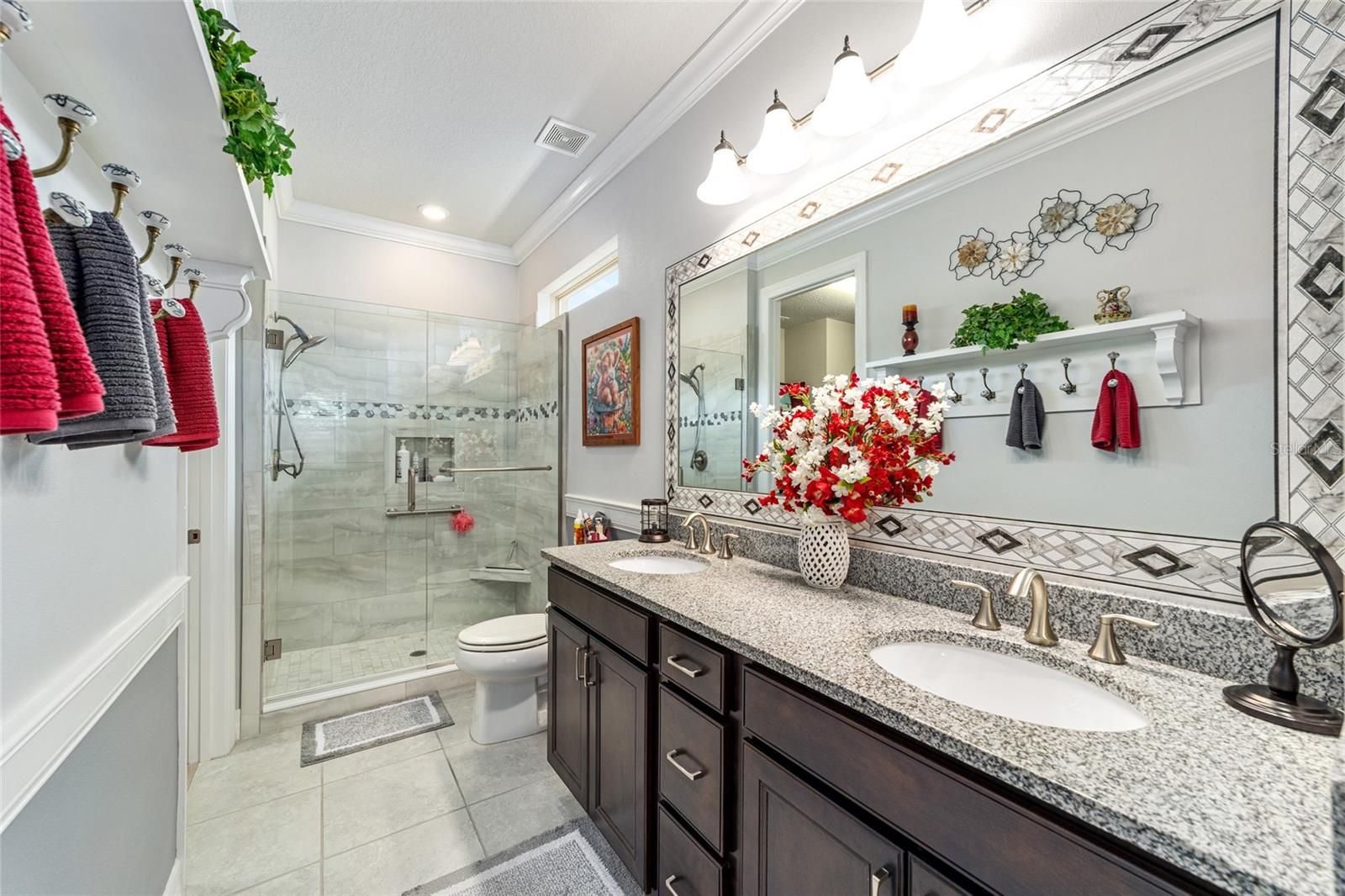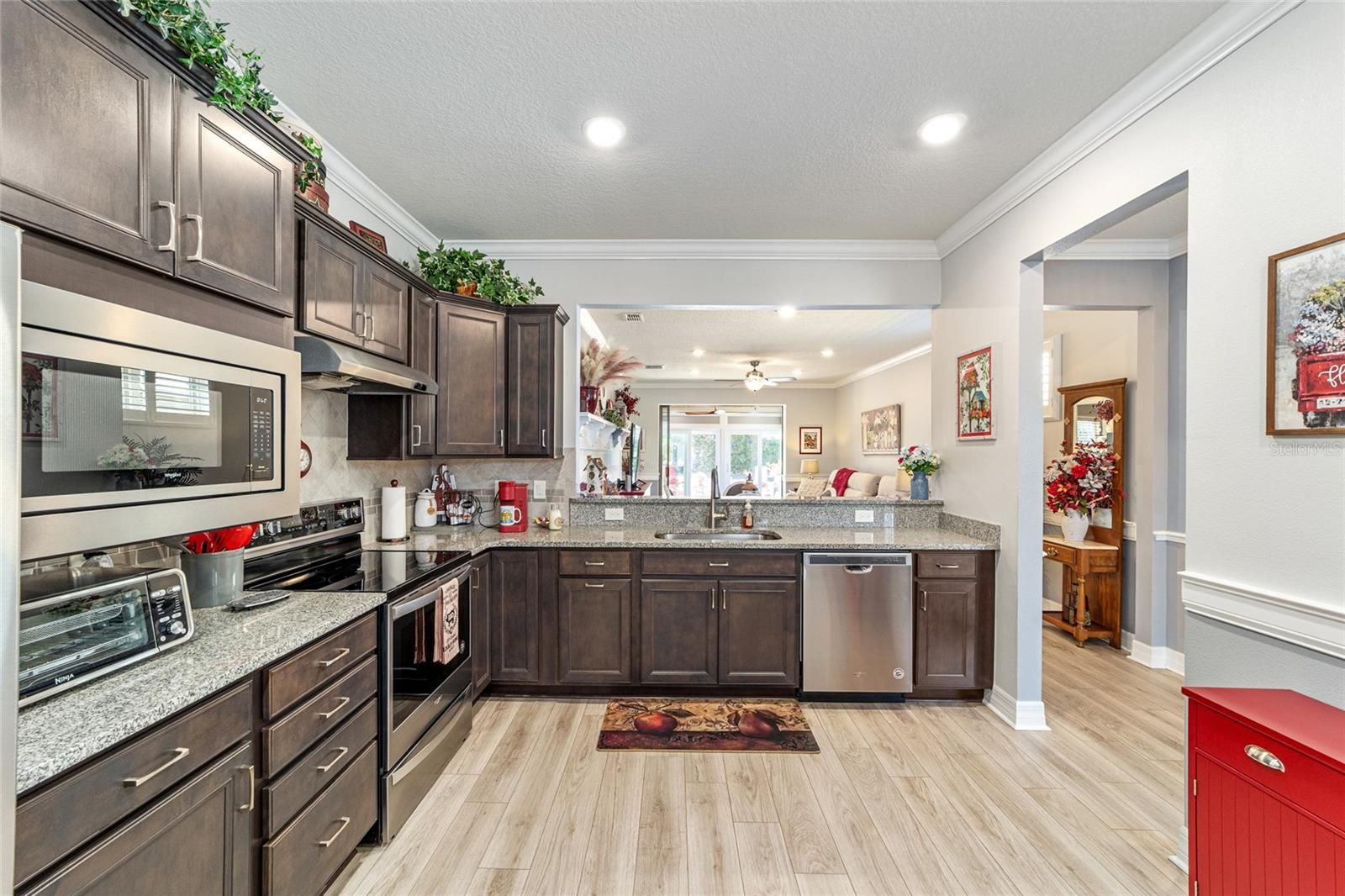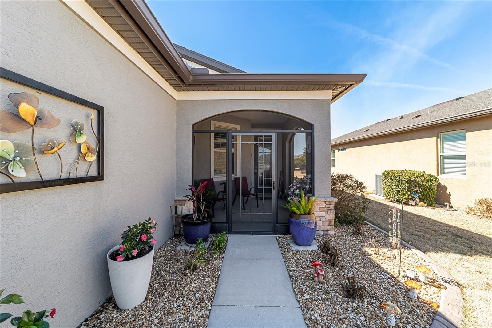 Stop scraping windshields and start savoring sunset strolls, clubhouse cocktails, and warm Florida winters in this beautiful Del Webb Stone Creek community. As the furniture is negotiable, this home can be move-in-ready, giving you more time to level up your lifestyle now, escape, and enjoy life a little more. Set your tee times, schedule your pickleball matches, and let life move to the relaxed rhythm of North Central Florida’s year-round outdoor living. This stunning Noir Coast 2/2 model with an extended garage is thoughtfully upgraded and filled with custom touches throughout. From the moment you arrive, mature landscaping, stone accents, and a screened front porch create an impressive sense of arrival. Step inside and you’re welcomed by upgraded details like a custom shiplap accented wall, luxury vinyl plank flooring, elegant trim details, upgraded baseboards, crown molding, and additional recessed lighting that elevate the entire space. The kitchen is beautifully appointed with granite countertops, tiled backsplash, Flagstone Gray cabinetry with added height, upgraded stainless steel appliances, and a large single-bowl sink that blends style and function effortlessly. Both bathrooms feature granite countertops, brushed nickel finishes, comfort-height cabinetry, and the primary suite has a fully remodeled shower and a dual vanity. What truly captures your attention upon entering is the light-filled great room, where expansive sliding glass doors draw your eyes outward to a beautifully enclosed sunroom. Beyond, a charming paver patio with a Sunsetter electric awning offers the perfect shaded retreat for morning coffee or afternoon gatherings. Surrounded by mature landscaping, the backyard provides a peaceful, private setting ideal for both relaxation and entertaining. Beyond the beauty of the home itself lies one of Ocala’s most sought-after resort-style communities — where days are filled with laughter, dancing, friendly game time, and meaningful connections. Endless activities, vibrant amenities, and a warm, welcoming atmosphere make every day feel like a getaway. This isn’t simply a home you’re choosing — it’s a lifestyle that feels like vacation living, where you can slow down, explore more, and soak in continuous sunshine and breathtaking sunsets. This isn’t just a community, it’s your next chapter — beautifully reimagined.
