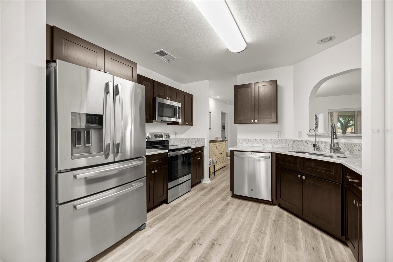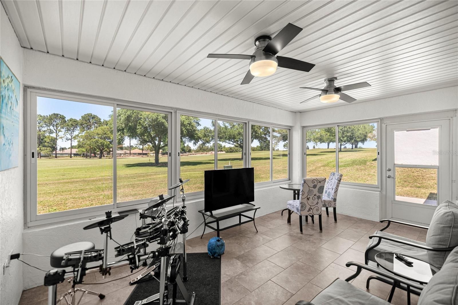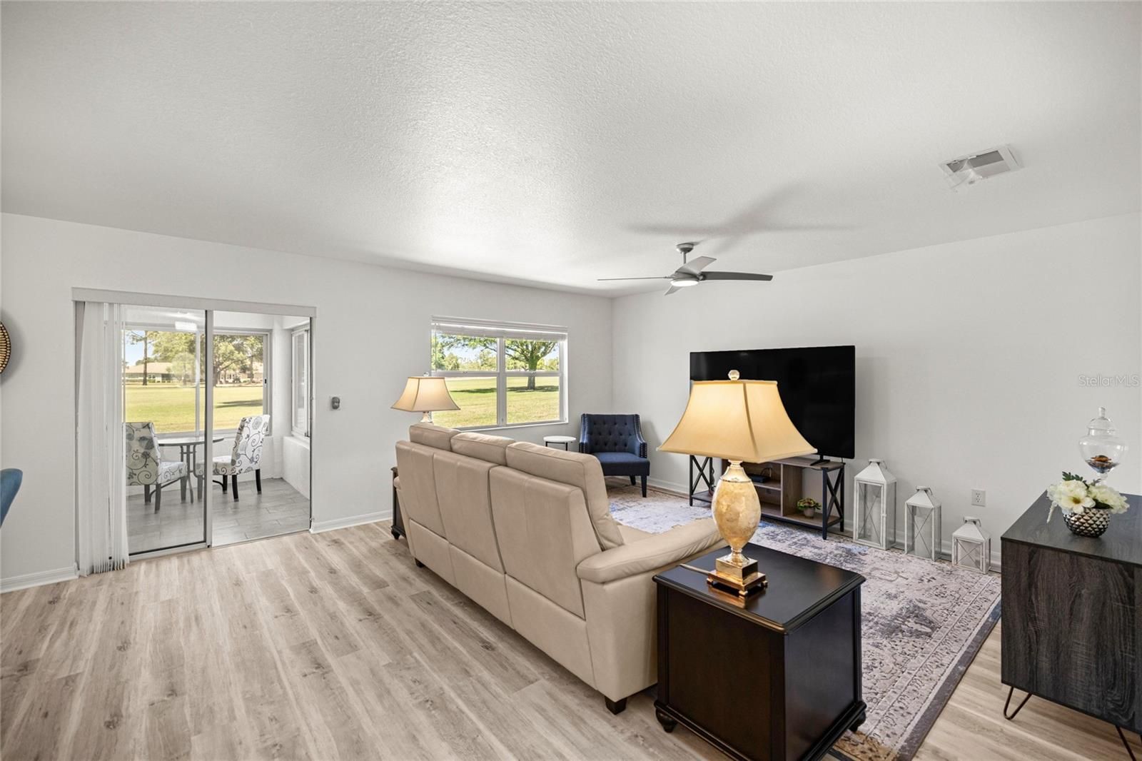 GOLF COURSE VIEW! We welcome you to view this stunning Wyngate model home, ideally located on the third hole of The Links Golf Course on a tree-lined street in the desirable Crescent Green neighborhood. Breathtaking views of the golf course can be seen throughout much of the house. The home features a charming front porch, luxury vinyl plank flooring throughout, neutral interior paint and a new roof installed in 2021. The expansive great room and dining room offer open concept living and flows seamlessly into the enclosed lanai. The split floor plan includes a spacious master suite with two generous walk-in closets. The master bathroom boasts dual vanities with quartz countertops, a large step-in shower and a linen closet. The updated kitchen is equipped with modern cabinetry, quartz countertops, stainless steel appliances, a reverse osmosis system and a cozy breakfast nook. Located in On Top of the World, Ocala’s premier gated 55+ community. Residents enjoy world-class amenities and golf cart access to nearby shopping, dining, and medical facilities. Plus, you’ll be just a short drive from the renowned World Equestrian Center. Schedule your private tour today—please note, verbal offers will not be accepted.