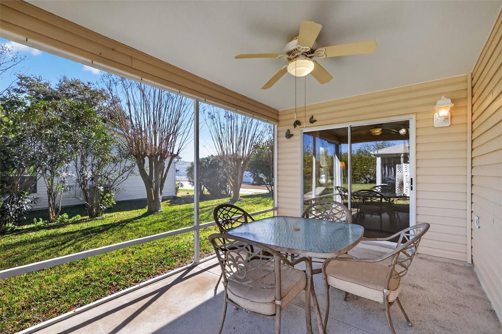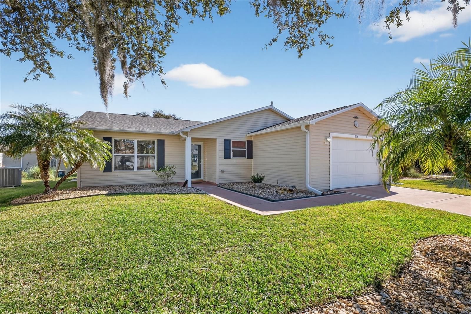 CHARMING 2/2 Laredo with OPEN-CONCEPT design, SPLIT FLOOR PLAN, and SCREENED LANAI—ideally located JUST MINUTES from Lake Sumter Landing and all the conveniences of County Road 466, including the new Costco, in the highly sought-after Village of Lynnhaven! LOW BOND of only $4,767.30! This inviting home welcomes you with MATURE landscaping, LOW-MAINTENANCE STONE planting beds, and DECORATIVELY PAINTED walkway and driveway. Step through the COVERED entry with storm door into a warm and welcoming foyer with a COAT CLOSET. The chef’s kitchen features WHITE cabinetry, NEUTRAL countertops, GAS cooking, a NEW microwave (9/2025), and a convenient EAT-IN breakfast bar. The OPEN LAYOUT seamlessly connects the kitchen, dining, and living areas, creating a bright, SPACIOUS, and airy main living space. Sliding glass doors from the living room lead to the screened lanai with ceiling fan and exterior access to the rear yard, which is enhanced by MATURE PRIVACY landscaping—perfect for grilling, relaxing, and enjoying Florida’s beautiful weather! The primary suite offers DOUBLE windows, a generous WALK-IN closet, and an en-suite bath with WHITE cabinetry, NEUTRAL countertops, and a RECENTLY UPDATED (2025) Carrara-style TILED WALK-IN shower, plus a LINEN closet. The SPLIT FLOOR PLAN provides excellent PRIVACY, with a guest bedroom or home office featuring DOUBLE windows and a built-in closet. The second bathroom offers a WHITE vanity, tub and shower combination and a LINEN closet. Completing the home is a spacious 18’ x 25’ garage with laundry area, shelving, and PLENTY of room for parking and storage! This move-in-ready home combines location, layout, and value—DON’T MISS IT! The village of Lynnhaven is conveniently located JUST MINUTES to Lake Sumter Landing and 466 with an ABUNDANCE of shops (including the NEW COSTCO), restaurants, banks, medical and much more! Close to Churchill Greens Executive Golf Course, Palmer Legends Country Club; Pimlico and Churchill Recreation Centers; multiple pools, golf, and pickle ball; PLEASE WATCH OUR WALKTHROUGH VIDEO OF THIS AMAZING HOME in a FANTASTIC LOCATION and call today!
