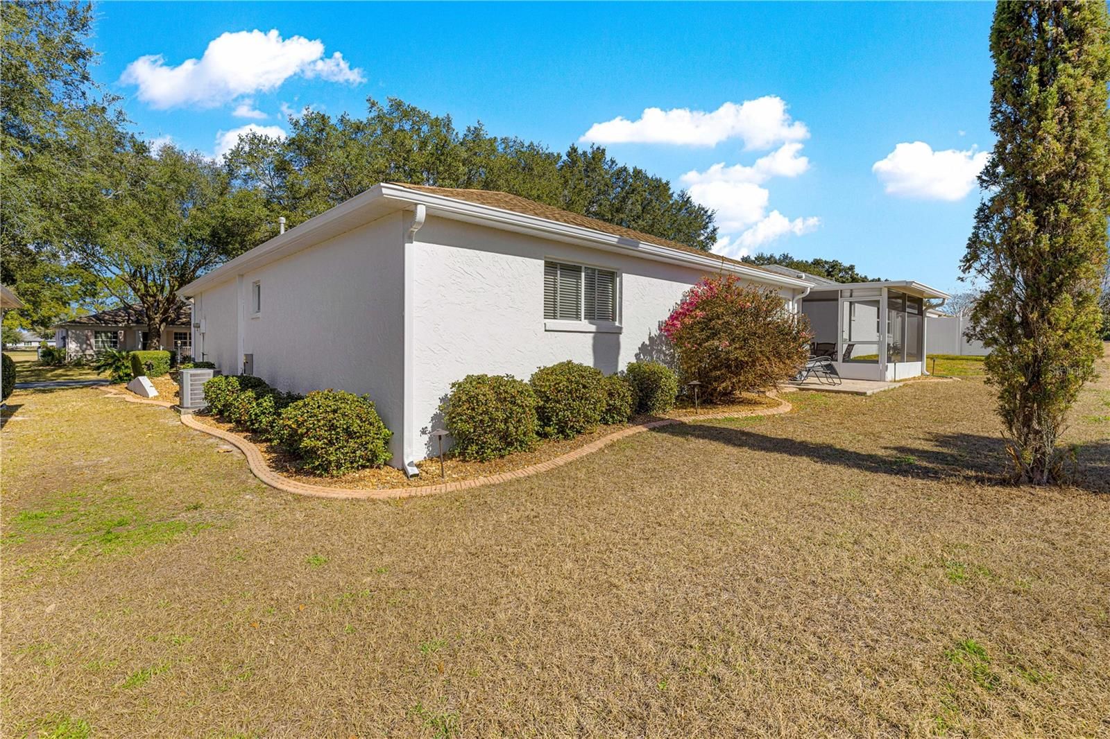 This Corinth II model home is in the much sought after 55+ neighborhood of On Top of the World in Crescent Ridge. As soon as you pull up you will notice the stacked stone hardscapes and mature landscaping along with an expanded driveway. Wood look laminate flooring in the main living areas and open space. The kitchen features wood cabinets, granite counters and stainless steel appliances with a gas range. The Florida room is open to the main living area giving you plenty of space to entertain and currently houses a built in desk. Bathrooms have LVP, new beautiful vanities and updated showers. The primary bedroom is generously sized with his and her walk in closets. There's a screen room and a concrete pad in the back for a grill. A split floor plan with plenty of space and it's move in ready! Roof and HVAC replaced in 2020. GOLF CART included. Don't miss your opportunity to see this home!