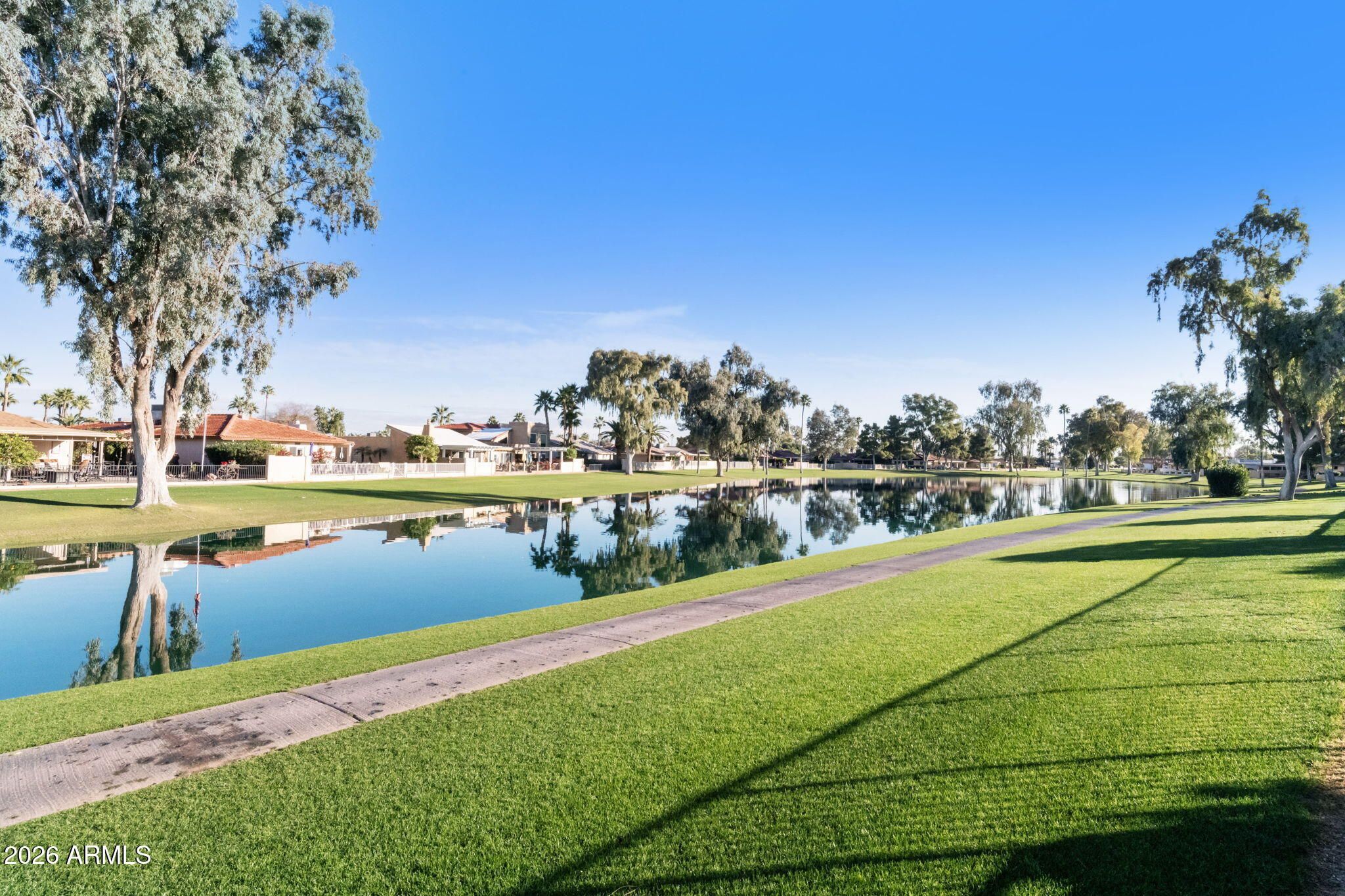 Expanded, immaculately maintained 2BR, 2BA Shawnee model on a serene lake in the highly desirable active adult community of Cottonwood at Sun Lakes. Freshly painted with great curb appeal and covered front entry patio for morning coffee. Great room with bonus addition, wet bar and patio access. Kitchen with tastefully painted cabinets, newer SS appliances and a charming breakfast nook. Large primary suite with dual sinks and updated tile walk-in shower with grab bars. Guest suite with ensuite bath. Peaceful lake views from the covered patio in the mature backyard with fruit trees and new SS fence. New garage door and opener, flat roof recoated in 2025, new landscape lighting and updated drip system. Don't miss your shot at this one and start enjoying the many Cottonwood amenities SEE MORE with golf, tennis, pickleball, countless clubs, restaurants, fitness and so much more!