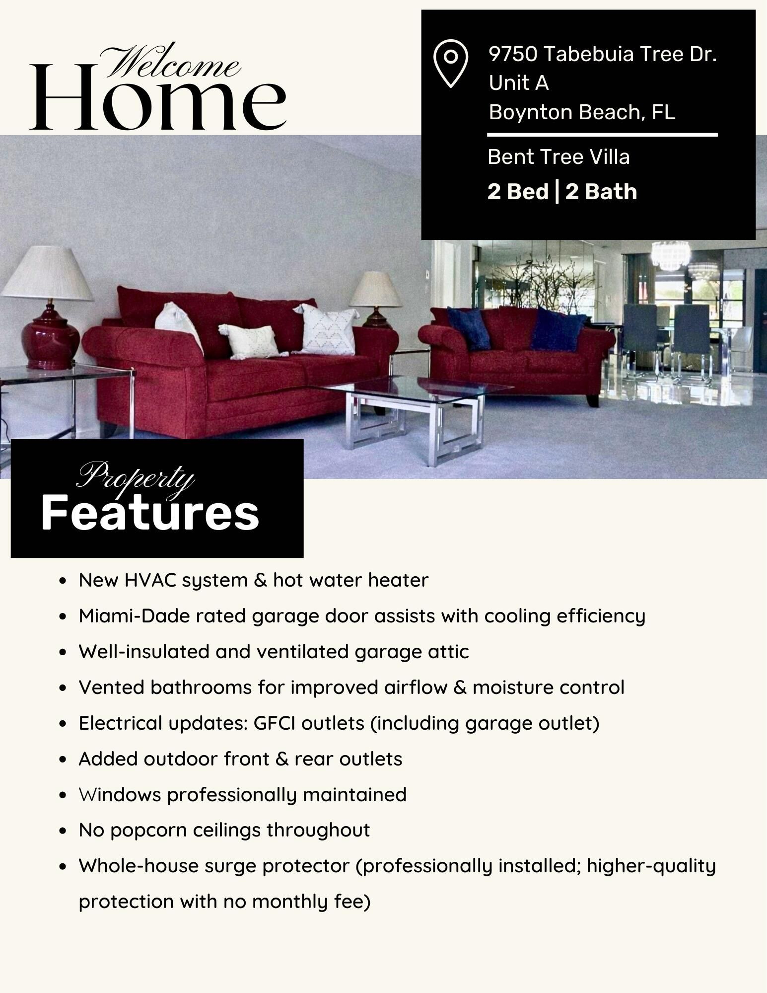 This Bent Tree single story villa is located on a corner lot, has great natural light, plenty of living space, and outdoor area with an open green space view. Features of note: New HVAC system & hot water heater, electrical updates, no popcorn ceilings, and a Miami-Dade rated garage door that assists with cooling efficiency. Bent Tree Villas 55+ community amenities include a pool and clubhouse surrounded by beautifully kept common areas. Whether you're seeking a primary residence or a seasonal retreat, this home delivers comfort and convenience in a desirable location. What sets this villa apart? Thoughtful updates throughout that add to your daily comfort including a well-insulated and ventilated garage attic, vented bathrooms, electrical GFCI outlets, handy outdoor front & rear outlets, professionally maintained windows, and a whole-house surge protector.