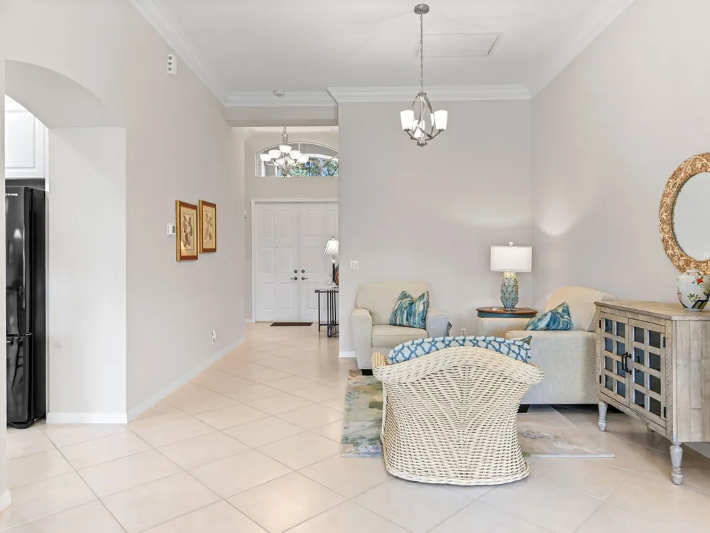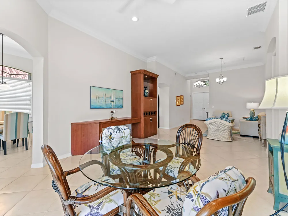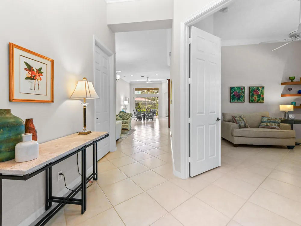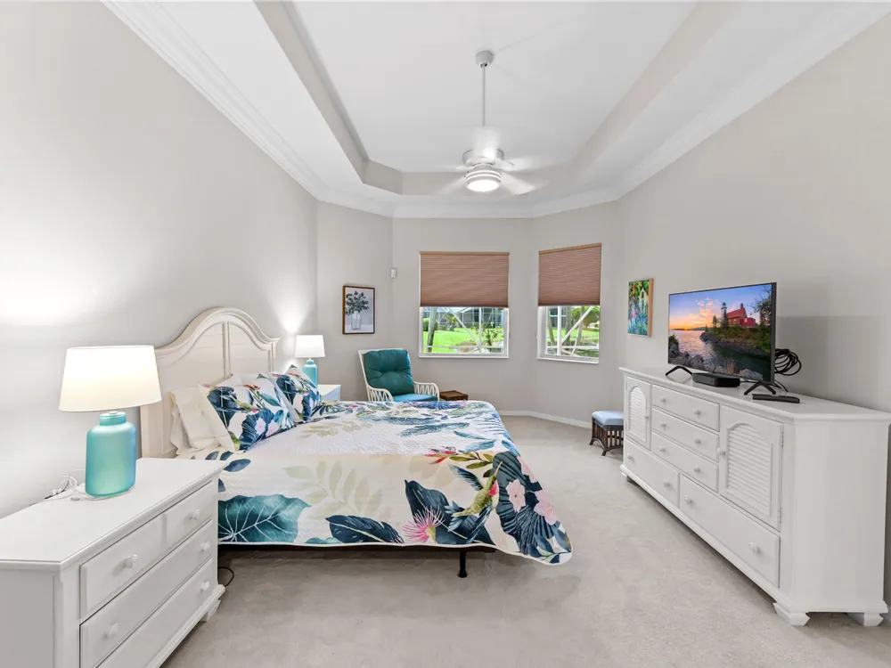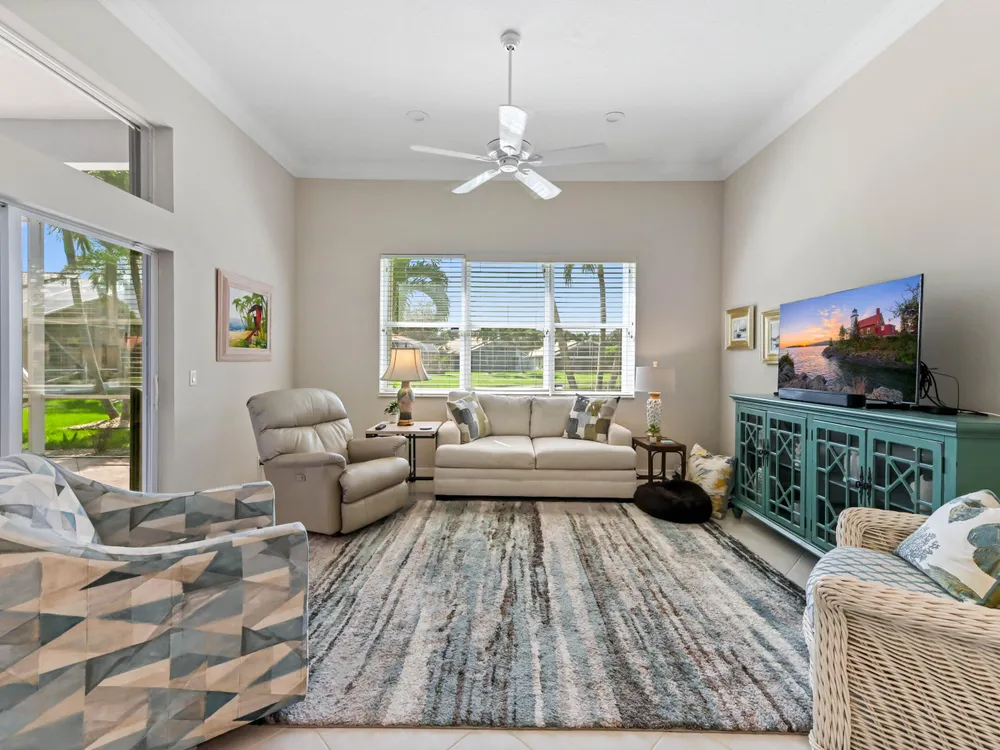 This beautiful residence offers the epitome of the Bellaggio lifestyle, combining modern comfort with stunning water views!Prepare to be captivated by the picturesque, south-facing lake views from this meticulously maintained Novara model. Boasting over 2,000 square feet of air-conditioned living space, this spacious home is bathed in natural light and features high ceilings complemented by elegant crown molding throughout. The entire interior is painted in a light, neutral color, offering a fresh, bright, and move-in-ready feel. Adding to its appeal, the main living areas feature beautiful tile flooring laid on the diagonal, enhancing the expansive, open design.